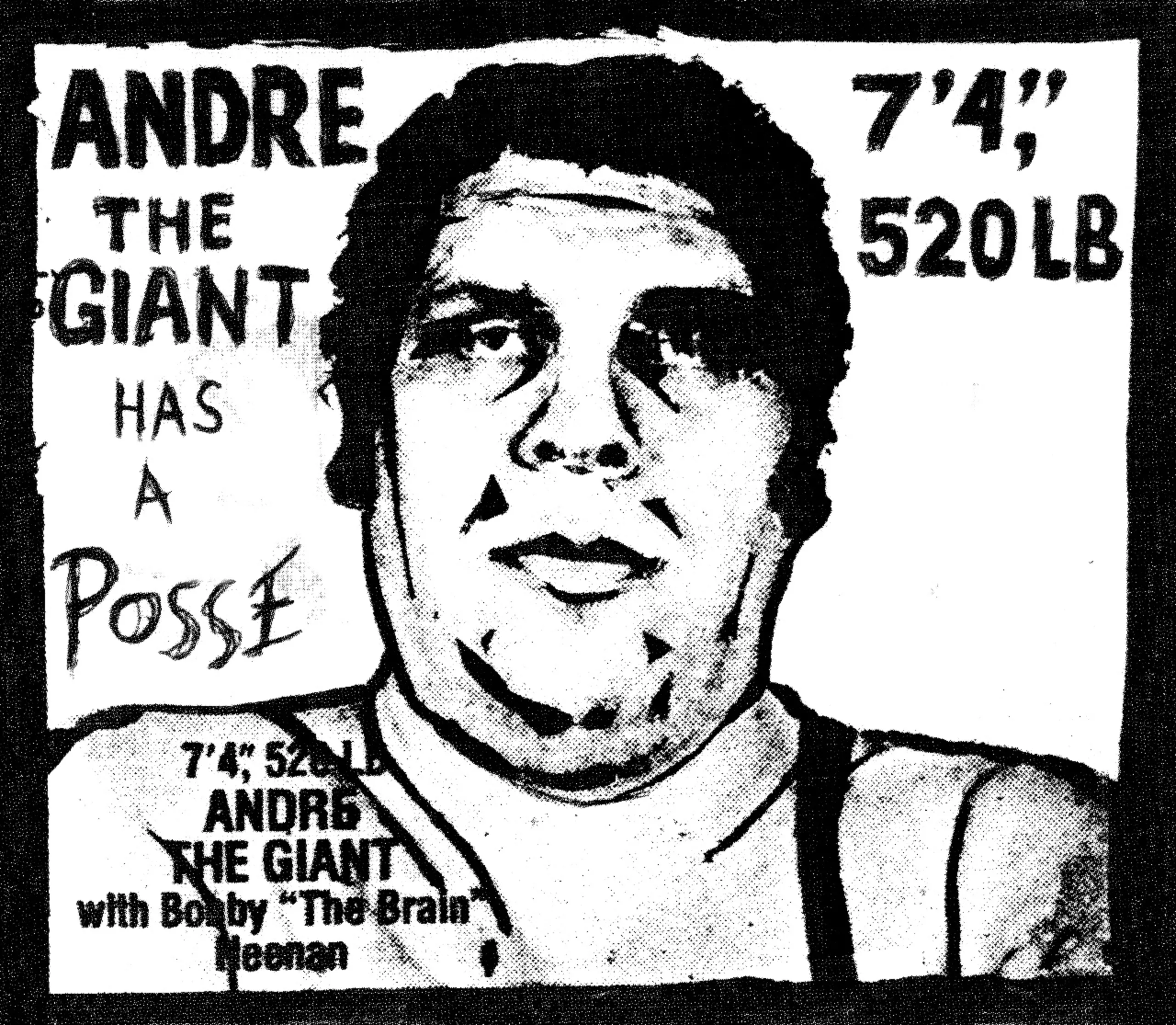 À l’époque, la police condamne sévèrement le graffiti à New York, apparu une dizaine d’années auparavant. Mais l’interdiction de ce mouvement underground produit tout l’effet inverse : le street-art s’intensifie et gagne les autres villes américaines, en toute illégalité bien sûr. Tout aussi illégalement, Shepard Fairey et sa bande d’amis skateurs, alors à la Rhode Island School of Design, produisent des milliers de stickers à l’effigie du géant Andre Roussimoff. Plus connu par le doux nom d’Andre -ou 8e merveille du monde- ses 2m14 et 235 kilos viennent de chuter sur un ring de catch pour la première fois depuis 15 ans. Comme une trainée de bombe en spray, ces stickers font le tour des Etats-Unis, et deviennent le nouvel étendard de la culture underground jusque dans les années 90. Distribués sous le manteau et collés un peu partout dans la ville, on y voit le visage d’Andre avec le texte : « Andre the Giant has a Posse » (André le géant a une bande de potes). Qui le colle affirme alors appartenir à cette bande.