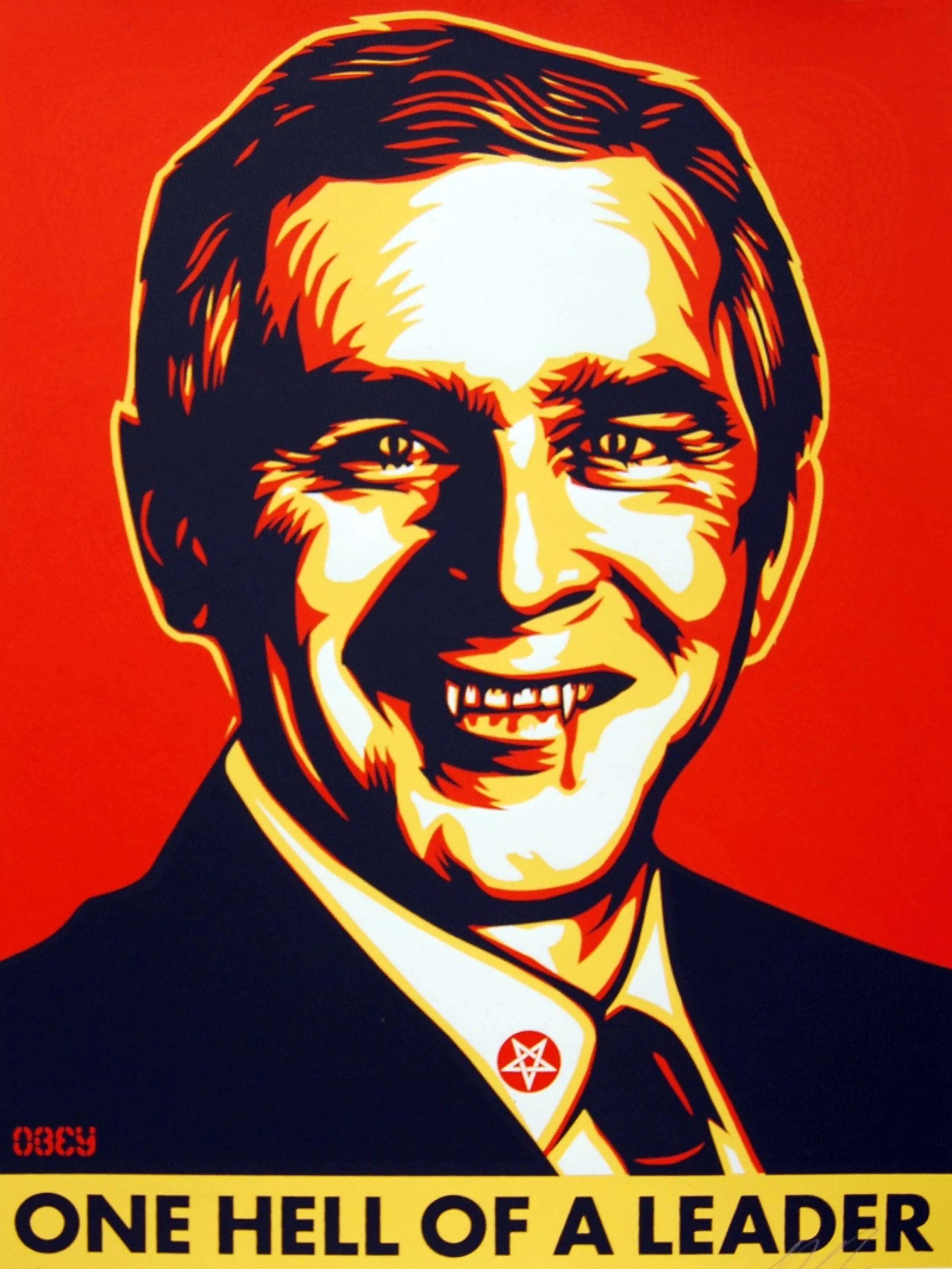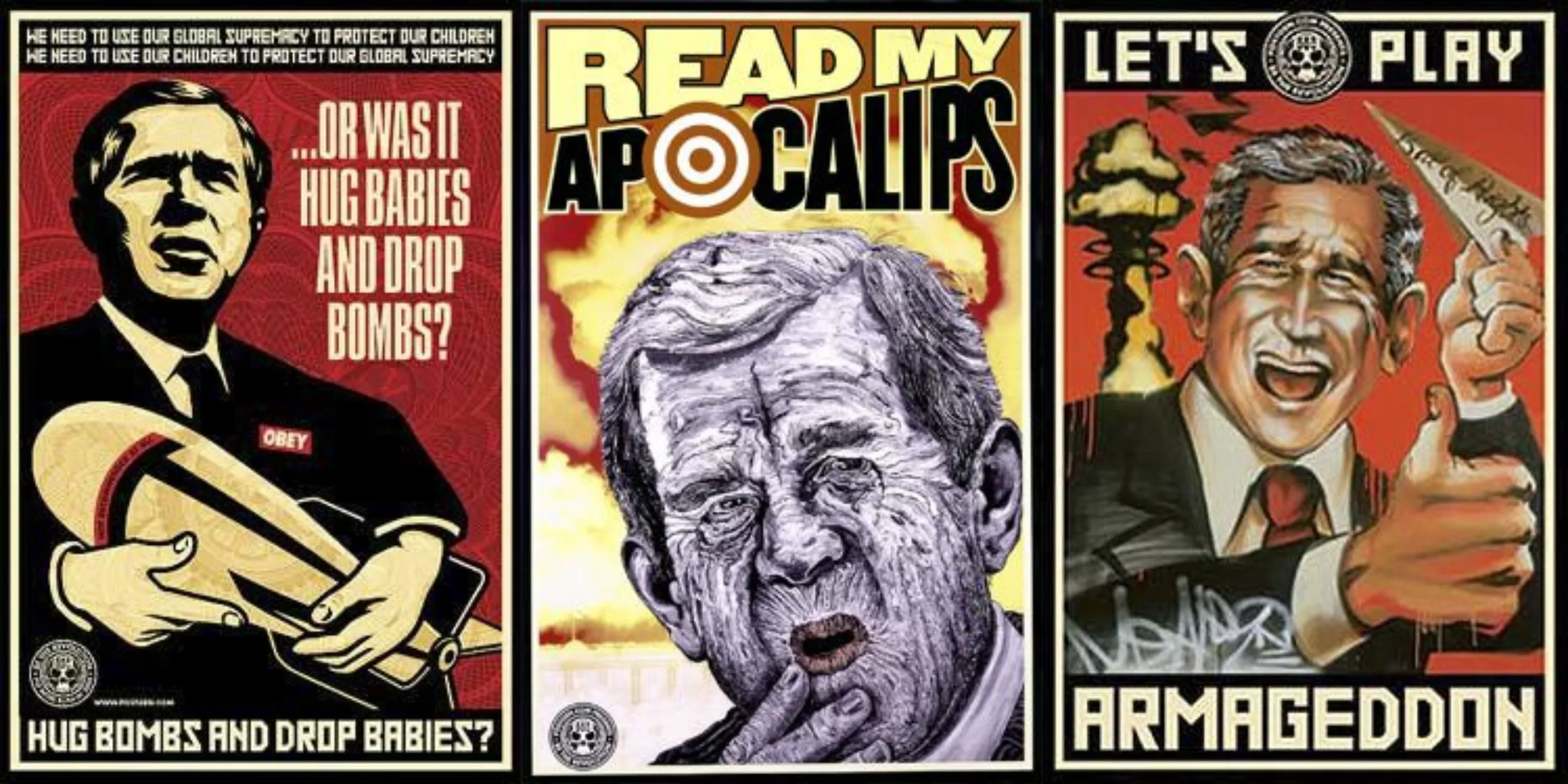 En attendant la gloire qui arrivera quatre ans plus tard en 2008, Shepard Fairey s’attèle, avec ses potos du collectif Post Gen, à créer une campagne anti-guerre et anti-Bush, à grand coup d’affiches inspirées du pop art de Warhol, des slogans de Kruger, du design constructiviste Russe ou des affiches de propagande Chinoise. Fairey, Conal et One unissent leurs talents de guérilleros artistiques et engagés -entre sérigraphie, caricatures et murs peints- et « Be the Revolution » fait grand bruit. Sur le poster de gauche on peut lire “nous devons utiliser notre suprématie mondiale pour protéger nos enfants / nous devons utiliser nos enfants pour protéger notre suprématie mondiale” puis “câlinez les bombes et lâchez les bébés ?…ou câlinez les bébés et lâchez les bombes ?”