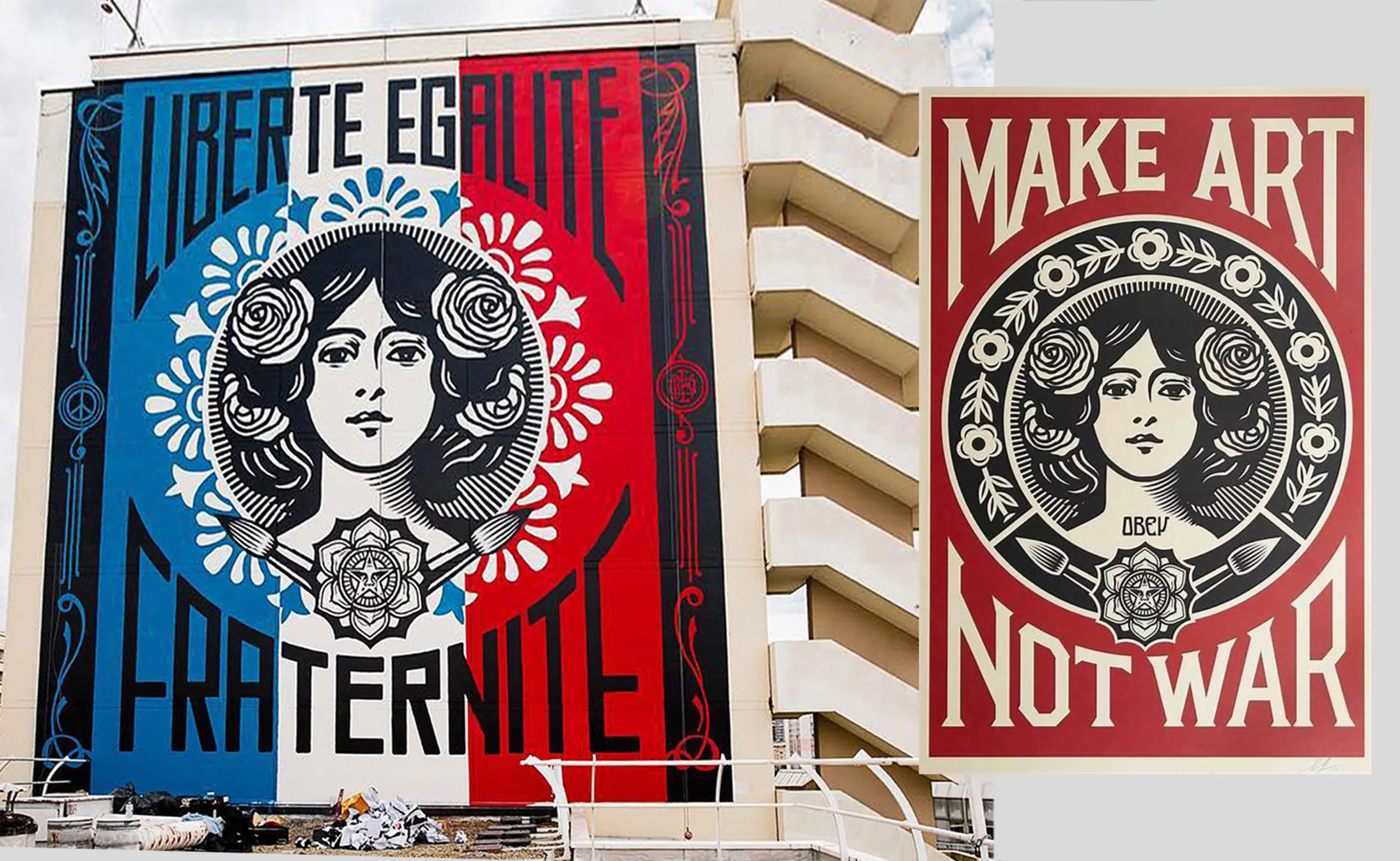 Par compassion après les attentats de Paris en 2015, Fairey réalise un poster de Marianne entourée des mots Liberté, égalité, fraternité. Le visage de la femme est tiré du visuel “make art, not war” (faites de l’art, pas la guerre) créé en 2014 à Berlin et détourné du slogan hippie “make love, not war”. Un an plus tard, Shepard Fairey réalise une fresque géante de ce poster sur un mur de Paris et en offre un poster au président Macron. La fresque sera vandalisée avec des larmes rouges et le slogan “Marianne pleure”.