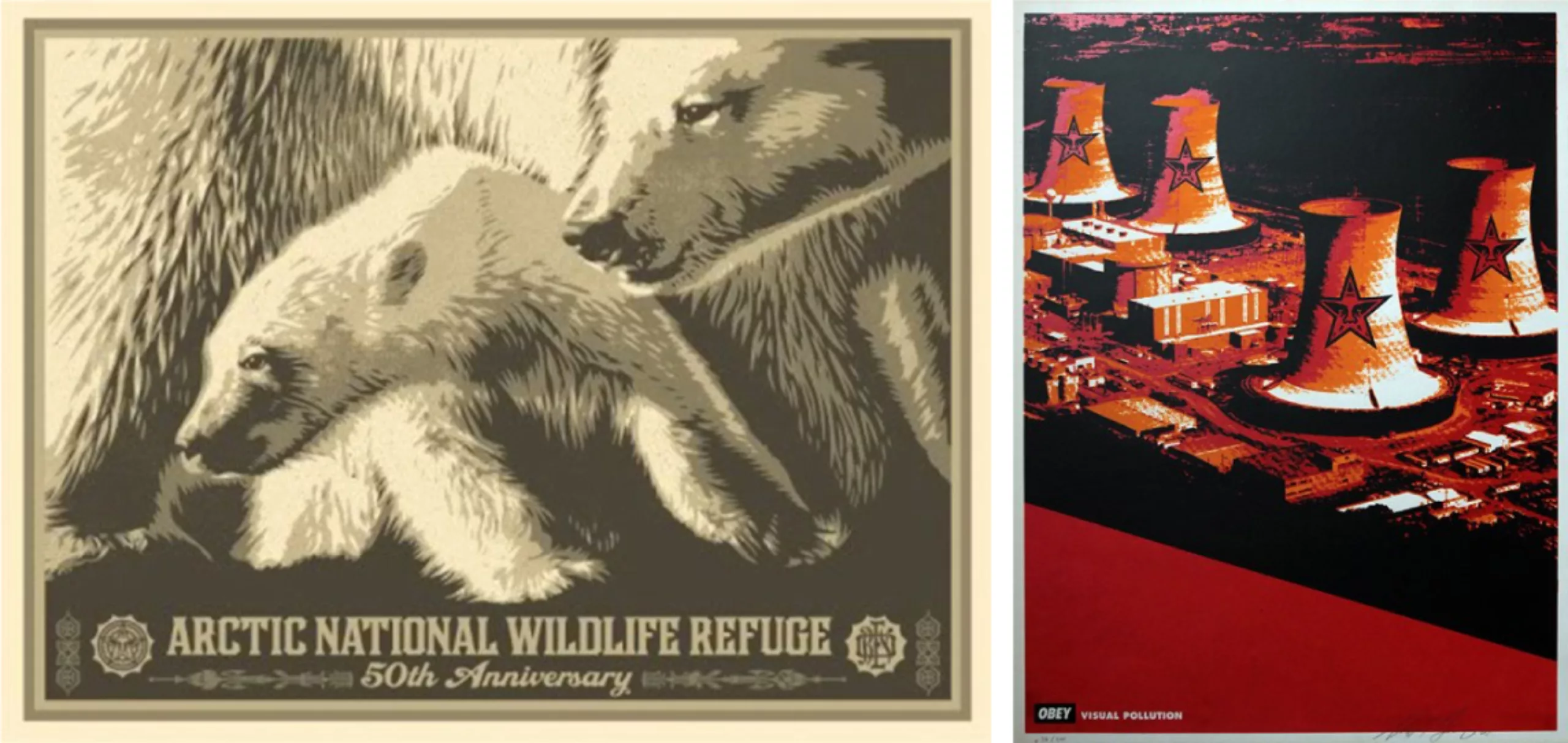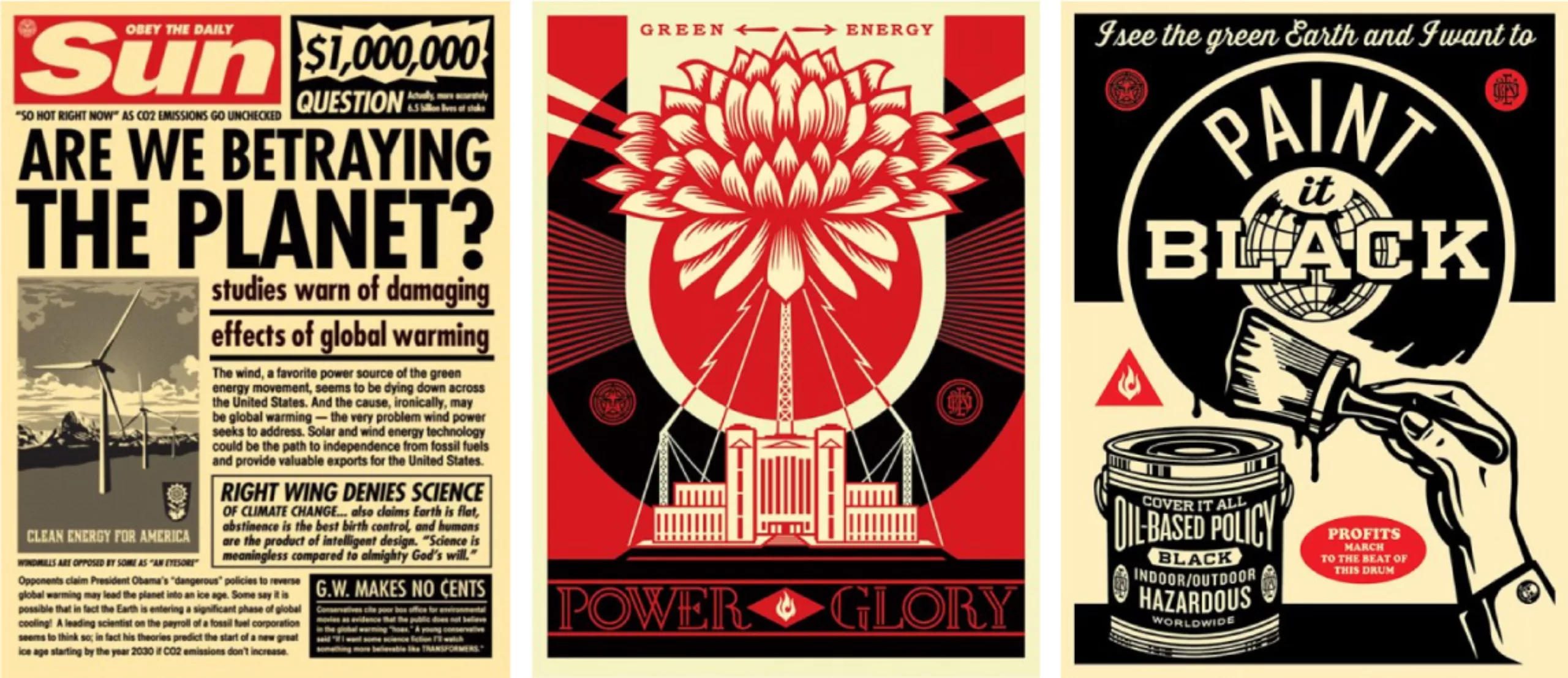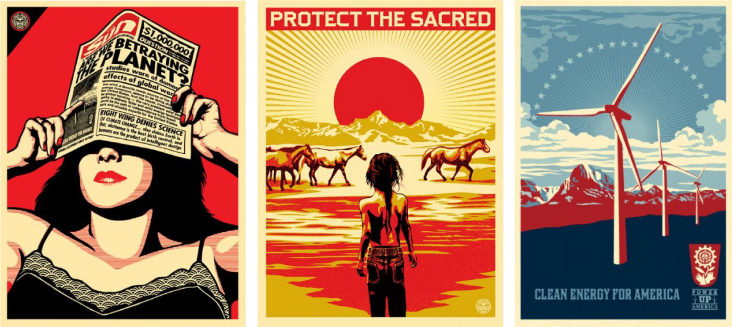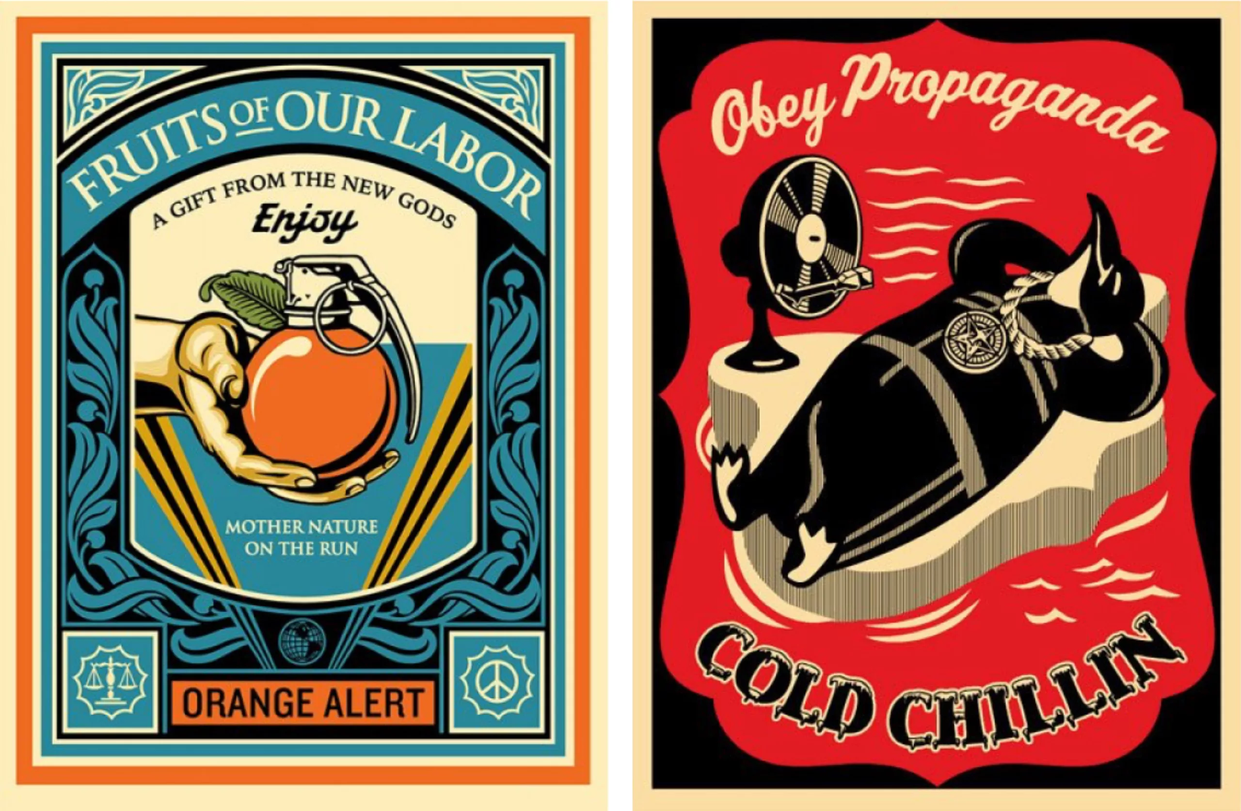 Résolument engagé, Shepard touche à tous les sujets qui le titillent : écologie, économie, capitalisme, droit des minorités, guerres… et son art activiste lui permet de rebondir régulièrement sur l’actualité. Sa devise : agir tout de suite, regretter plus tard. Comme l’écrivait Noam Chomsky, “la propagande est à a démocratie ce que la matraque est à l’état totalitaire”. Les oeuvres qu’il propose se basent sur des icônes picturales issues de personnalités, d’affiches cultes ou du pop art, et, ainsi détournées, en deviennent de nouvelles. Largement diffusées, avec le même martellement et les mêmes codes, elles remplissent l’espace public comme de la propagande pour défendre non plus l’industrie, les milices ou les nations, mais la liberté de pensée et l’autonomie.