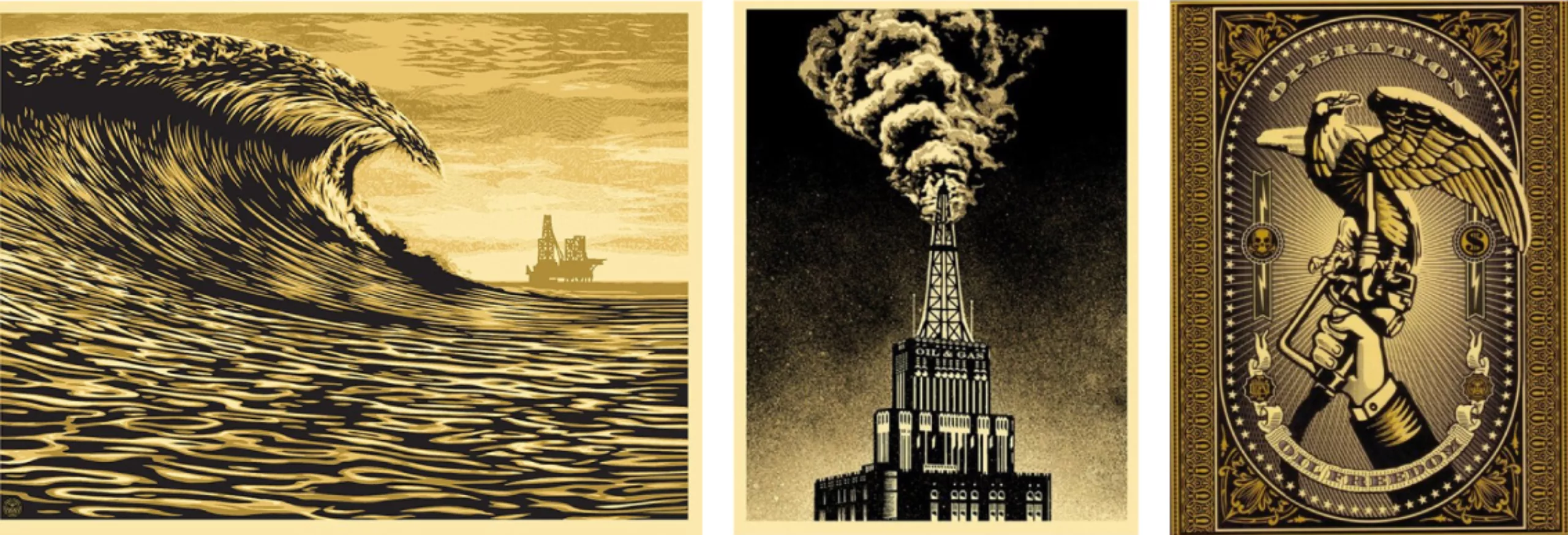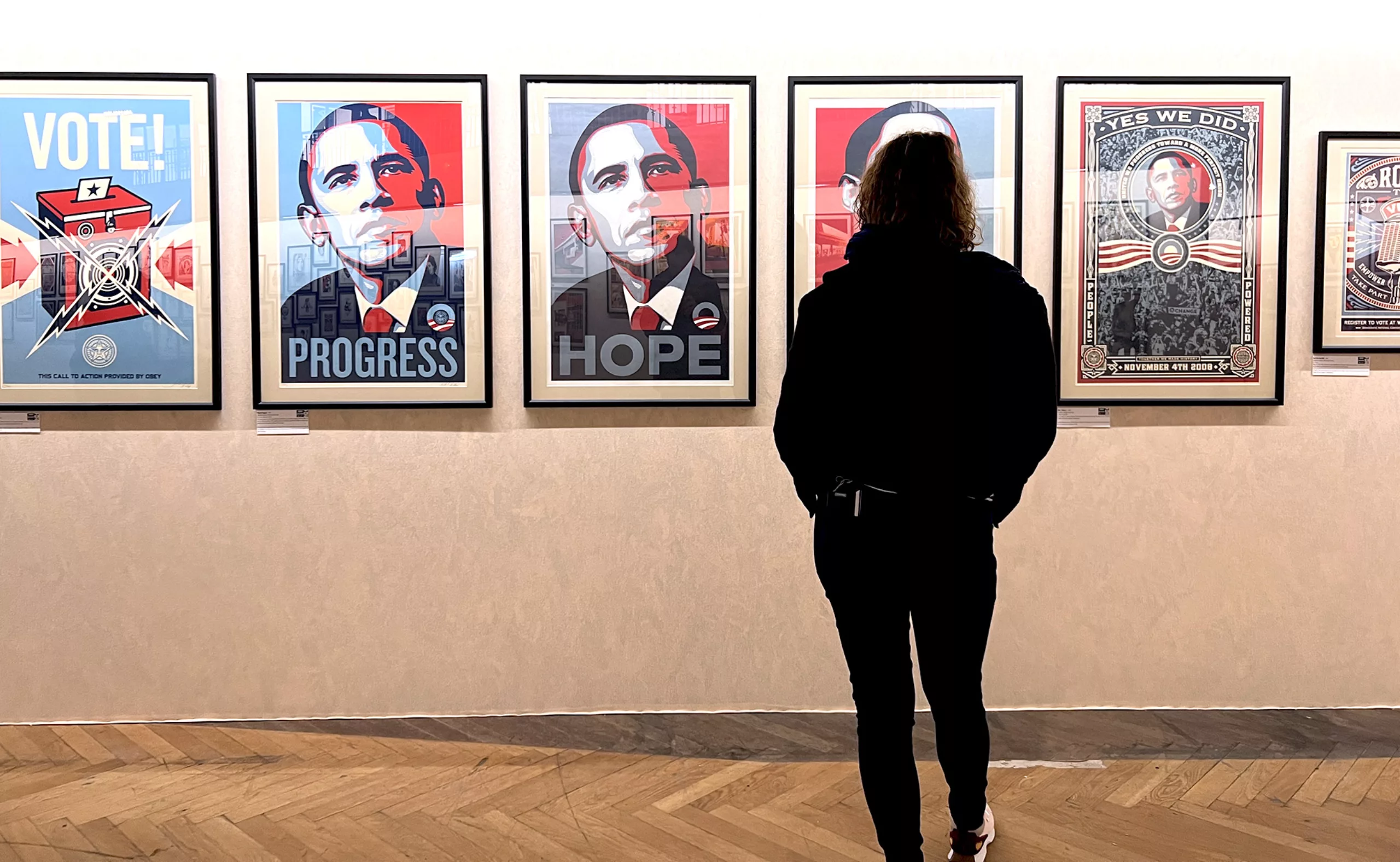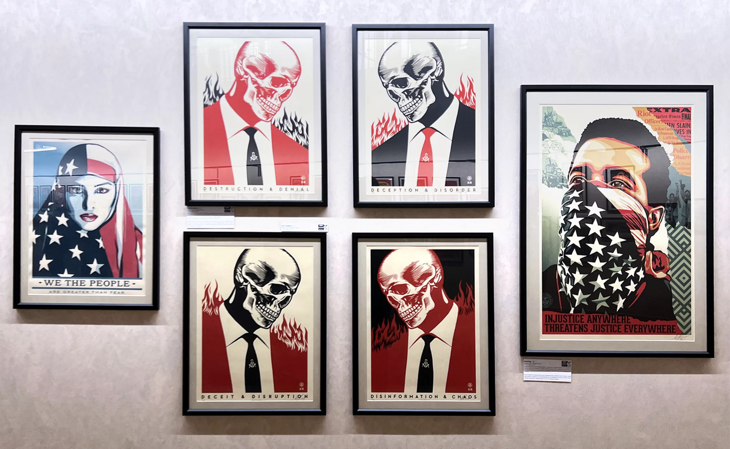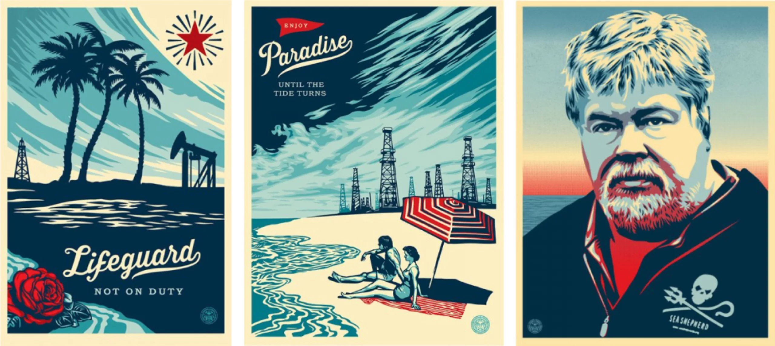 Résolument engagé, Shepard touche à tous les sujets qui le titillent : écologie, économie, capitalisme, droit des minorités, guerres… et son art activiste lui permet de rebondir régulièrement sur l’actualité. Sa devise : agir tout de suite, regretter plus tard. Comme l’écrivait Noam Chomsky, “la propagande est à a démocratie ce que la matraque est à l’état totalitaire”. Les oeuvres qu’il propose se basent sur des icônes picturales issues de personnalités, d’affiches cultes ou du pop art, et, ainsi détournées, en deviennent de nouvelles. Largement diffusées, avec le même martellement et les mêmes codes, elles remplissent l’espace public comme de la propagande pour défendre non plus l’industrie, les milices ou les nations, mais la liberté de pensée et l’autonomie.