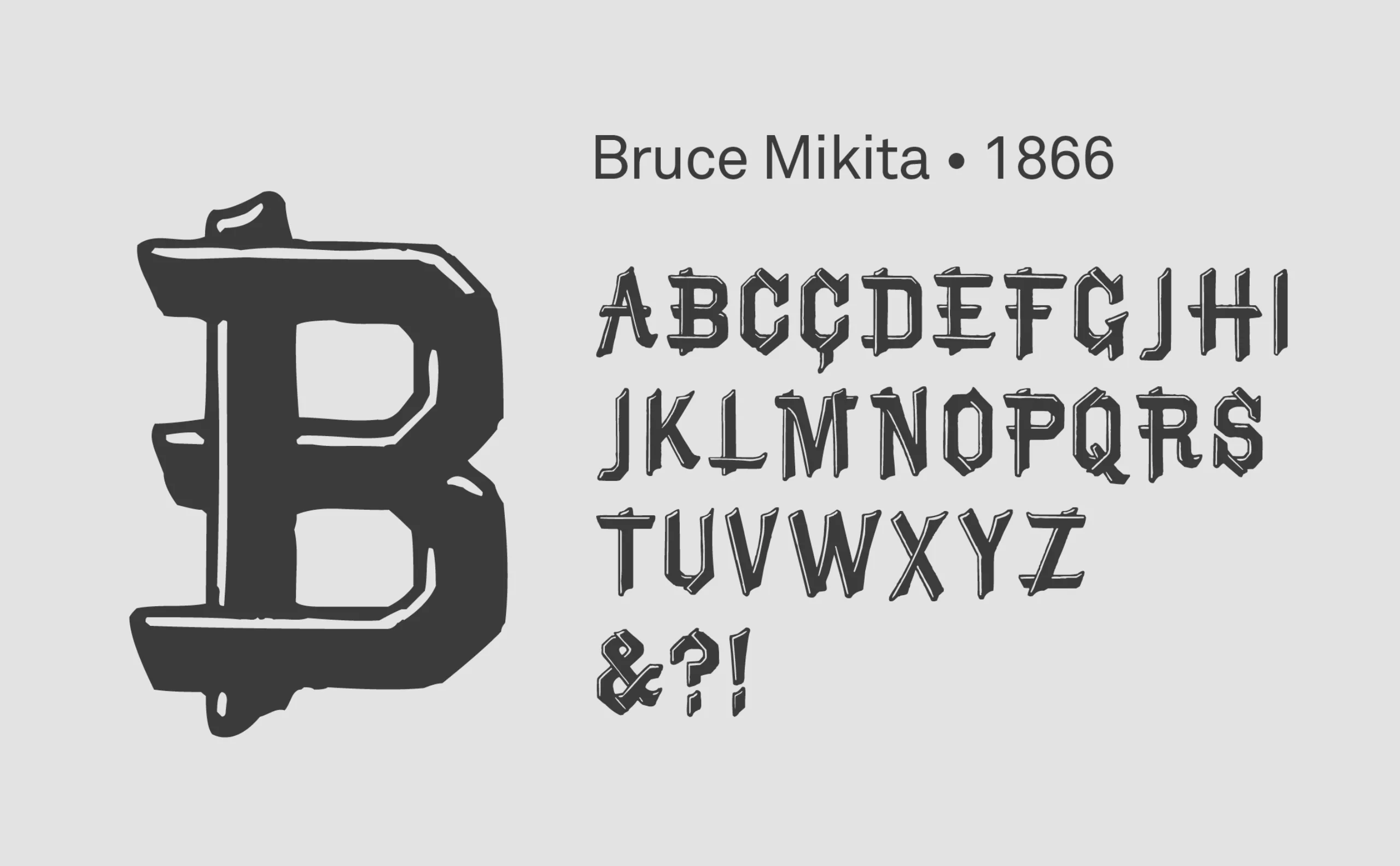 C’est le cas de la Rustic Ornamented Shaded, première stéréotypographie connue à ce jour, dessinée en 1866 dans la Fonderie Bruce Type. Figurant une superposition de morceaux de bois, elle est d’abord commercialisée sous le nom de Novel Open, et utilisée sur des papiers officiels, comme ci-dessous sur un document de la Phoenix Company daté du 1e janvier 1870. Elle devient ensuite Rustic Shaded en référence à son style rustique. Conçue comme typographie d’inspiration Victorienne, elle change à nouveau de nom dans les années 50 pour devenir Bruce Mikita, en référence au travail du bois Japonais, en vogue à l’époque. Son nom fait dès lors référence au Japon.