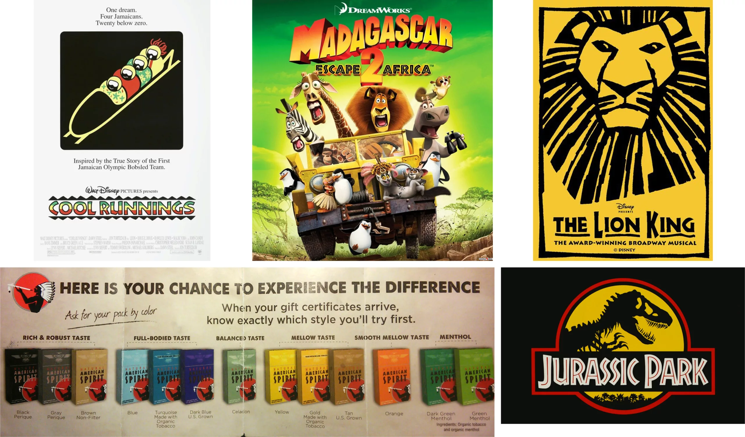 La Neuland, créée en 1923, est quand à elle connue aujourd’hui comme typographie « Africaine ». C’est la reine des stéréotypographies. Elle a été utilisée dès sa création sur des livres et affiches ayant une image exotique, liée à l’aventure, la jungle ou ayant une connotation ethnique… c’est dire les stéréotypes qu’elle englobe ! Neuland s’est pourtant fait une place à Hollywood dans les années 90 -avec plus ou moins de variations- sur les affiches du Roi Lion, Jurassic Park, Madagascar ou Rasta Rockett, et on la voit toujours sur les paquets de cigarettes American Spirit.