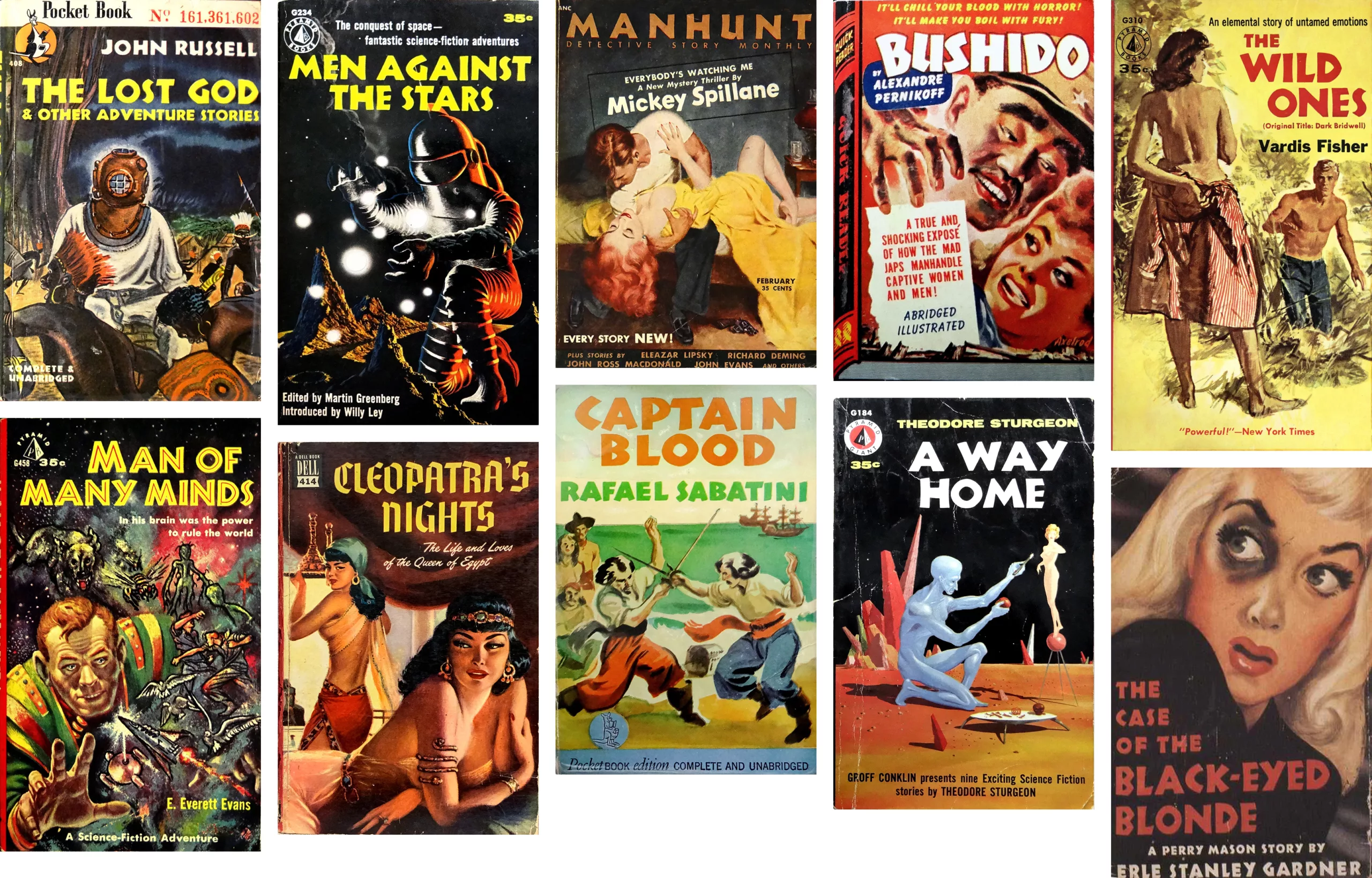 Petite parenthèse : preuve de la méconnaissance de la culture allemande aux États-Unis dans les années 50, on trouve même une couverture de paperback en lettres gothiques pour illustrer une histoire de Cléopâtre (cherchez l’intrus ci-dessous).