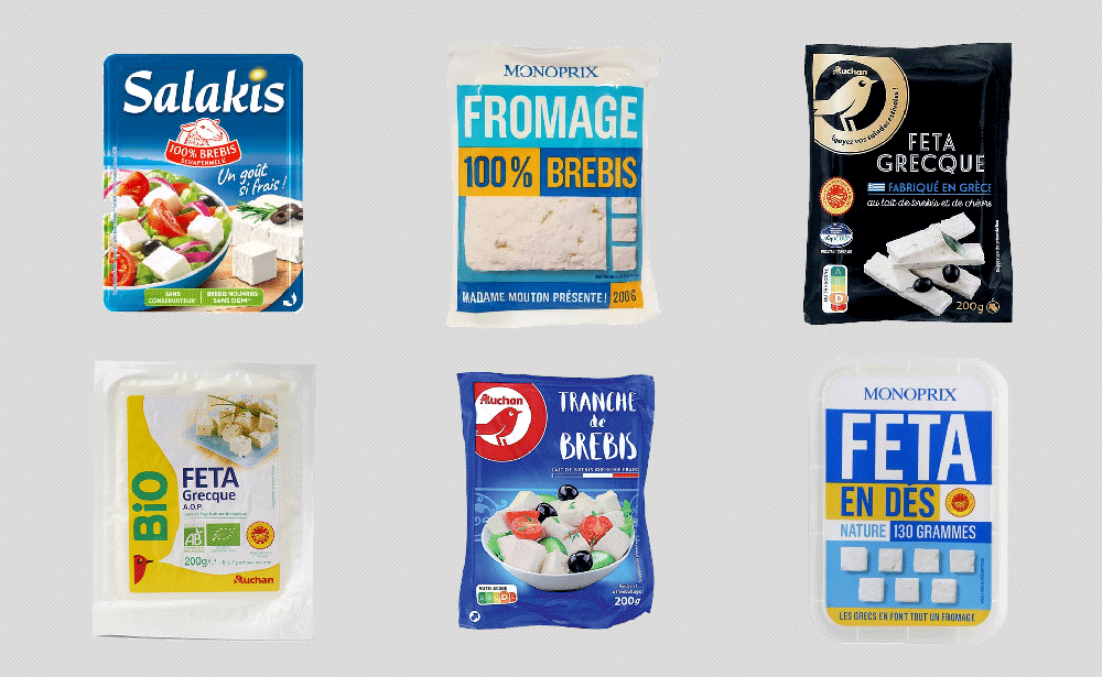 Si on analyse les produits ci-dessous, les véritables feta sont reconnaissables par l’insigne AOP européen orange et rouge, et le lait grec (parfois marqué d’un drapeau, parfois non). Le “fromage 100% brebis” de Monoprix, est préparé à base de lait de brebis Grecque mais n’a pourtant pas le droit à la mention Feta. Il s’en rapproche pourtant plus que Salakis ou les “tranches de brebis au lait français”, qui ne sont pas de la feta à proprement parler bien qu’elles utilisent sur leur packaging des images qui font penser à la Grèce : la mer ou un bleu profond, un nom à la consonance grecque, ou des motifs. C’est là que l’on voit l’utilité des labels sur des packagings et l’importance de la mention du territoire d’origine.