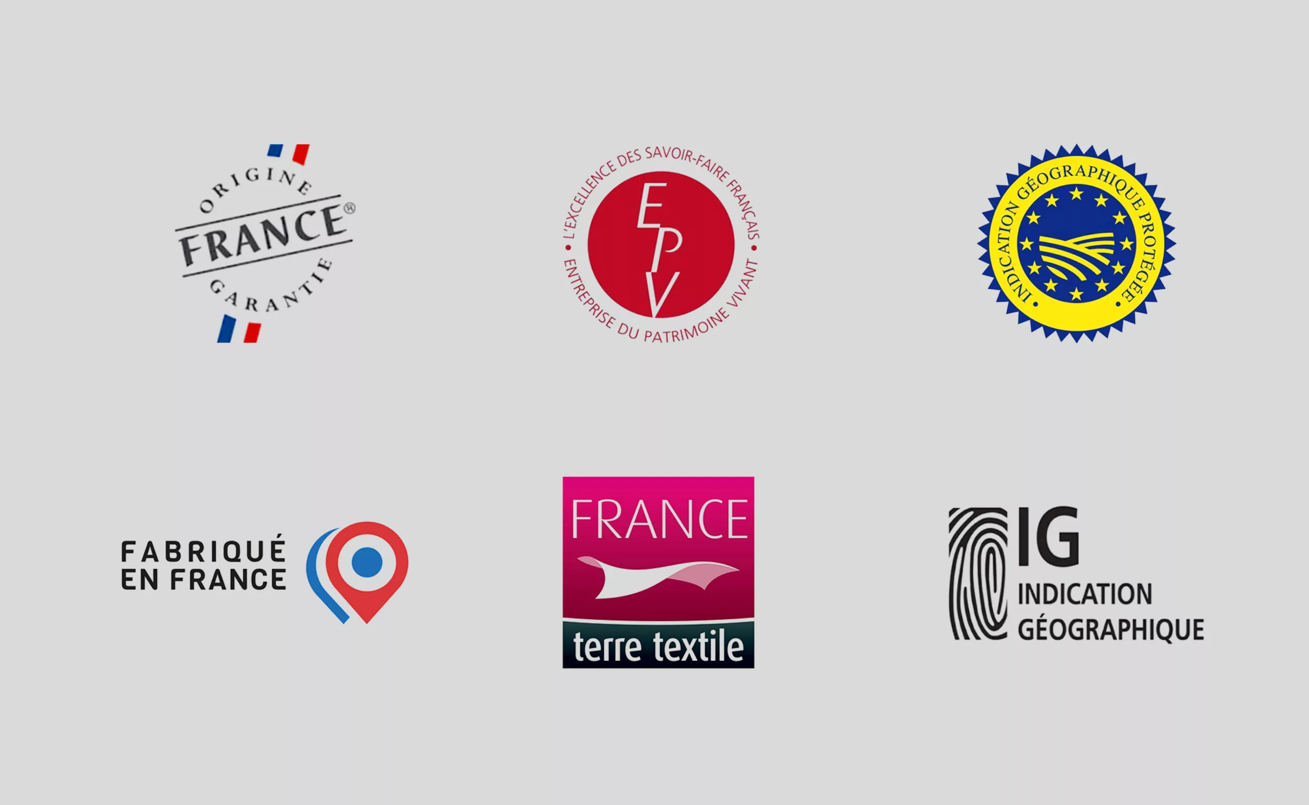 Pour des raisons évidentes d’image de marque et pour mettre en avant un savoir-faire, un territoire ou un produit particulier, les marques peuvent revendiquer leur appartenance à une origine. Pour utiliser le label made in France par exemple, la demande se fait auprès des douanes et exige qu’un certain nombre d’ingrédients minimum provienne de France pour les denrées alimentaires, ou que “la dernière transformation substantielle” soit réalisée en France. On peut ainsi faire produire du tissu et découper un vêtement au Portugal mais réaliser les dernières opérations en France, comme coudre des boutons, pour obtenir le label. Quand on sait que 3 français sur 4 sont prêts à payer plus cher pour un produit “made in France”, le jeu en vaut la chandelle. France Industrie a créé en 2021 un label officiel “fabriqué en France”, qui vient s’ajouter aux nombreuses autres marques existantes (en bas à gauche dans l’image ci-dessous).