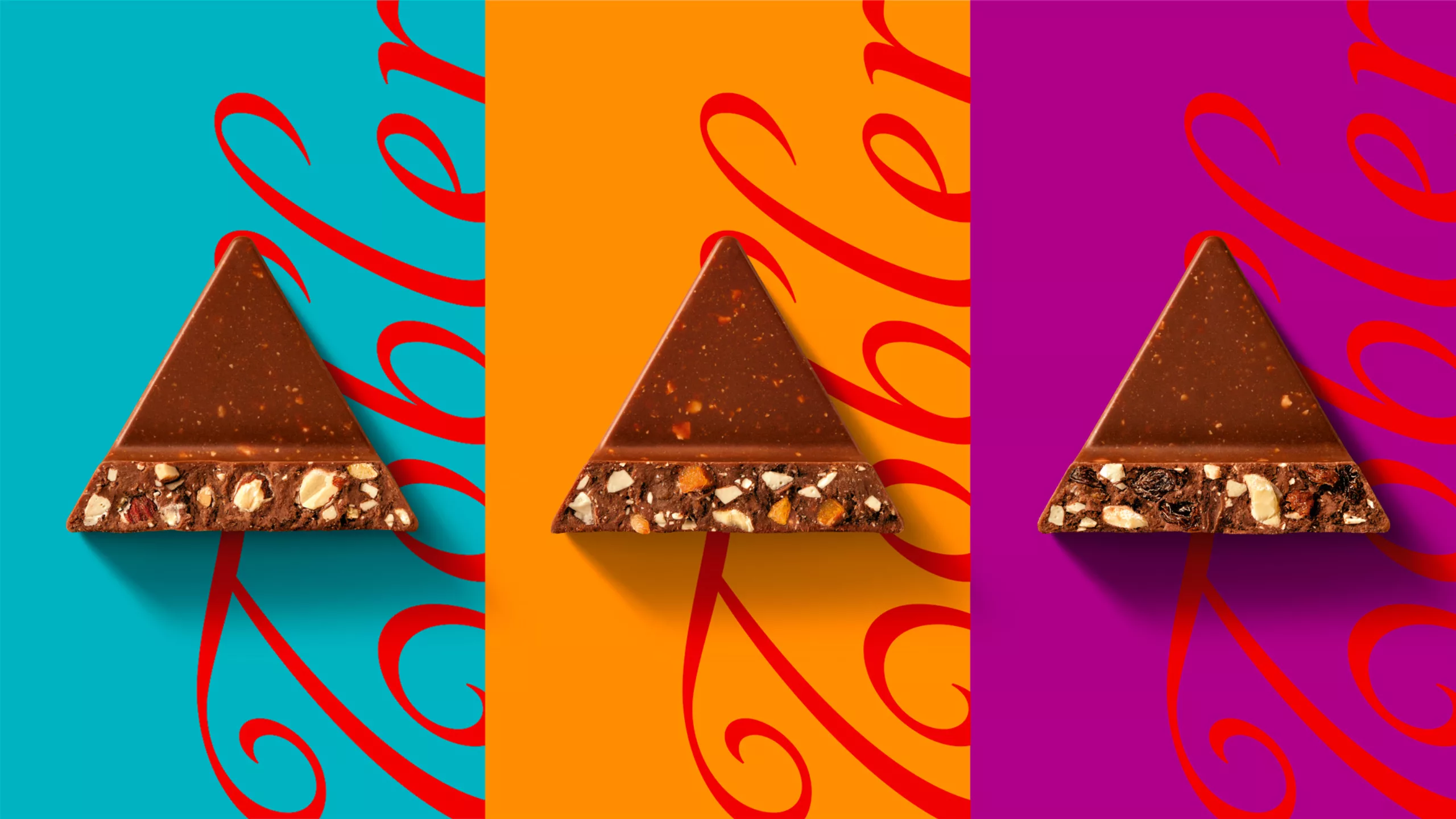 En 2022, Toblerone avait déjà procédé à un changement d’identité (cf les images ci-dessous) avec l’agence Bulletproof en redessinant ses lettres pour être plus fidèle au logo d’origine, et en mettant le triangle de chocolat en avant accompagné de nouveaux caractères typographiques manuscrits plus vintage comme une écriture “authentique” aux yeux du consommateur, une signature. Elle porte d’ailleurs le nom de son fondateur ; Tobler. On voit ici le travail typographique, avec des lettres plus pleines à l’allure gourmande et vintage, et la mise en avant du produit en gros plan. La nouvelle identité détourne l’attention d’un produit original et Suisse vers un produit gourmand et authentique, même s’il n’a plus rien à voir avec la Suisse !
