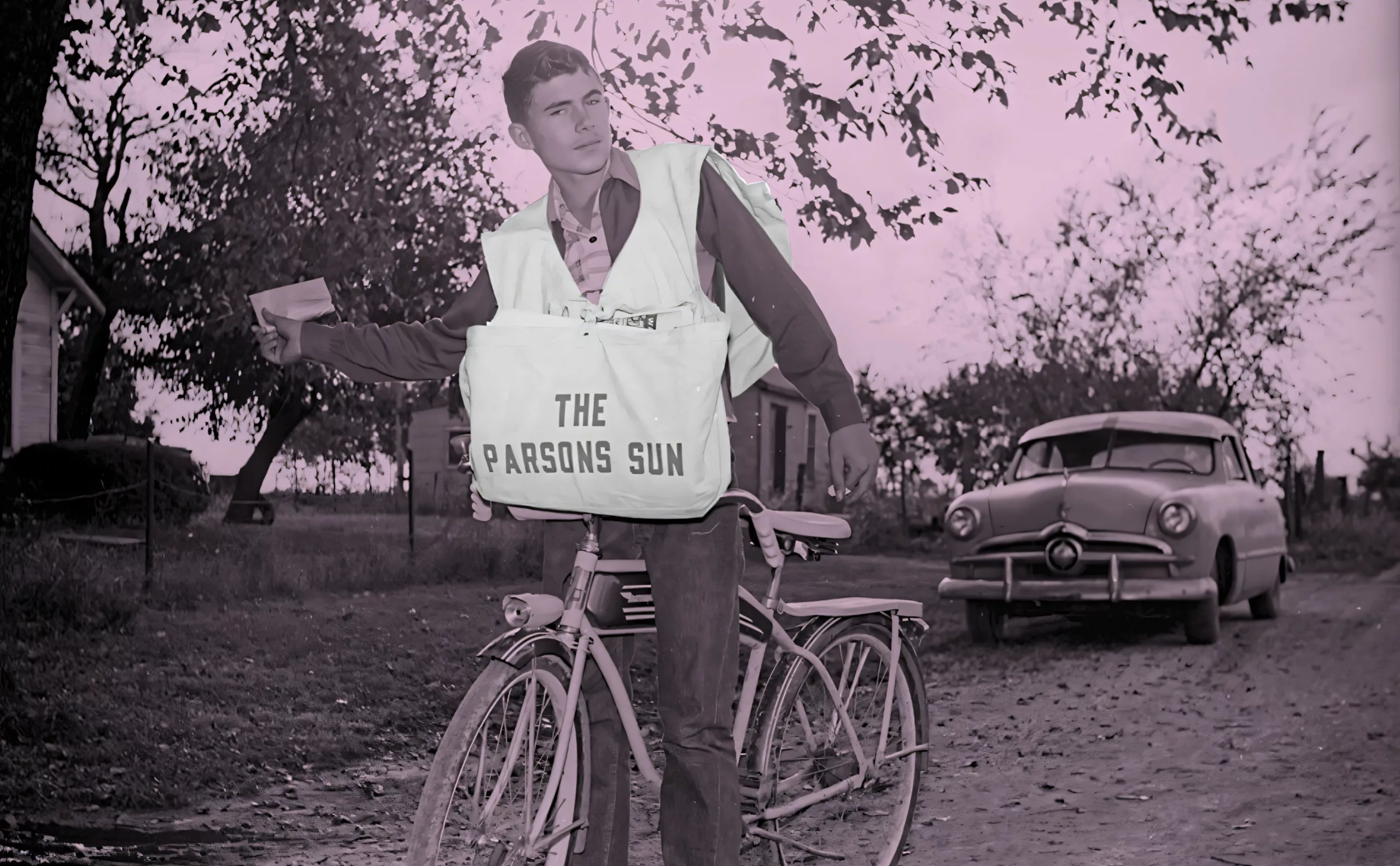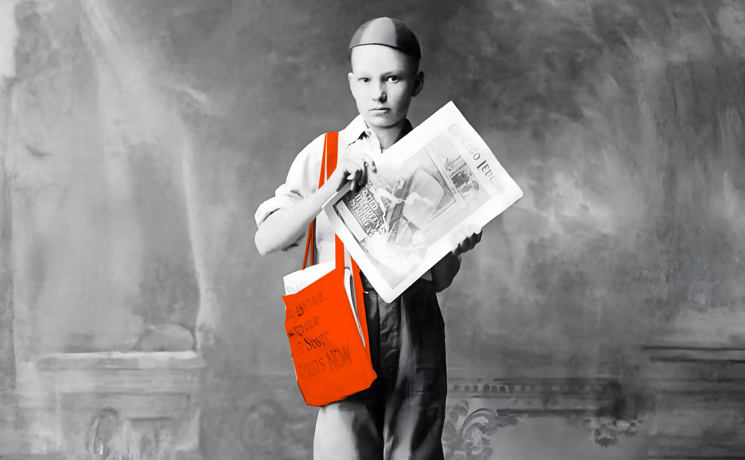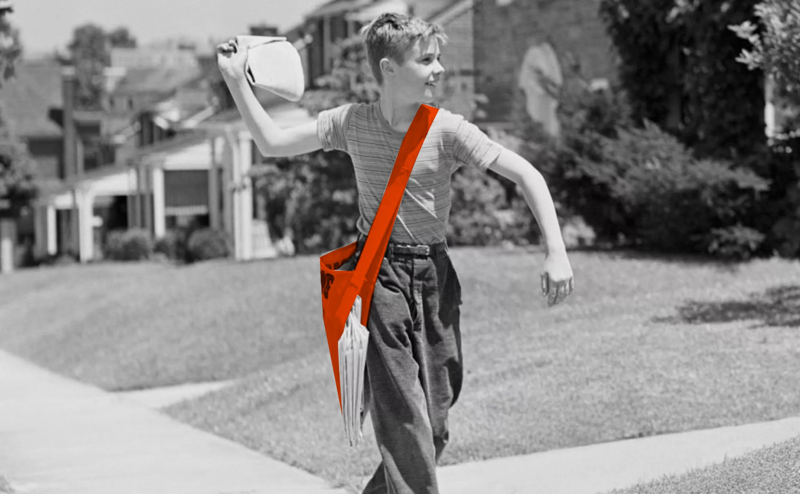 En plongeant dans les images d’archives, on retrouve plein de variantes de sacs. La version la plus simple est un carré de tissu plié en deux avec des bandoulières. Tandis que la version la plus élaborée est une “sacoche-gilet” (cf. Image ci-dessous) permettant au livreur de porter le double de journaux, de manière équilibrée, devant et derrière.