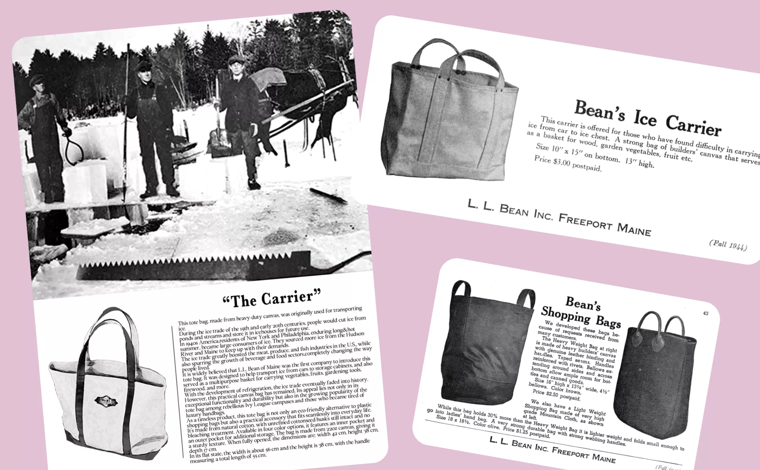 Le commerce de la glace a considérablement bénéficié aux industries de la viande, des produits frais et du poisson aux États-Unis, changeant complètement la manière dont ces produits étaient conservés et transportés. C’est donc dans les années 1940 que les magasins américains LL Bean commercialisent un sac très solide, le “Bean’s Ice Carrier”, conçu pour transporter de la glace des voitures aux armoires de stockage. Le reste de l’année, ces sacs multifonctions servaient également de panier pour transporter légumes, fruits, outils de jardinage, bois de chauffage, et plus encore.