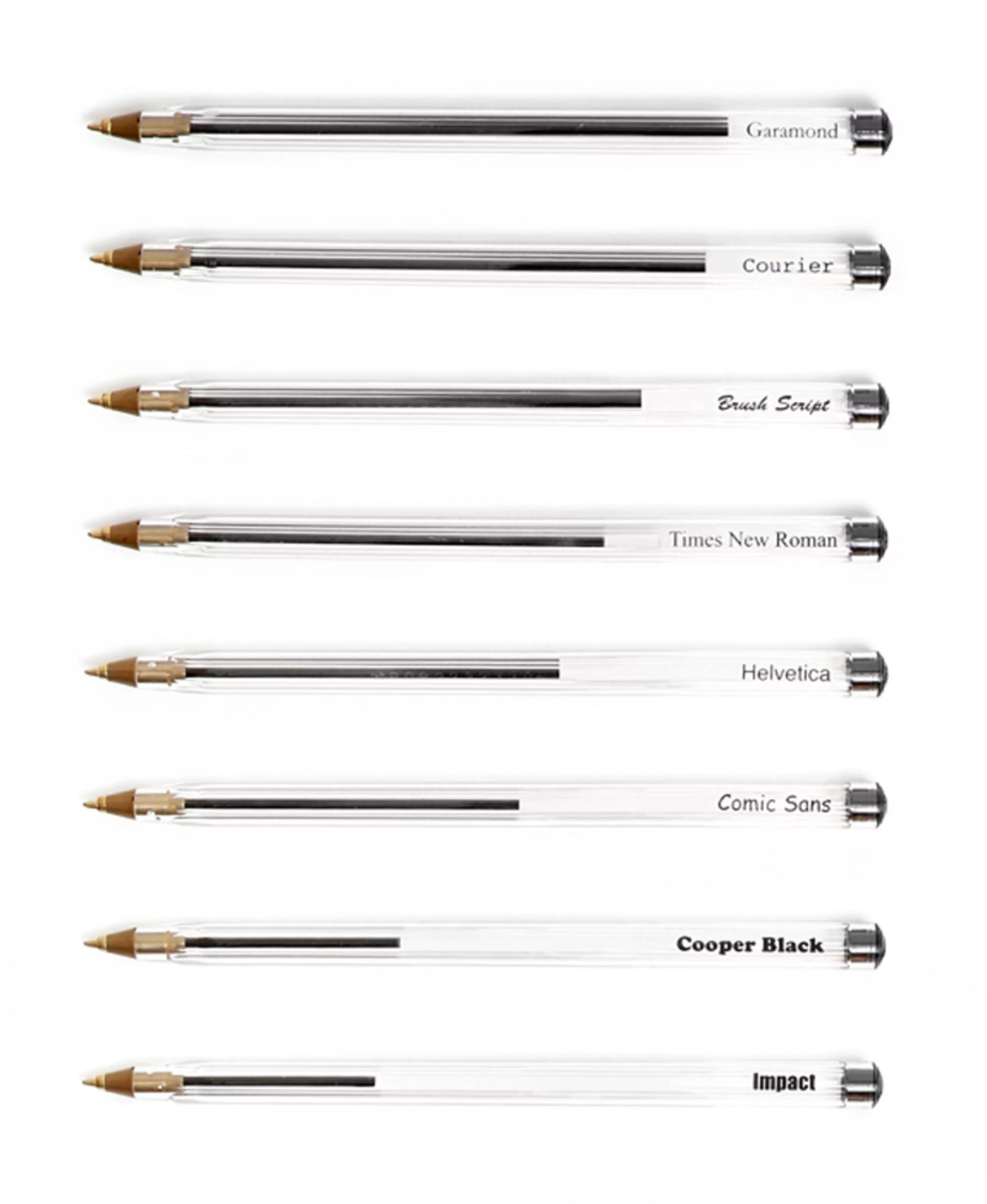 Pour revenir à la question de l’économie d’encre, deux étudiants se sont amusés à “colorier” différentes typographies avec des stylo BIC. Un stylo par typographie permet de mesurer “visuellement” la quantité d’encre utilisée…