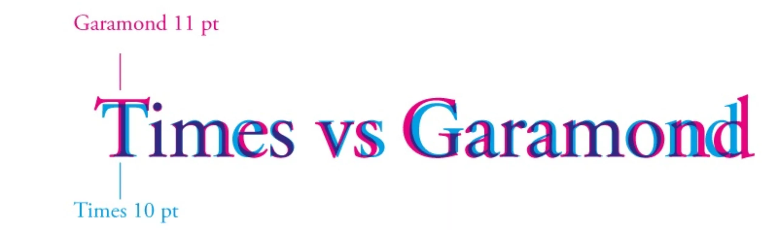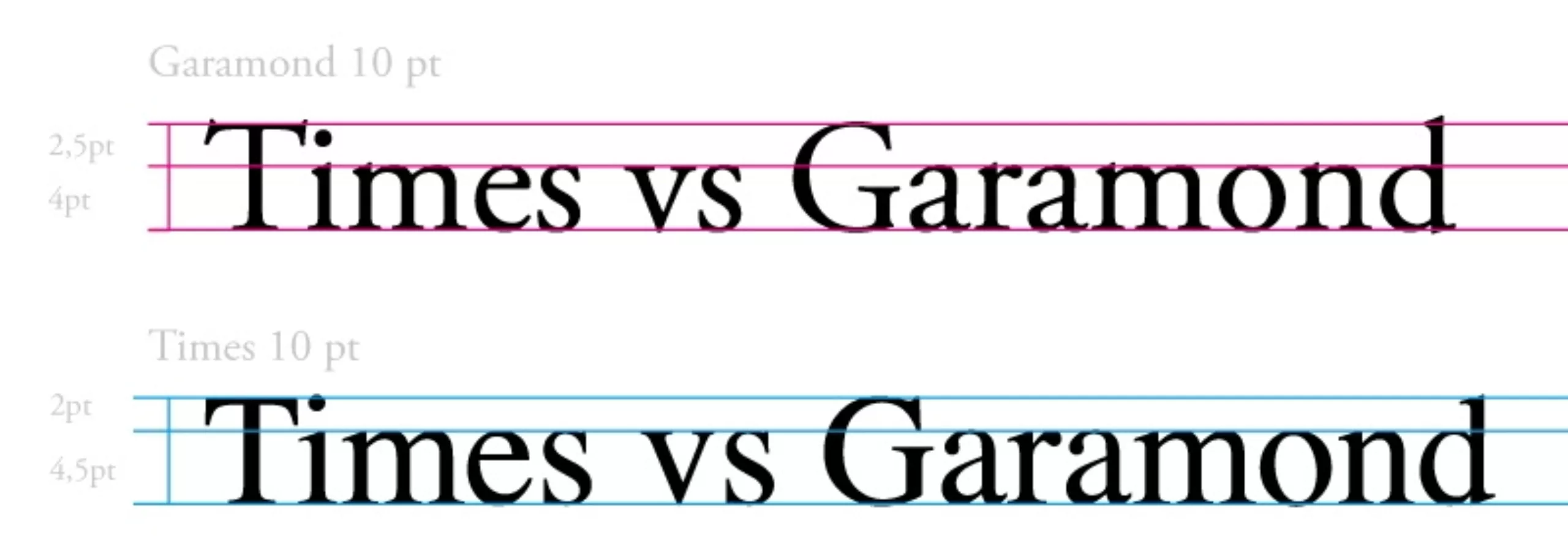 Pour pouvoir comparer le taux “d’encrage” deux typographies, il ne s’agit pas simplement de comparer l’encre utilisée pour deux textes imprimés en corps 10 pt. En effet, la taille d’un caractère est toute relative, la hauteur d’x ( le nom donné à la hauteur du tracé d’un caractère bas-de-casse, sans hampe ni jambage des minuscules) étant relativement variable selon le dessin typographique. Ainsi, dans cas de la Garamond, cette hauteur d’x est très faible, ce qui oblige d’augmenter la taille du corps pour obtenir une taille équivalente à une autre typographie ( et donc conserver un niveau de lisibilité équivalente).