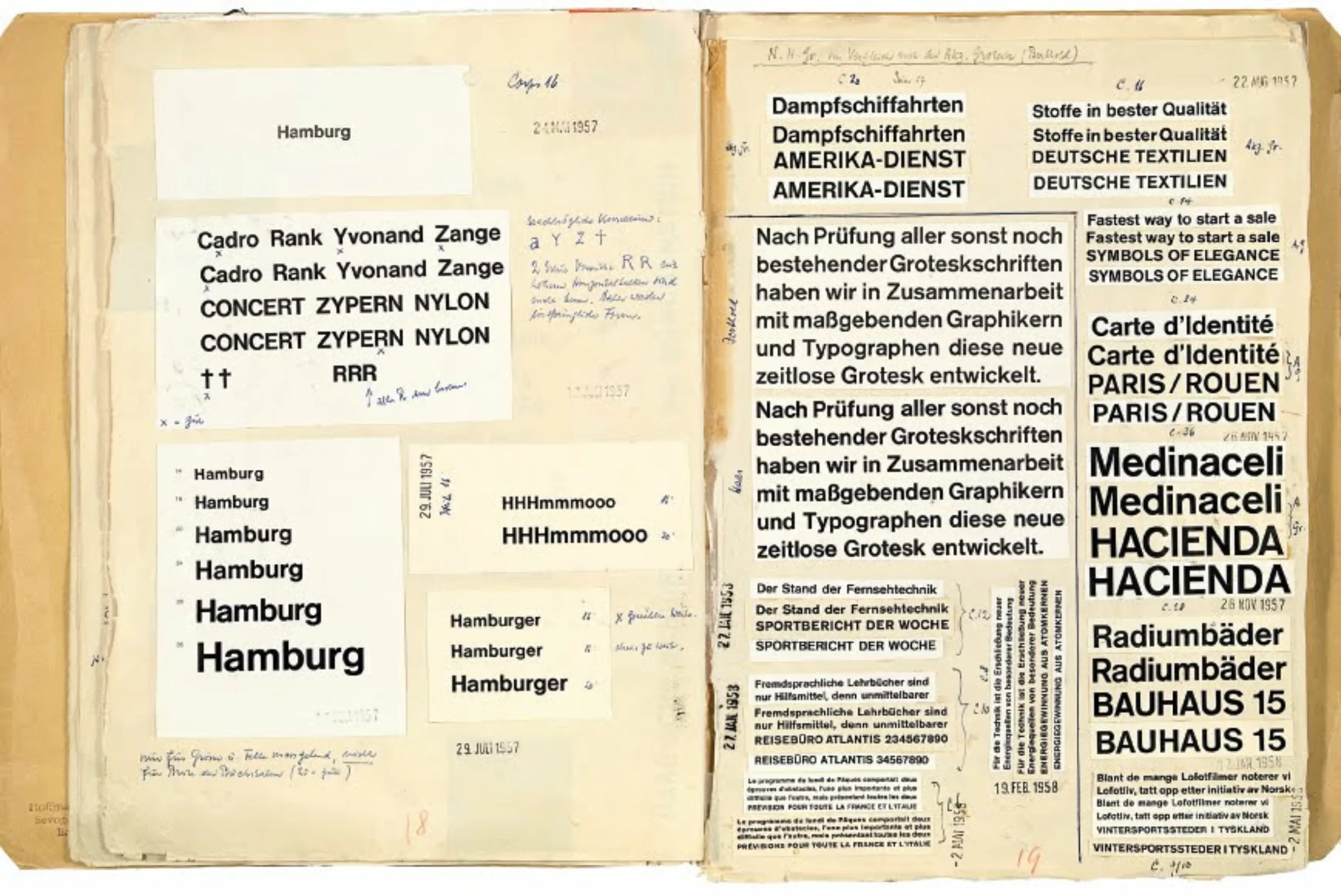 Il y a quelques années, nous vous avions découvert le “protocole de l’Helvetica” qui est précieusement conservé au musée de l’imprimerie de Bâle. Il s’agit des cahiers consignant toutes les études ayant permis d’aboutir au dessin final du caractère typographique suisse. On y découvre, pas à pas, épreuves d’imprimerie à l’appui, le moindre changement apporté au dessin des lettres et toute la gamme des combinaisons possibles de caractères. Ce document unique fournit un aperçu détaillé de l’immense tache que représente la mise au point d’une famille (Bold, regular, italic…) de caractère typographique. Au final, pour obtenir un résultat au simple et efficace que l’Helvetica, il aura fallu un an de travail laborieux !
