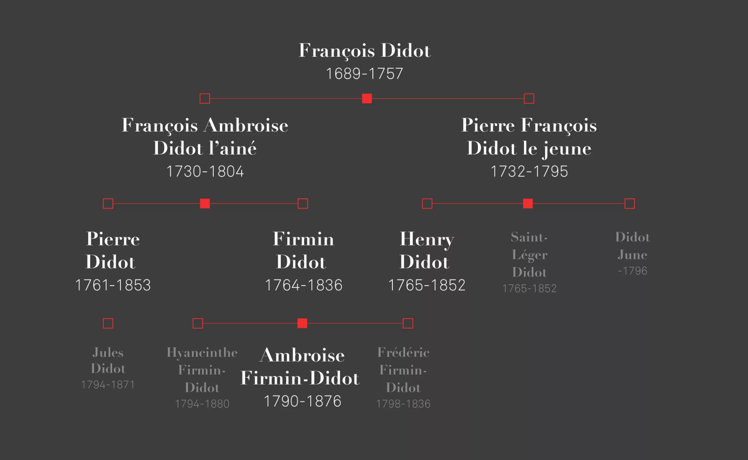L’histoire commence avec le grand-père, François, installé à Paris et qui publie la série des Voyages de l’abbé Prévost. Le père, François-Ambroise, a posé les bases d’une unité de mesure qui sera peu à peu acceptée par tous les imprimeurs : le point typographique ou point Didot. Cette mesure révolutionnaire permettra de calibrer plus finement les textes, assurant une mise en page parfaite, selon des équations mathématiques implacables ! Jusque là, les caractères étaient fondus de manière assez variable, et aucune norme précise ne permettait de les calibrer efficacement.