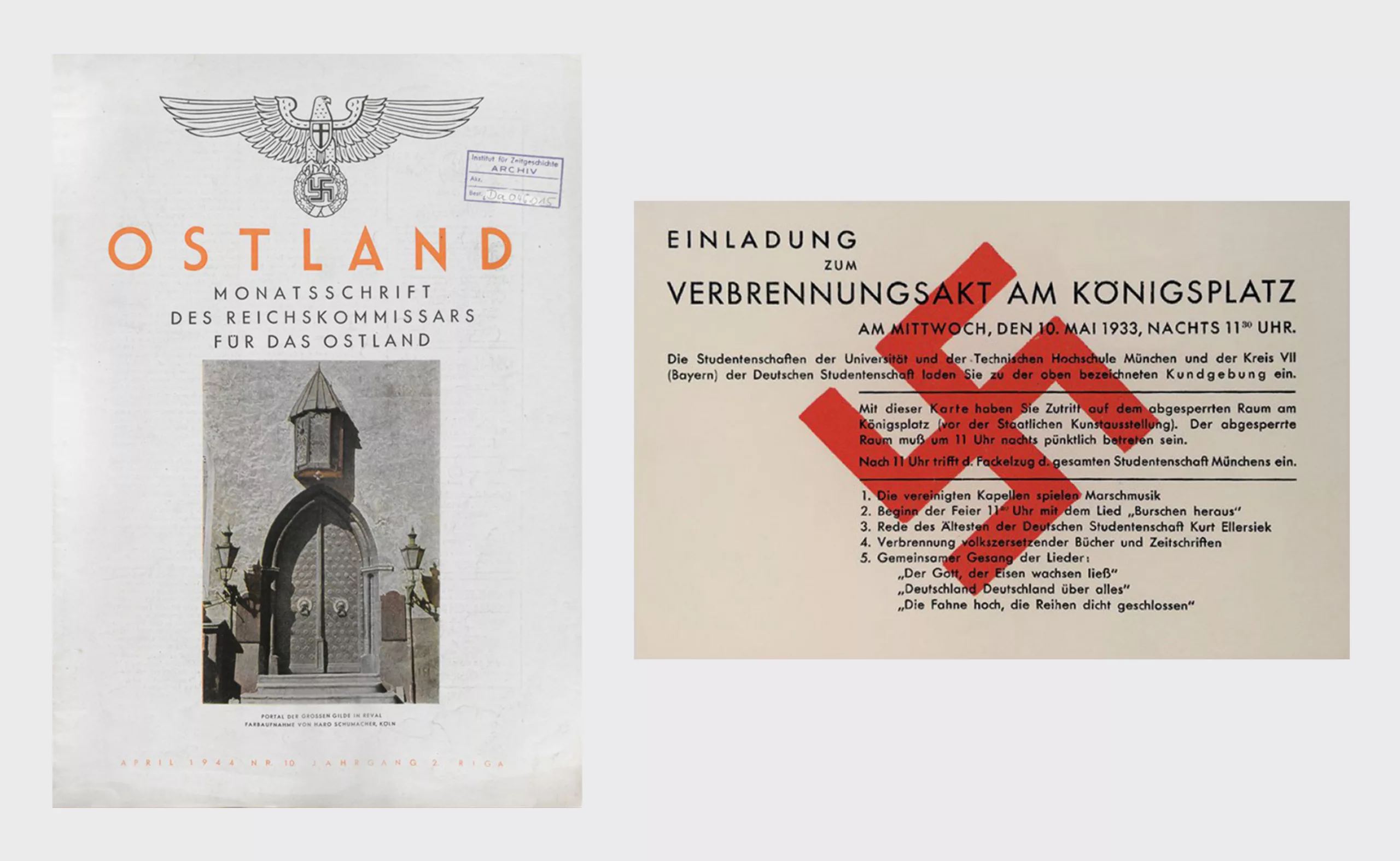 Dans la fureur ambiante, les nazis imposent leur conception de la typographie. Désormais, tout doit être écrit en gothique allemand (Fraktur), police avec laquelle a été imprimé Mein Kampf. Ce type de caractère renvoyant à une vision folklorique de la germanité, empreinte d’une histoire qui se voudrait millénaire.