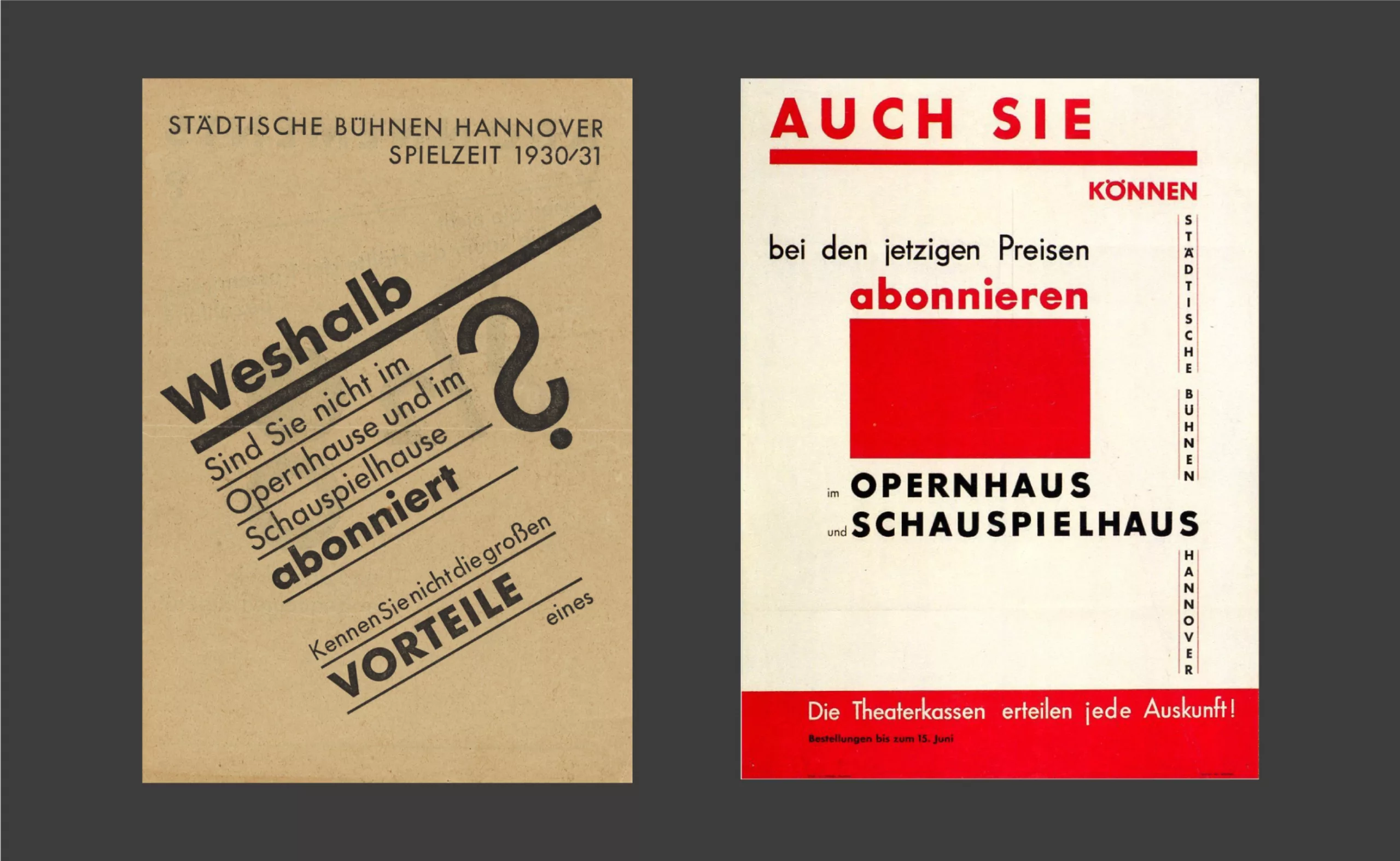 C’est dans la ville de Hanovre que ce conflit typographique prend la forme la plus visible. Le designer Kurt Schwitters est alors en charge de repenser l’identité visuelle de la municipalité dans le cadre d’un grand programme de modernisation. Il imposera le Futura dans l’ensemble de la communication comme dans les exemples d’affiches et dépliants ci-dessous.