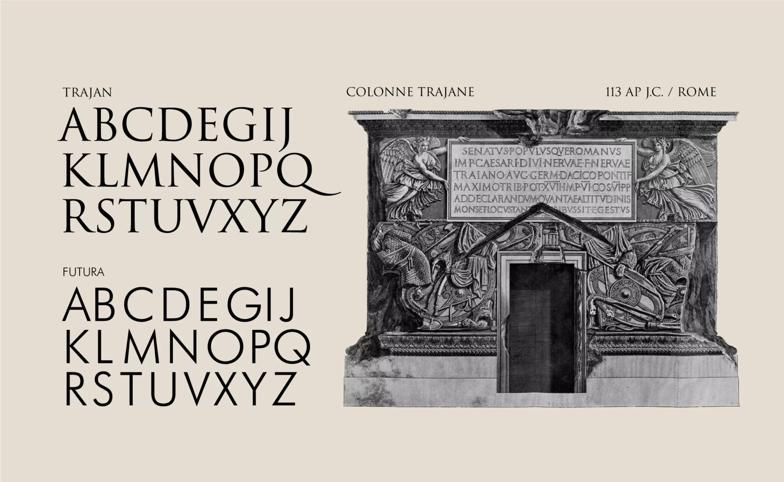 Ce lien avec les capitales romaines, l’écriture du “pouvoir”, n’est pas neutre. La géométrie des inscriptions lapidaires romaines est là pour fixer les messages dans le temps. C’est une écriture statique, à l’inverse de la tradition manuscrite, que l’on pourrait qualifier de dynamique et qui débouche sur l’invention des minuscules.