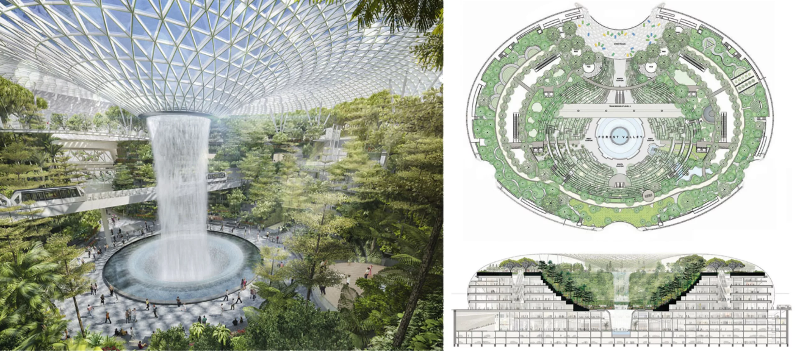 La structure du Jewel of Changi allie centre commercial, canopée suspendue, restauration, hôtel et jardins, autour de “la plus grande cascade intérieure” (les Singapouriens aiment beaucoup faire les plus grandes choses du monde). Sans oublier la fonction aéroport, bien sûr. Une sorte de mini-ville dans la ville, où l’on peut se divertir, manger, consommer, dormir et voyager.