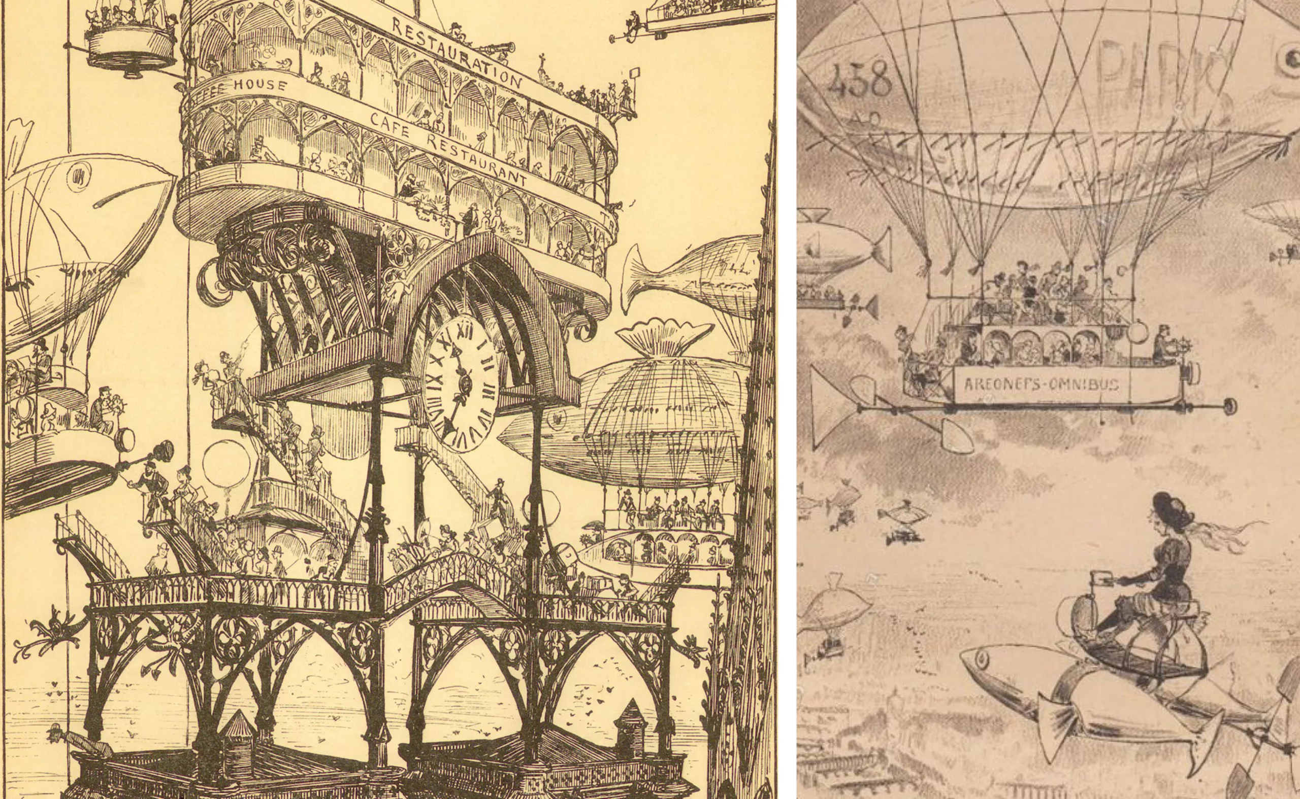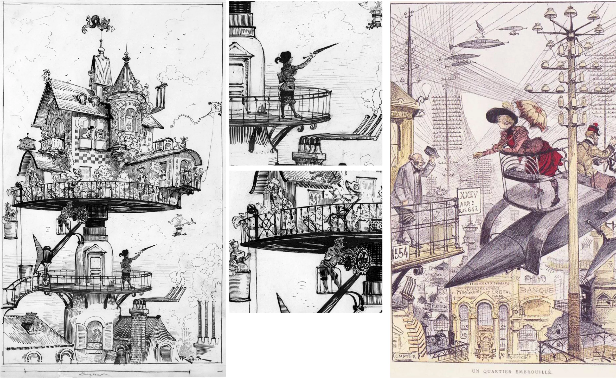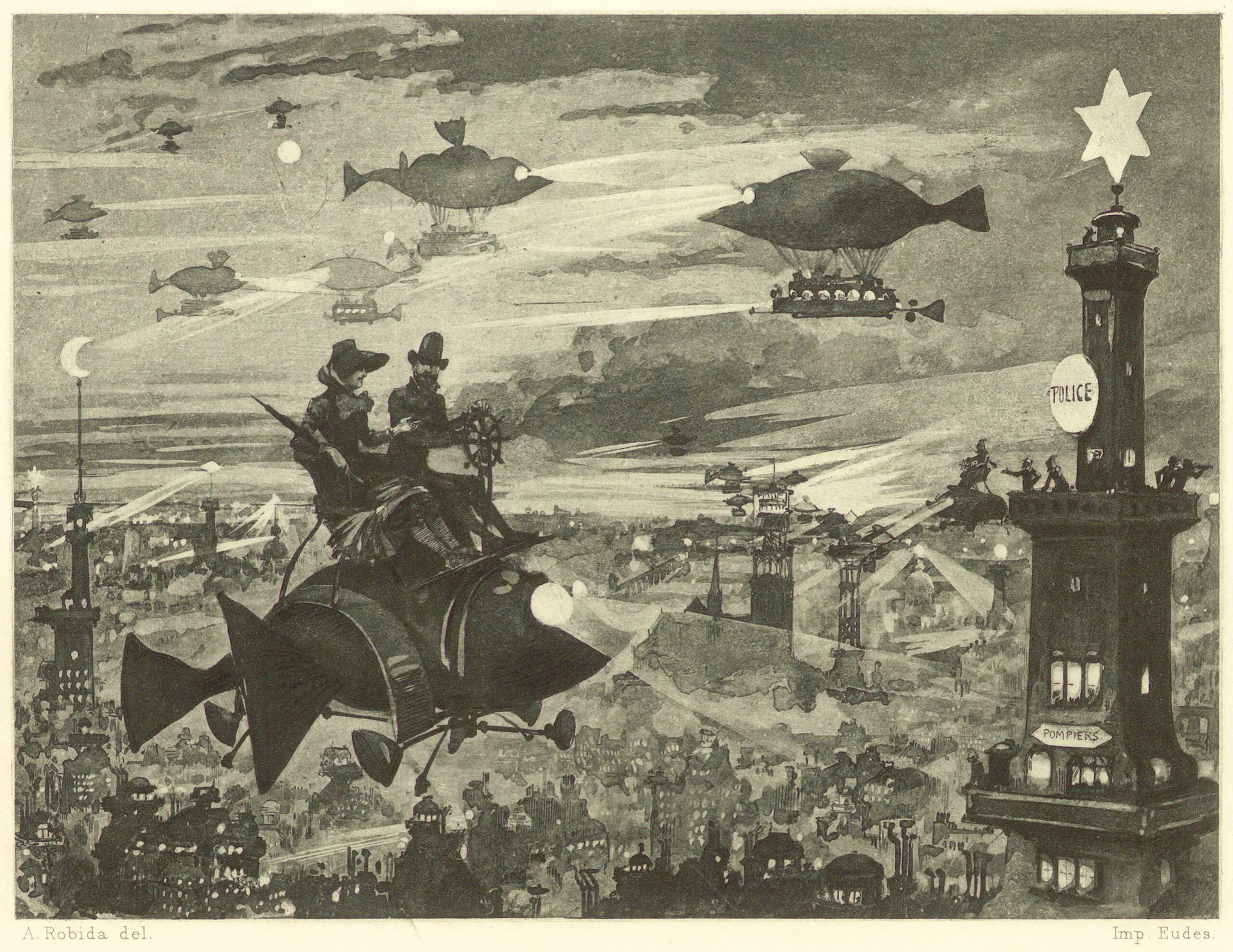 Dans ses gravures tirées du premier livre, on voit des engins volants de toutes sortes, un restaurant flottant sur le toit de Notre-Dame, des embouteillages aériens, des maisons tournantes, ou des réclames envahissant le moindre espace urbain :