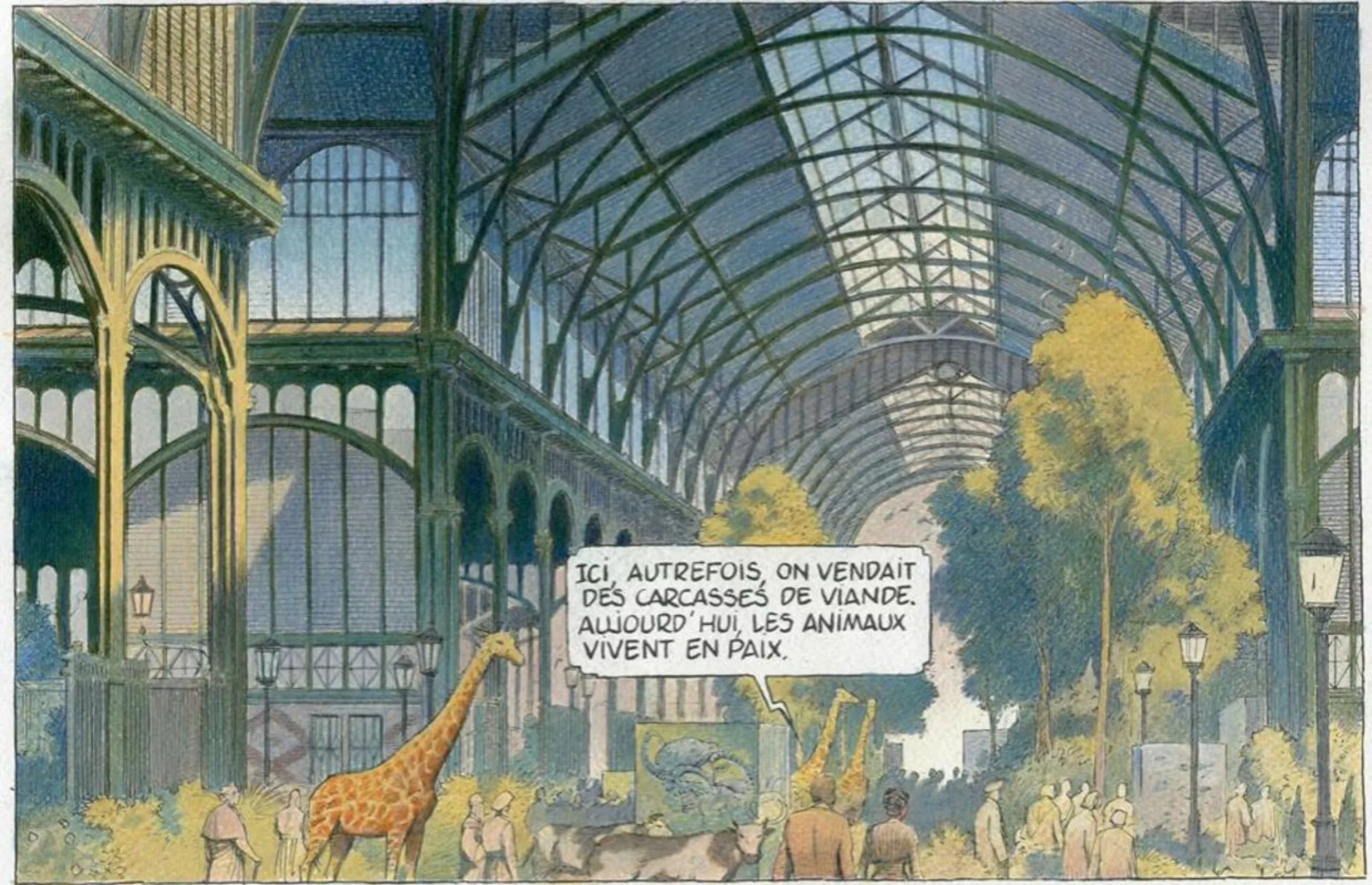 Réalistes et peut-être nostalgiques, Peeters et Schuiten font revivre les Halles, reconstruites à l’identique dans l’album Revoir Paris, qui se déroule en 2156. Le vieux Paris, figé à jamais dans sa cloche où baigne une météorologie parfaite, permet de faire vivre aux touristes privilégiés une expérience parfaite, en déambulant dans des immeubles Haussmaniens aussi magnifiques qu’inhabités, ou destinés aux plus fortunés. Autour, les banlieues noires contrastent avec cette bulle-souvenir hors du temps, et font écho au Paris d’aujourd’hui. Les paysages rappellent certaines scènes de Blade Runner et les gravures de Robida, dans lesquelles l’homme est minuscule dans la grandeur folle de la ville. Comme le scénariste l’explique :