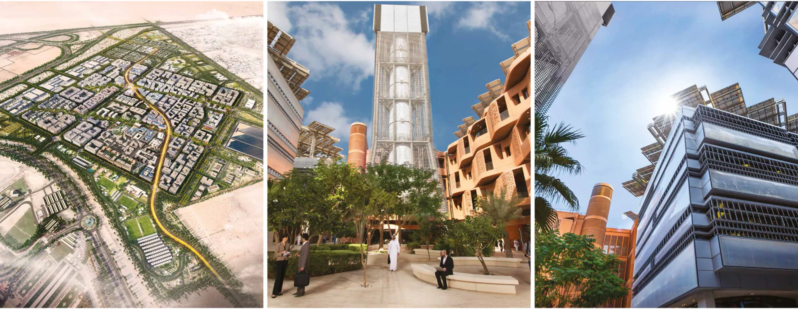 Les habitations, inspirées de l’architecture traditionnelle locale, côtoient les immeubles d’affaires. Tous les bâtiments sont passifs donc ne consomment pas d’énergie, et offrent une climatisation naturelle de 10°C de moins qu’à l’extérieur. Le maître mot de cette réussite : le progrès technologique et écologique. Un grand champ de panneaux solaires alimente la ville, entièrement piétonne, et traversée par un réseau de véhicules électriques automatisés.