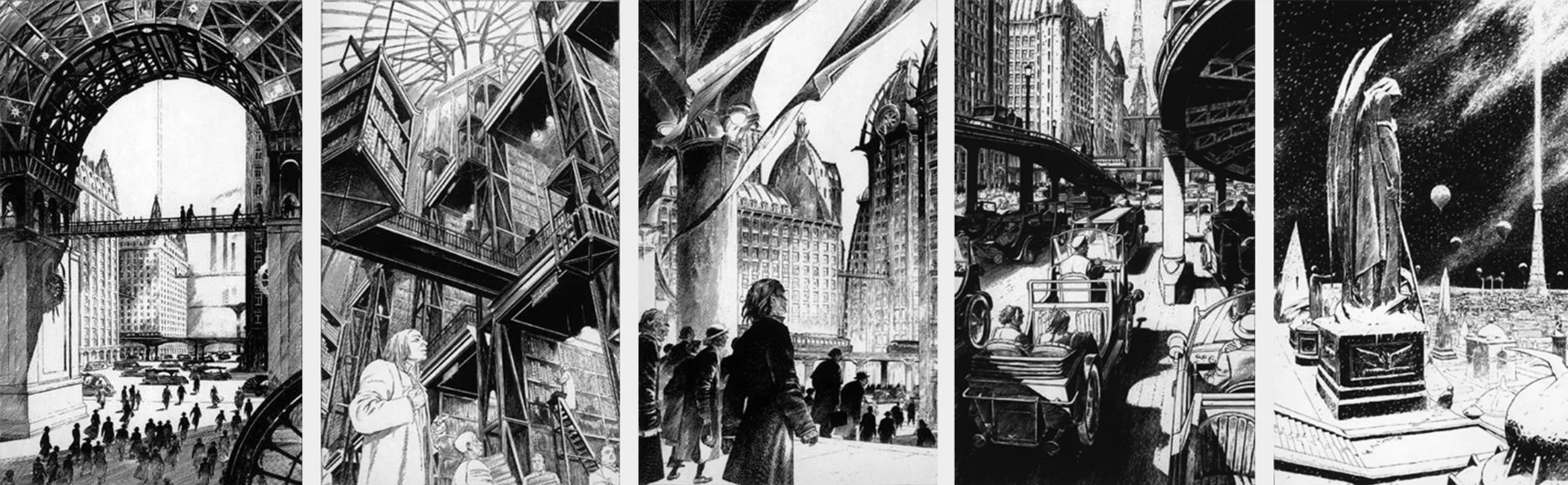 Ces villes imaginées sont inspirées des livres de Verne, Robina ou encore Kafka, et des grands films de SF dystopiques comme Blade Runner, Metropolis ou Brazil, comme illustrés ci-dessous.