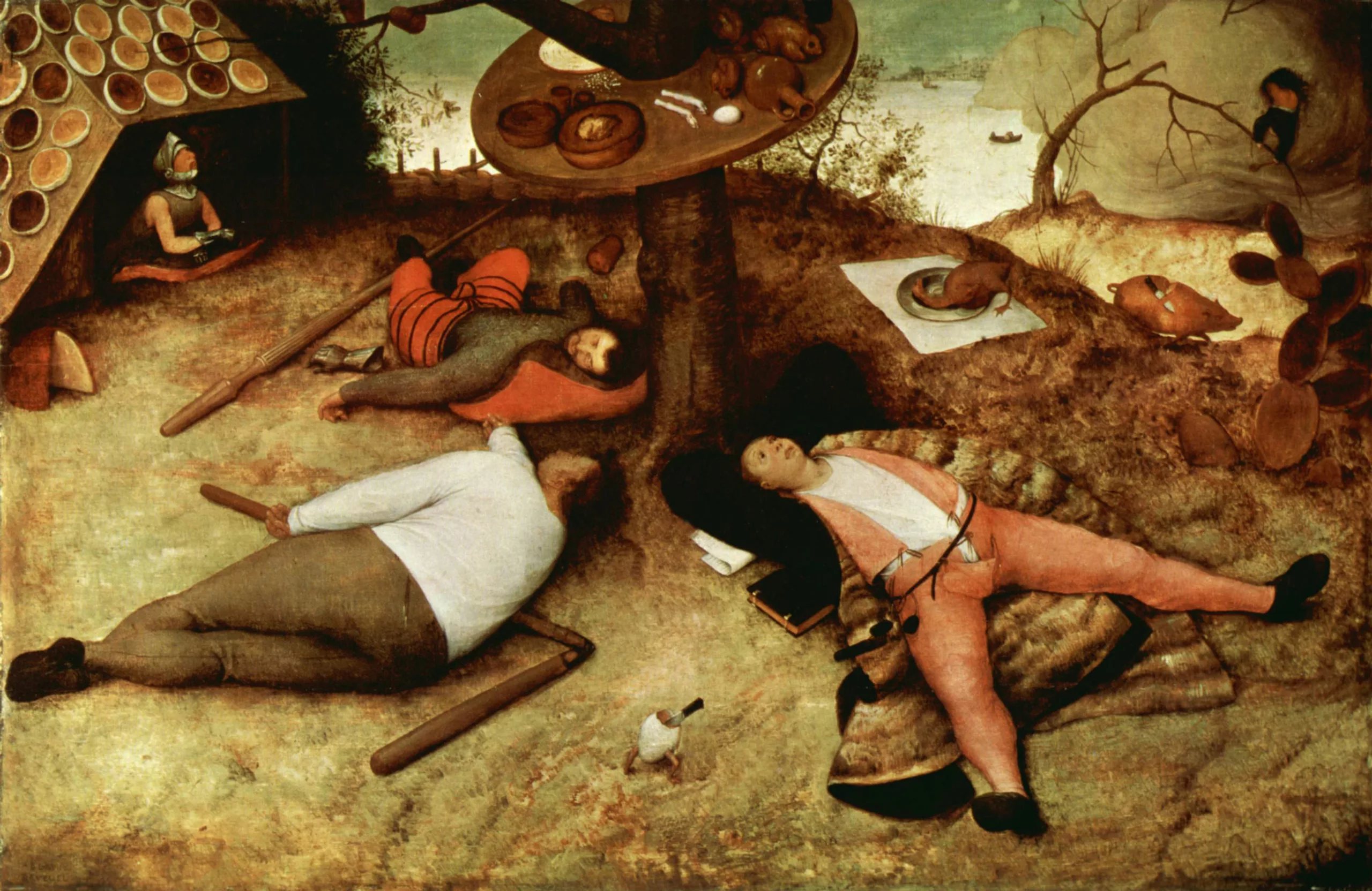 Dès le XIIIe siècle certains textes mentionnent le pays de Cocagne, “un lieu imaginaire où l’on trouve tout en abondance et sans effort incitant ainsi la gourmandise et la paresse“, qui sera peint par Brueghel en 1567. On y voit des hommes libérés face à la nourriture, dans un paysage où rien ne manque et tout semble être disponible en tendant le bras, comme ces crêpes sur le toit, ou ce cochon pré-découpé qui gambade avec un couteau sur le dos comme l’oeuf à la coque du premier plan, ou ce nuage de semoule dans lequel un homme plonge, dans le fond :