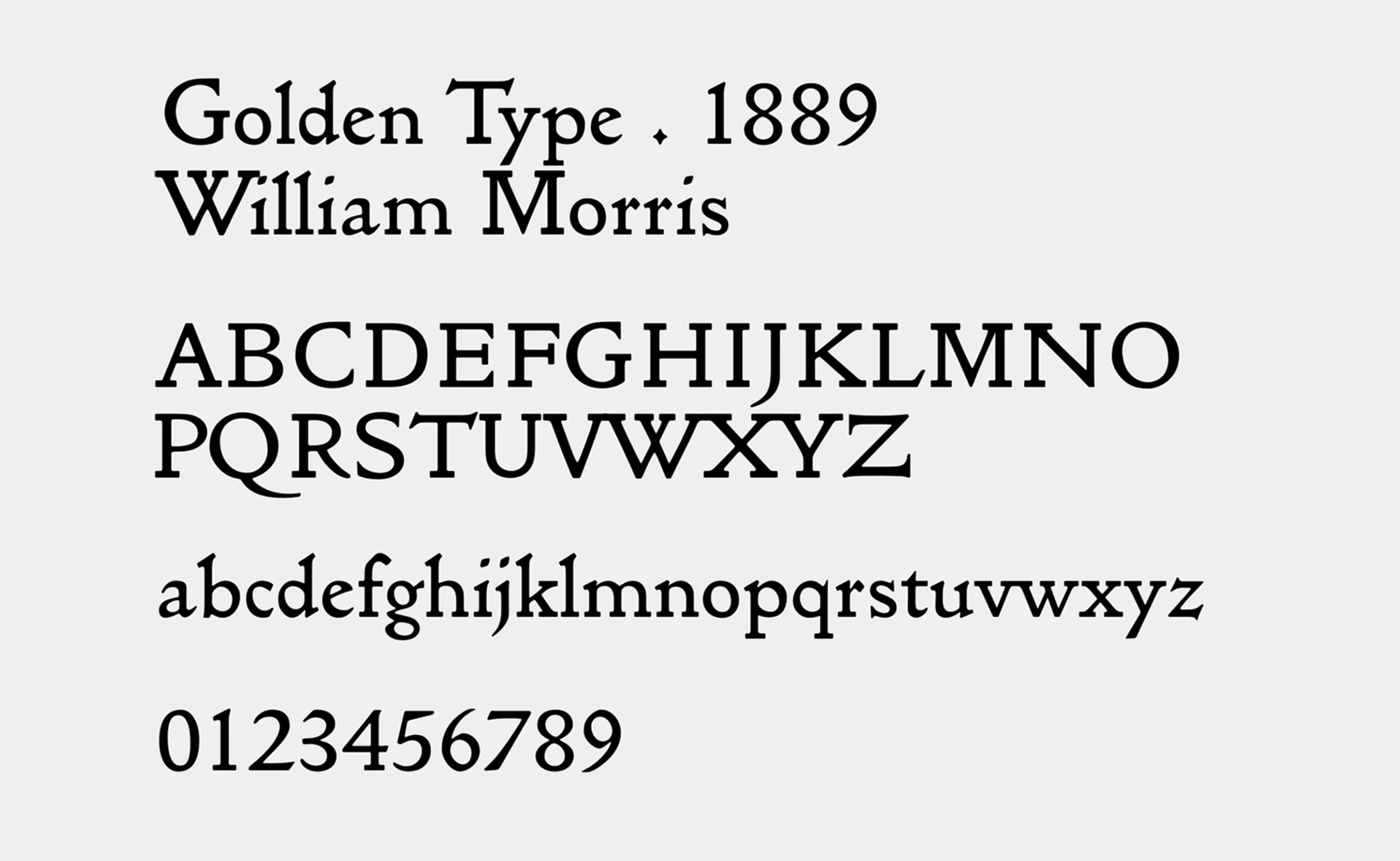 À 60 ans il se lance dans la typographie et crée des caractères d’imprimerie pour sa maison d’édition, Kelmscott Press. Morris souhaite toujours valoriser le travail manuel et fait renaître des caractères moyenâgeux inspirés de Nicolas Jenson (1470). Il crée ainsi la Golden Type (1891) pour la publication du livre Golden Legend de de Voragine, issue de sa collection de livres rares et précieux. Le papier est fabriqué à base de lin, les illustrations sont faites par ses amis artistes ou par lui-même et il réalise ornements et typographie.