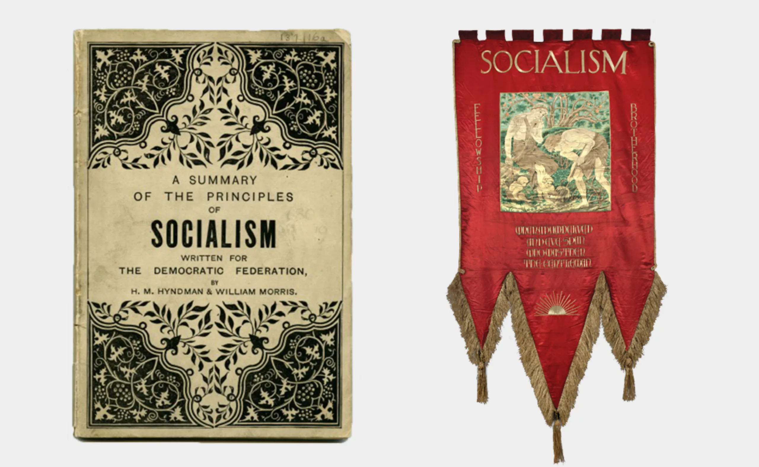 Derrière cette double mission se cache un engagement politique militant qui vise à s’opposer à l’injustice sociale du capitalisme montant. Si la valeur ultime du capitalisme est le profit, Morris préfère croire au beau, à l’utile, et à l’égalité dans l’abondance. En 1883 il s’engage dans la politique et fonde en 1885 le second parti socialiste d’Angleterre, qui n’a pas encore beaucoup d’adeptes. À force de lectures, dont Le Capital de Karl Marx qu’il lit en français avant sa traduction, il aiguise son sens politique et milite activement auprès des foules en vulgarisant les grands textes socialistes révolutionnaires. Sa pensée résonne encore dans notre société actuelle, même si les choses ont évolué (aujourd’hui les travailleurs sont également consommateurs) :