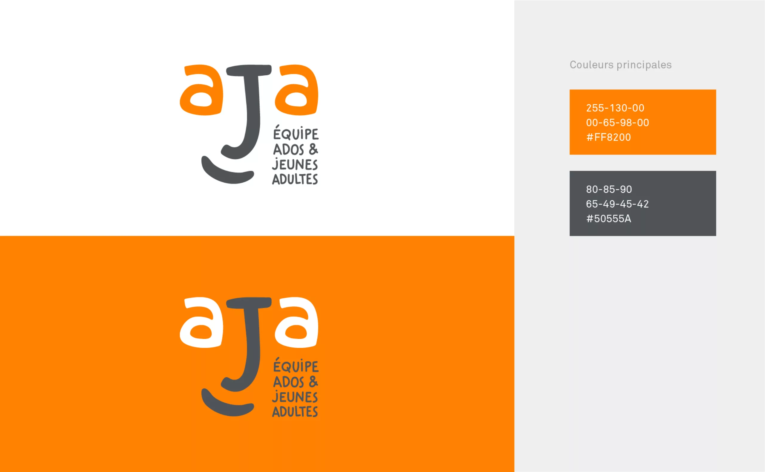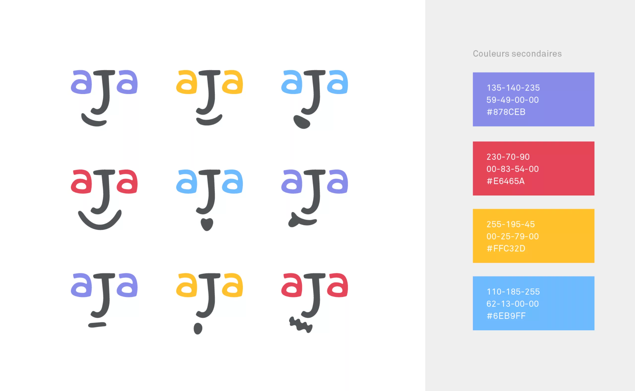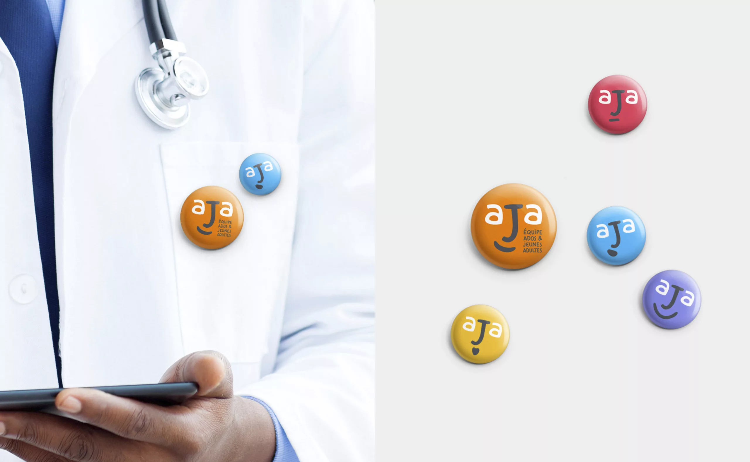 Nous avons choisi de créer ce signe bienveillant et humain pour les représenter. Constitué des lettres AJA (Adolescents et Jeunes Adultes), le logotype représente un visage souriant. Ce signe dessiné au trait évoque un univers illustratif, positif et joyeux. C’est un signe qui invite à exprimer ses sentiments, son humeur, et même à parler des choses qui font mal (cf: le logo souffre parfois !).