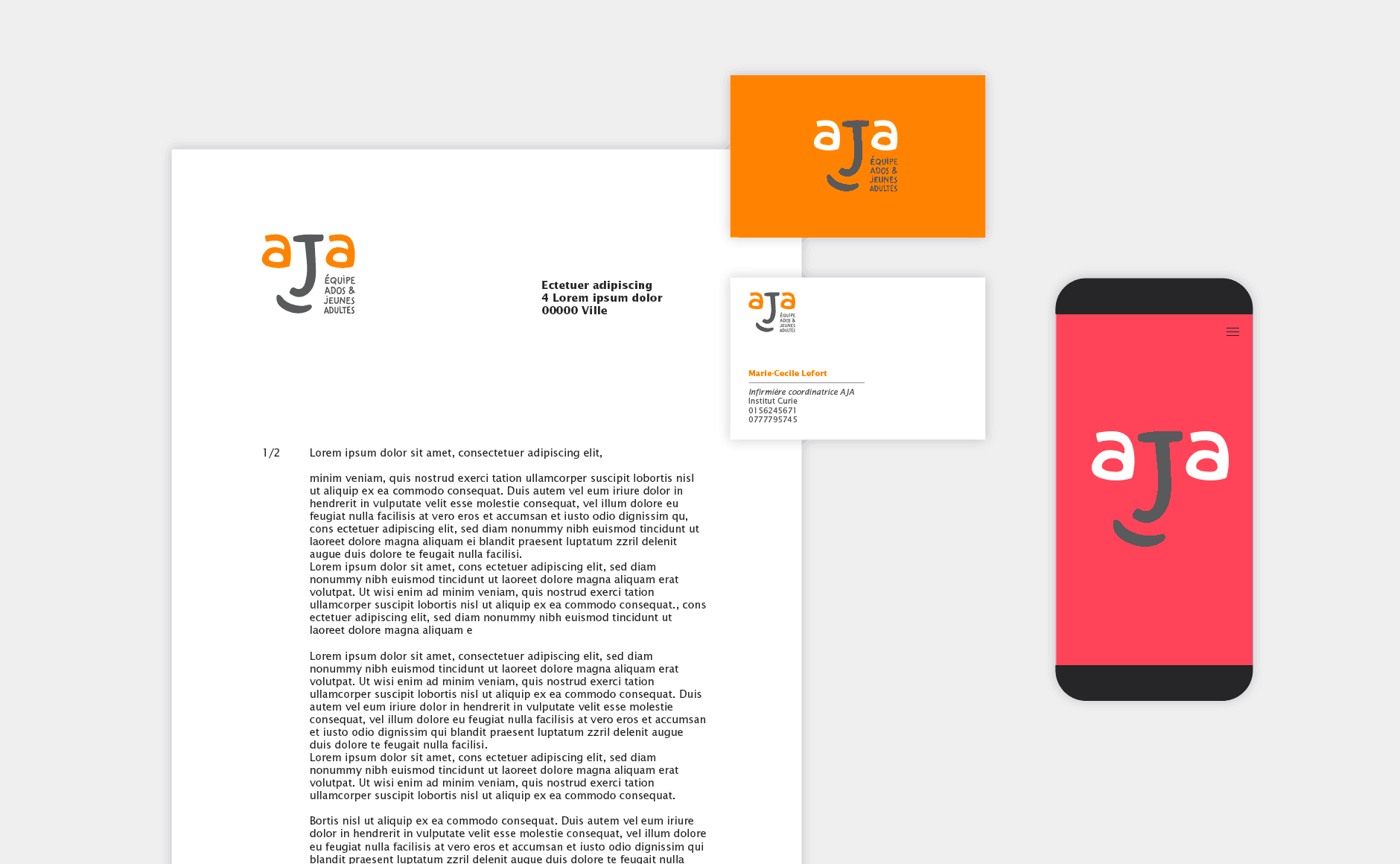 La mention manuscrite « Équipe Ados & Jeunes Adultes » conserve l’esprit ludique et humain de l’acronyme. Par souci de filiation, le logotype principal est aux couleurs de l’Institut Curie, même si il peut changer de couleur…
