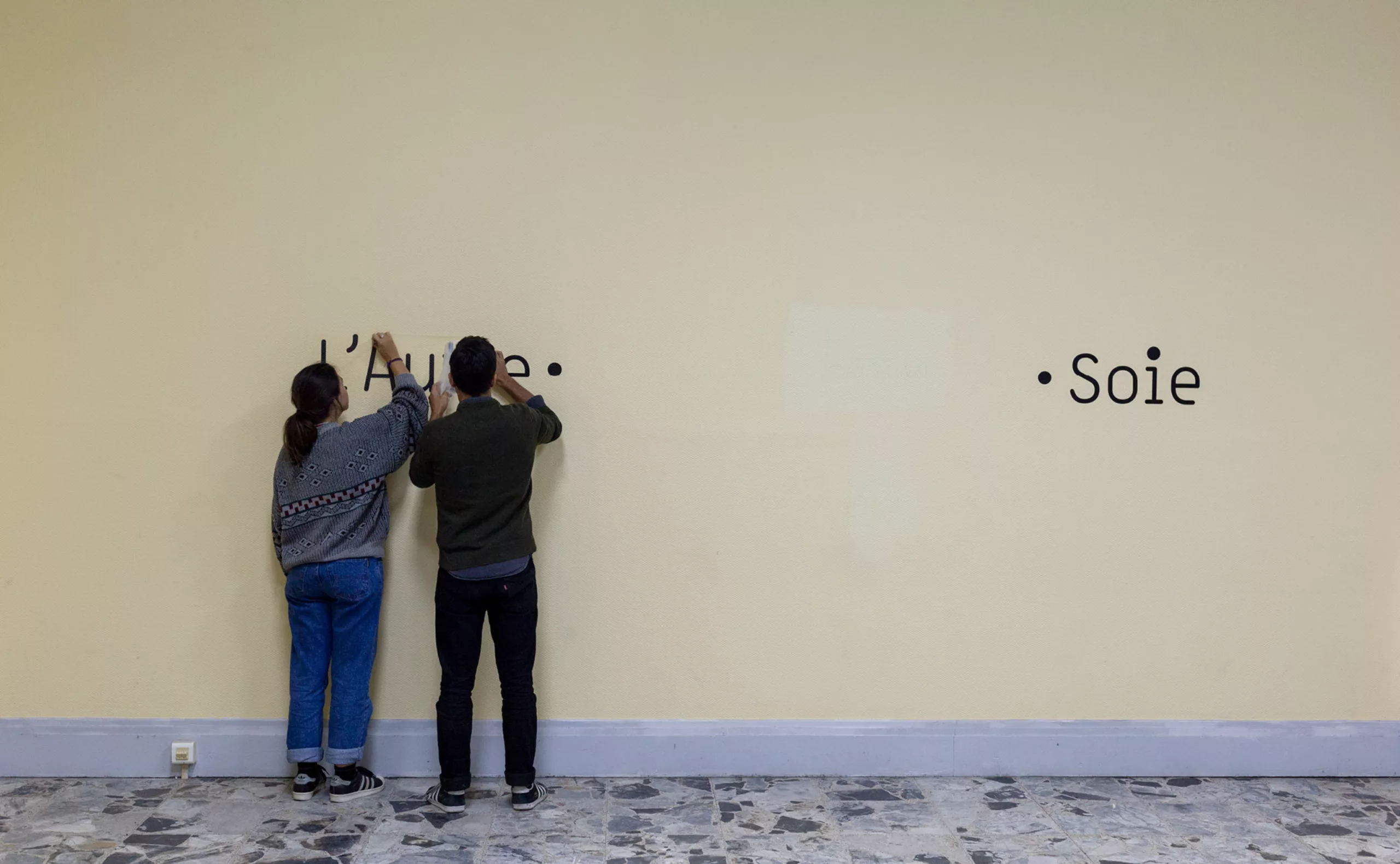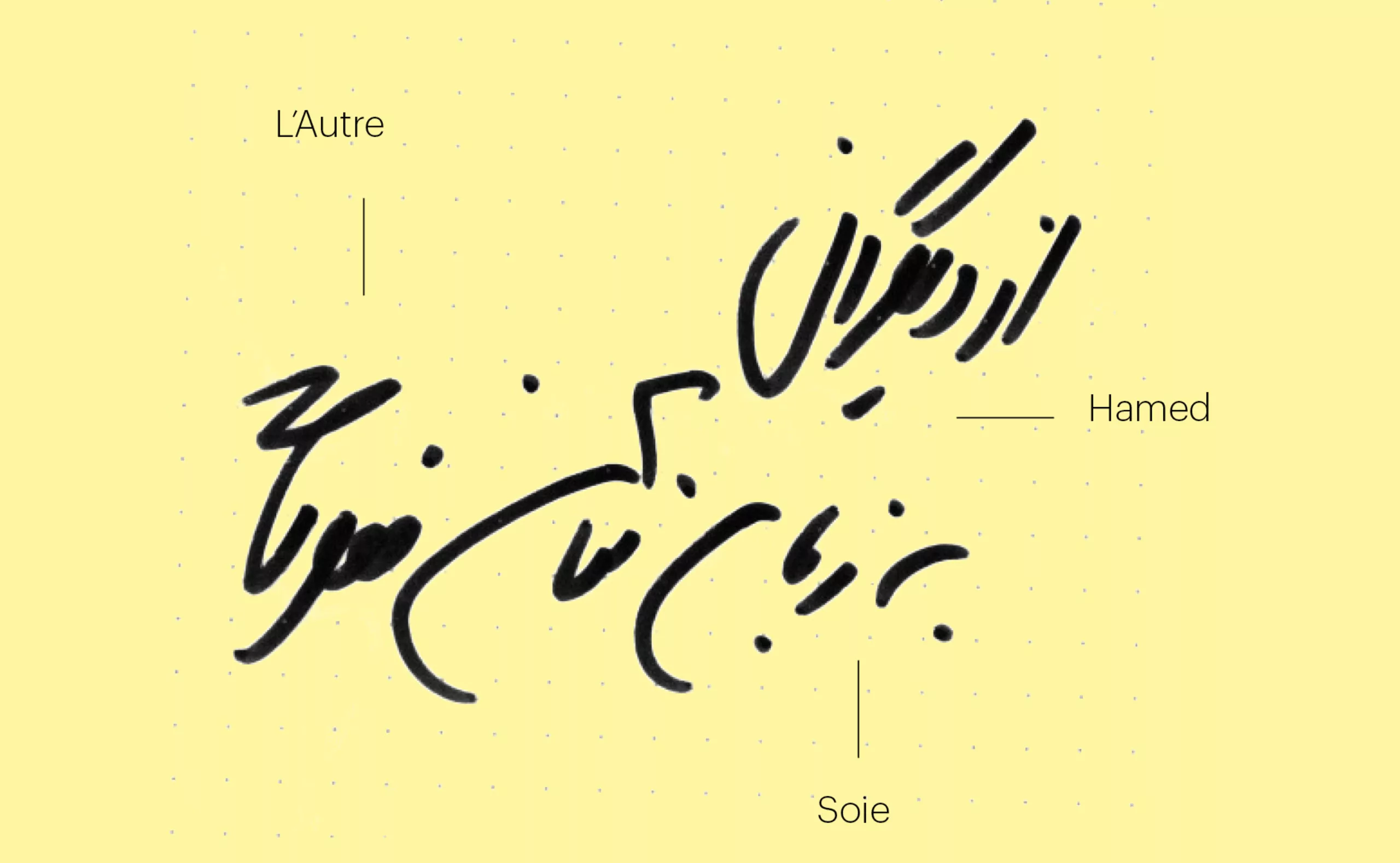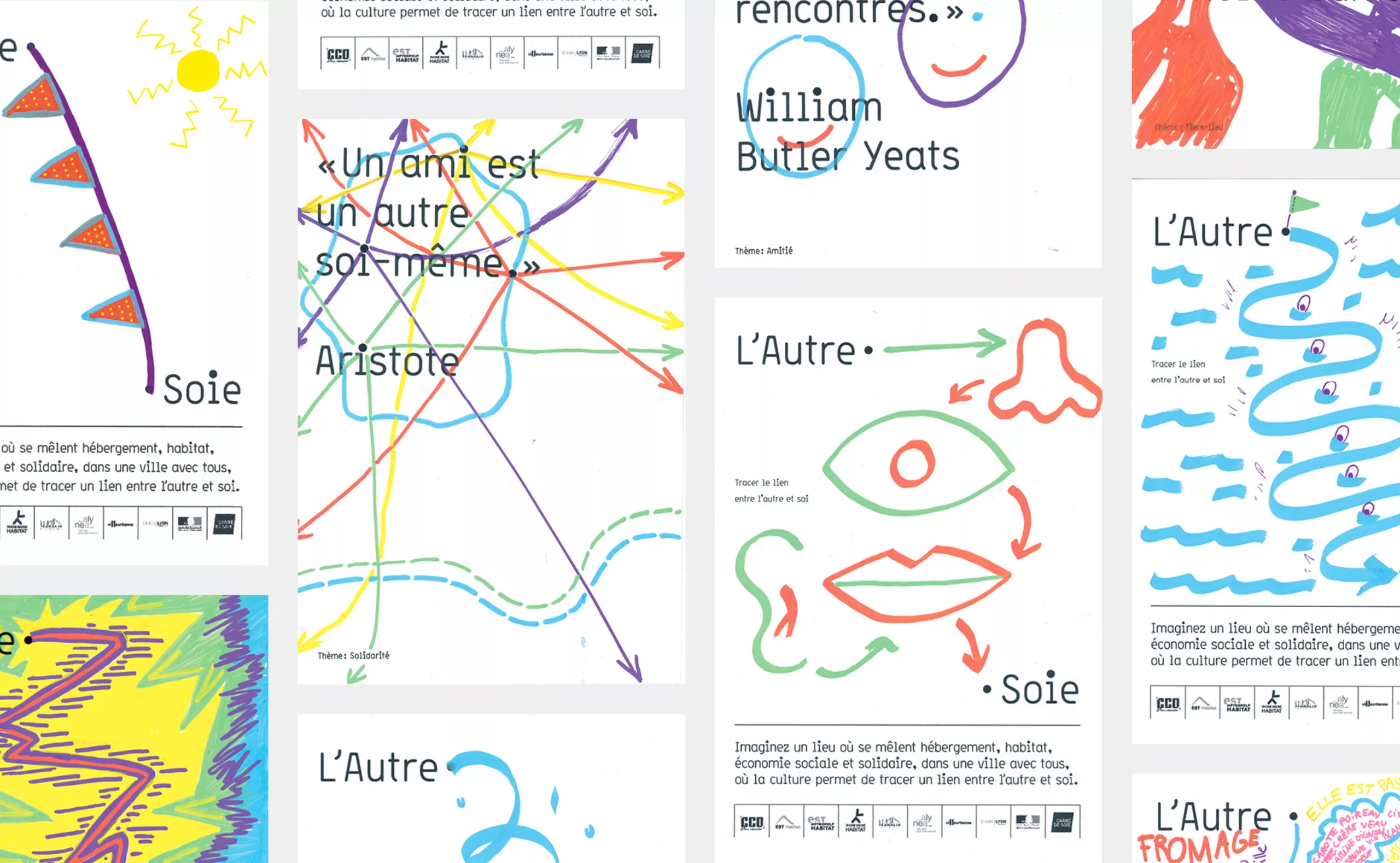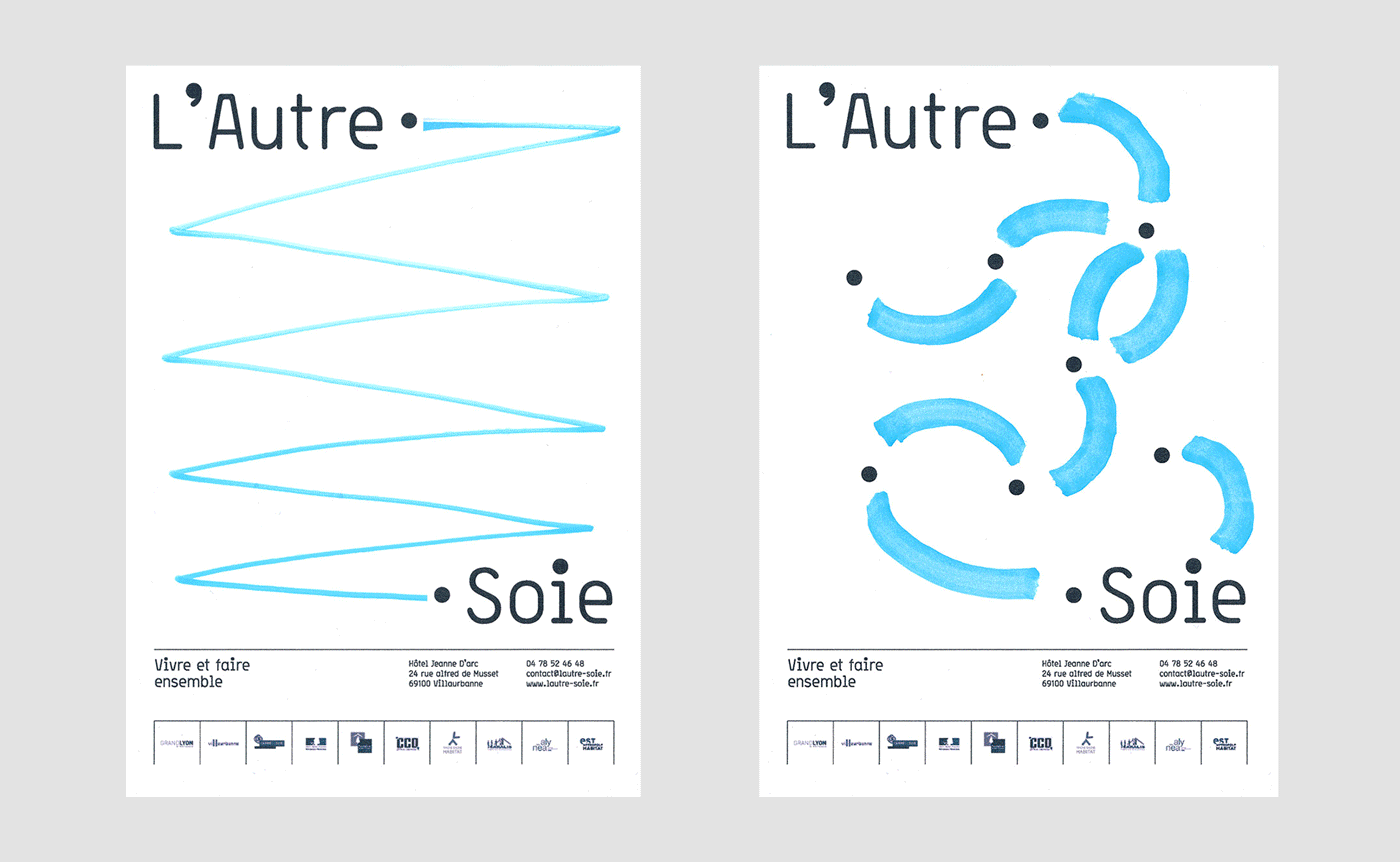 En effet, le bâtiment accueillait 150 migrants issus principalement de la jungle de Calais. Après quelques échanges, et malgré la barrière de la langue, nous leur avons demandé d’écrire «L’autre Soie» dans leur langue natale. Déjà que le nom “L’autre Soie” n’est pas évident à comprendre en Français, avec sa double lecture, d’un côté la référence au quartier de la Soie qui tire son nom des nombreuses usines textiles, et puis de l’autre cette notion d’altérité “l’autre et soi”… alors, ne maitrisant ni l’Afghan, ni le Syrien, nous voilà partis dans des tentatives d’explications gestuelles.