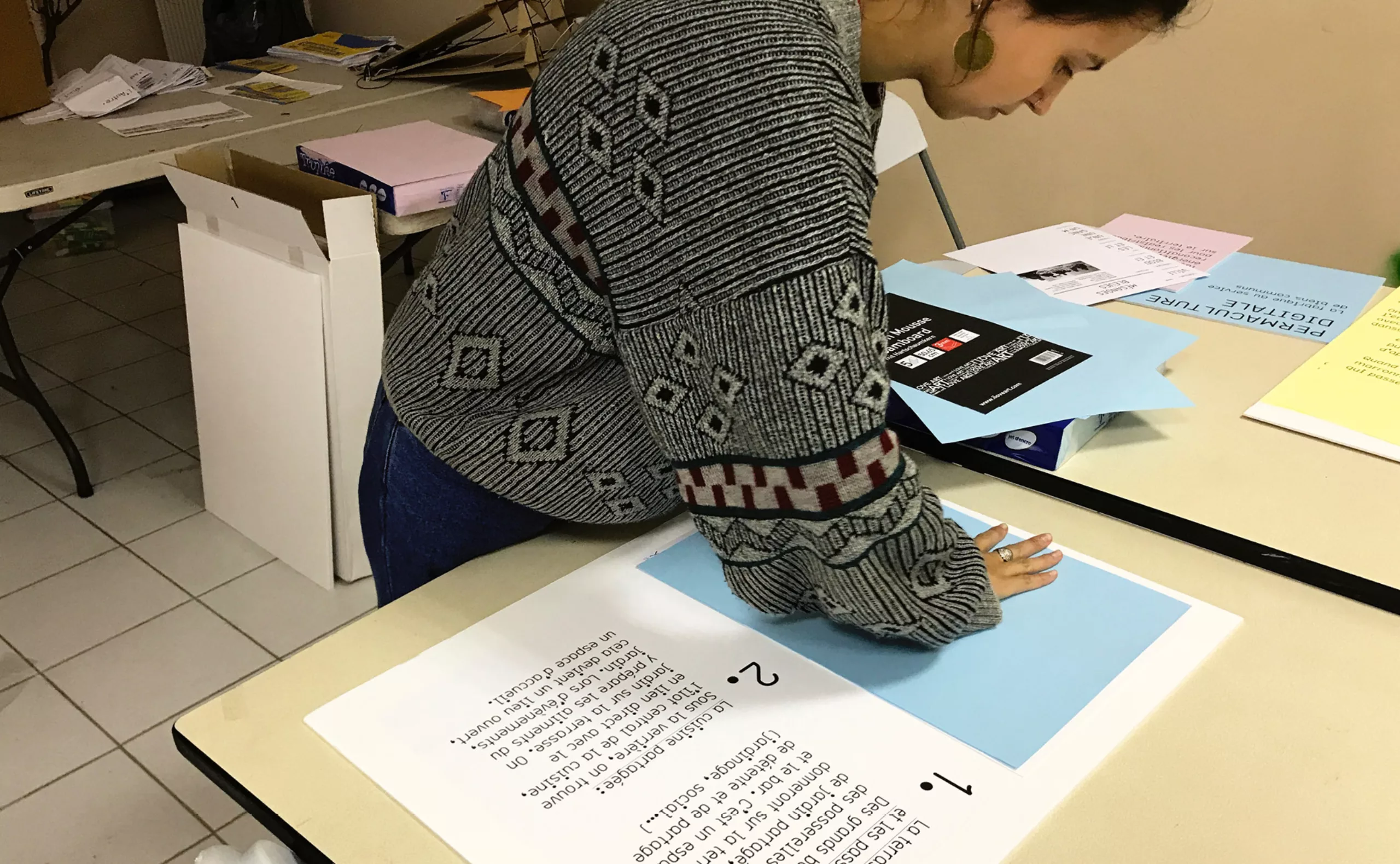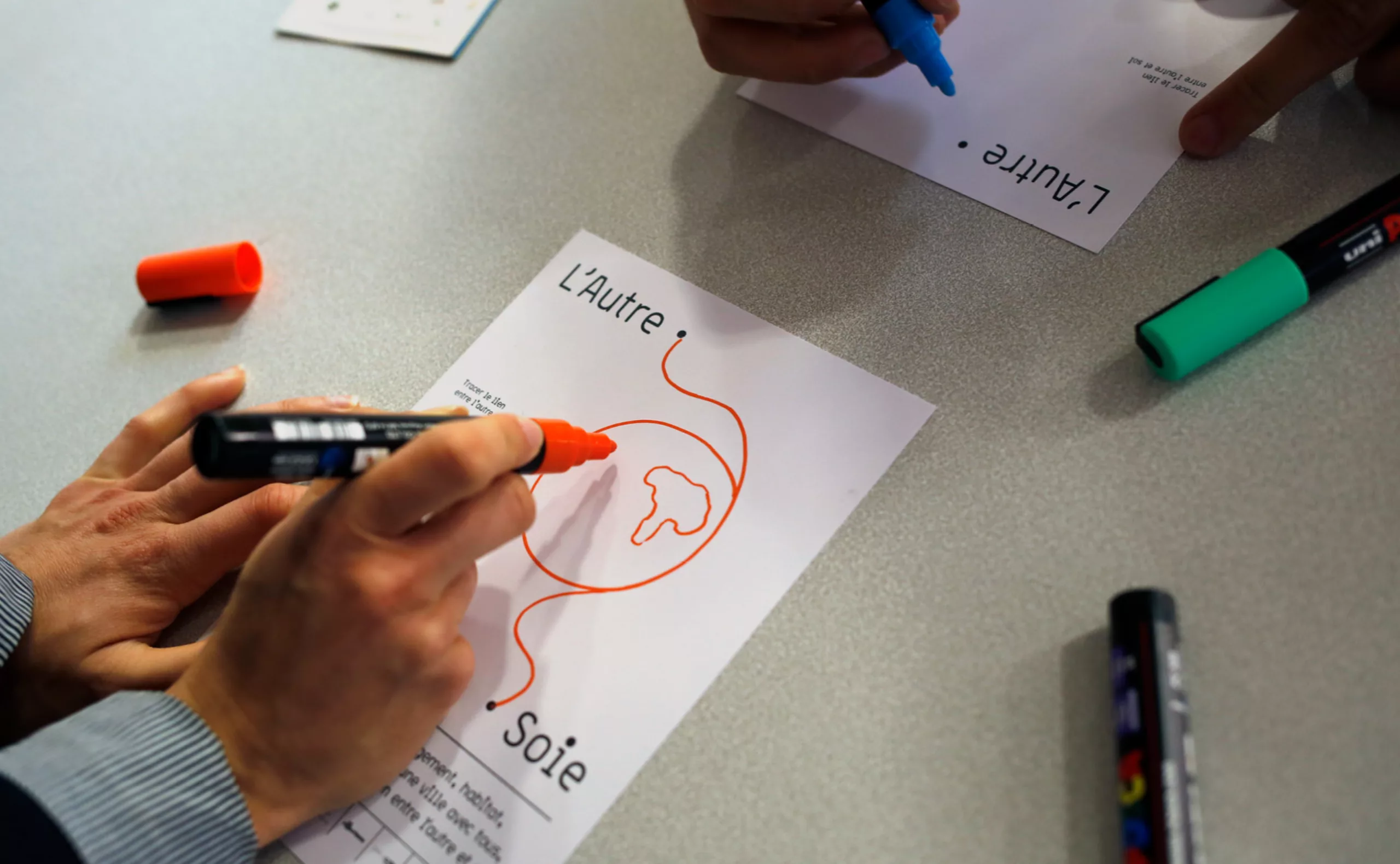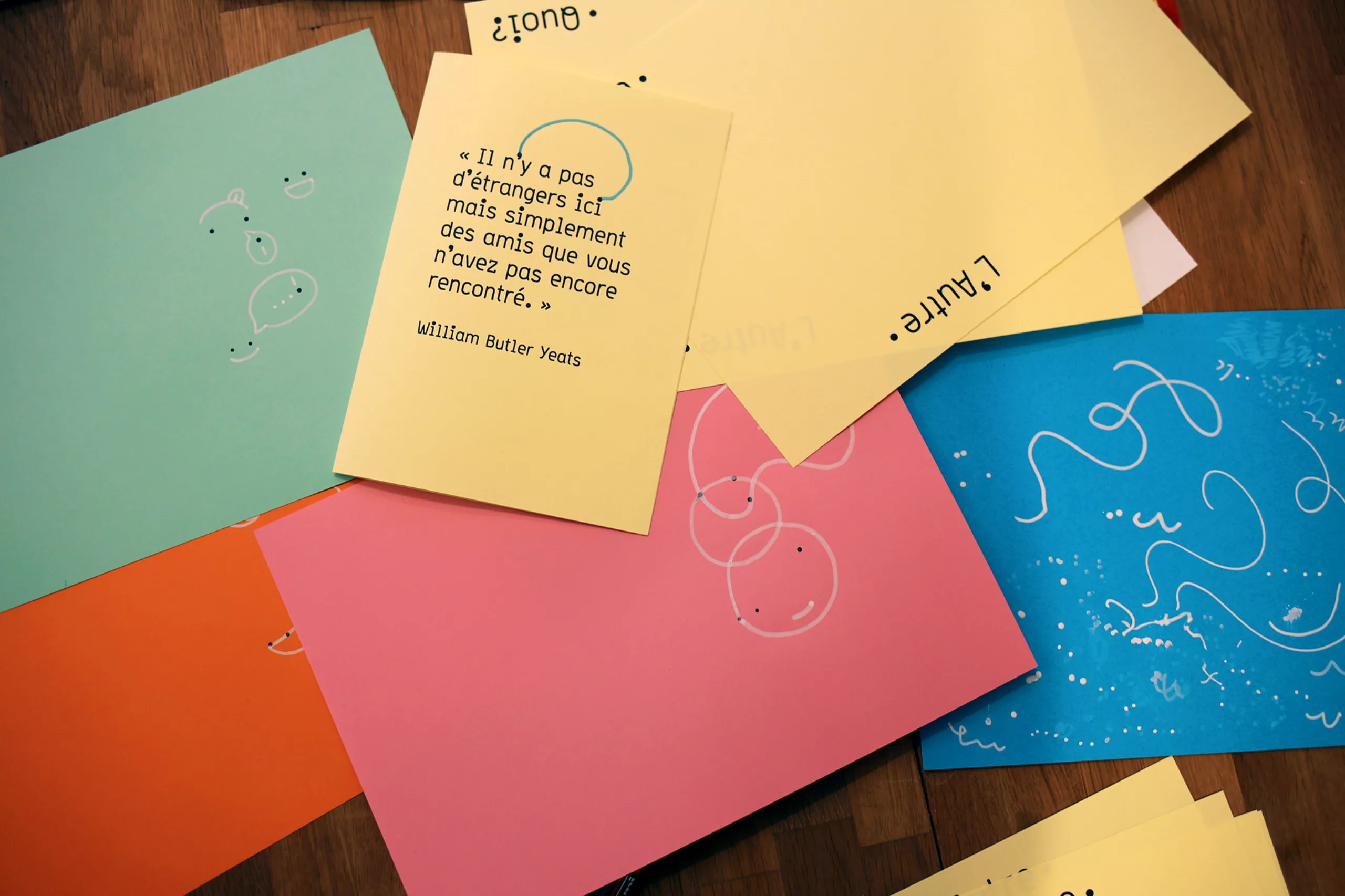En effet, le bâtiment accueillait 150 migrants issus principalement de la jungle de Calais. Après quelques échanges, et malgré la barrière de la langue, nous leur avons demandé d’écrire «L’autre Soie» dans leur langue natale. Déjà que le nom “L’autre Soie” n’est pas évident à comprendre en Français, avec sa double lecture, d’un côté la référence au quartier de la Soie qui tire son nom des nombreuses usines textiles, et puis de l’autre cette notion d’altérité “l’autre et soi”… alors, ne maitrisant ni l’Afghan, ni le Syrien, nous voilà partis dans des tentatives d’explications gestuelles.