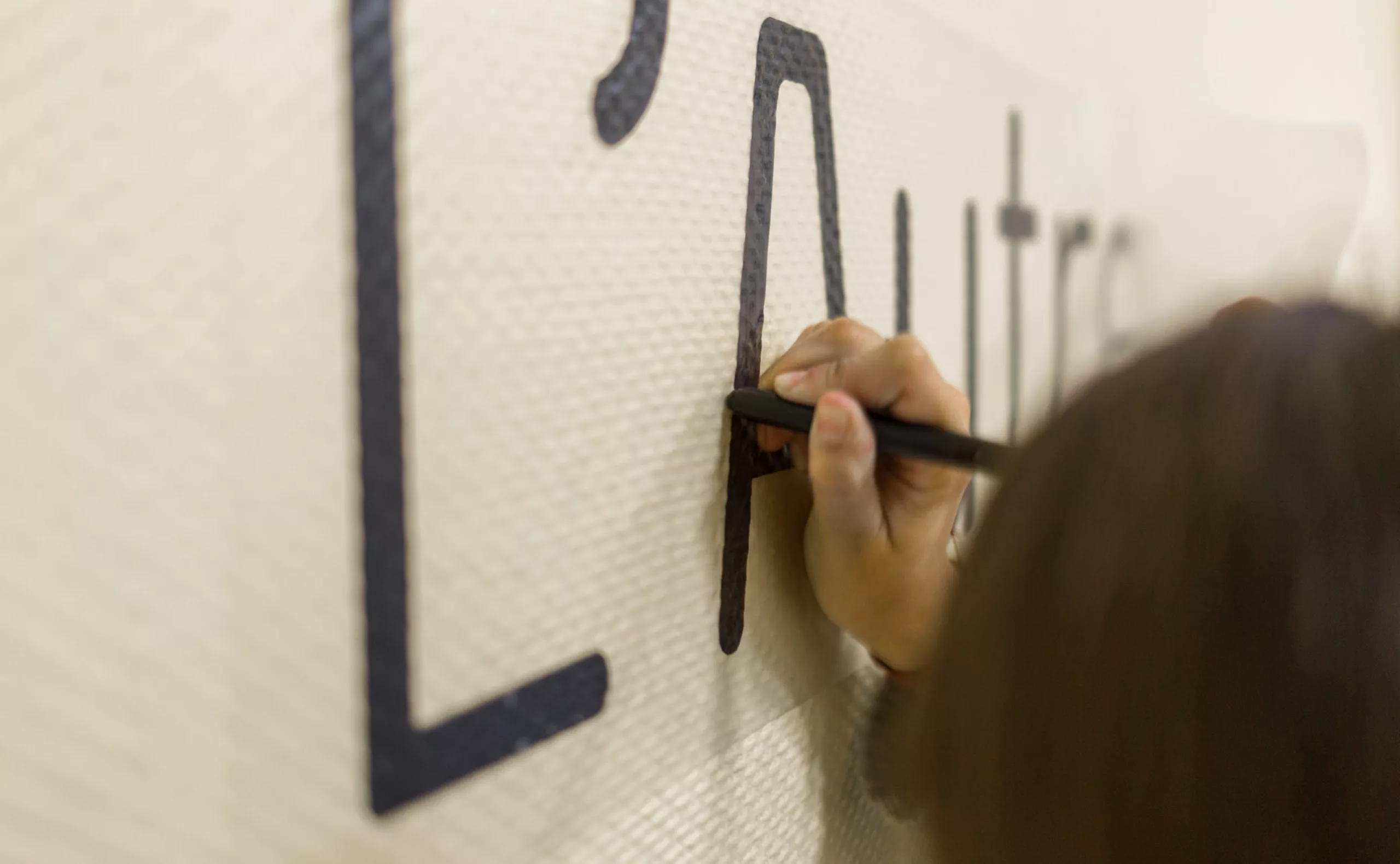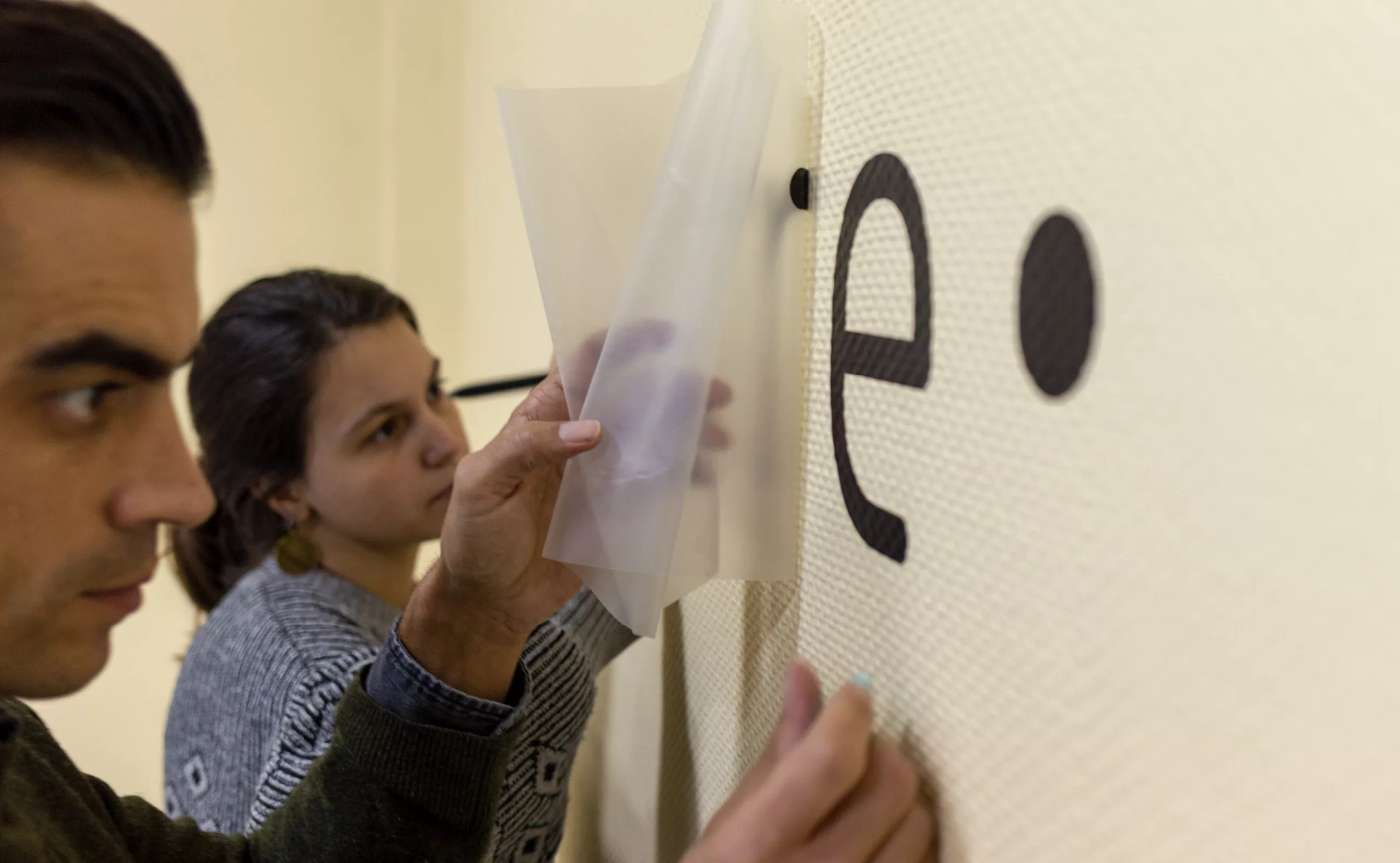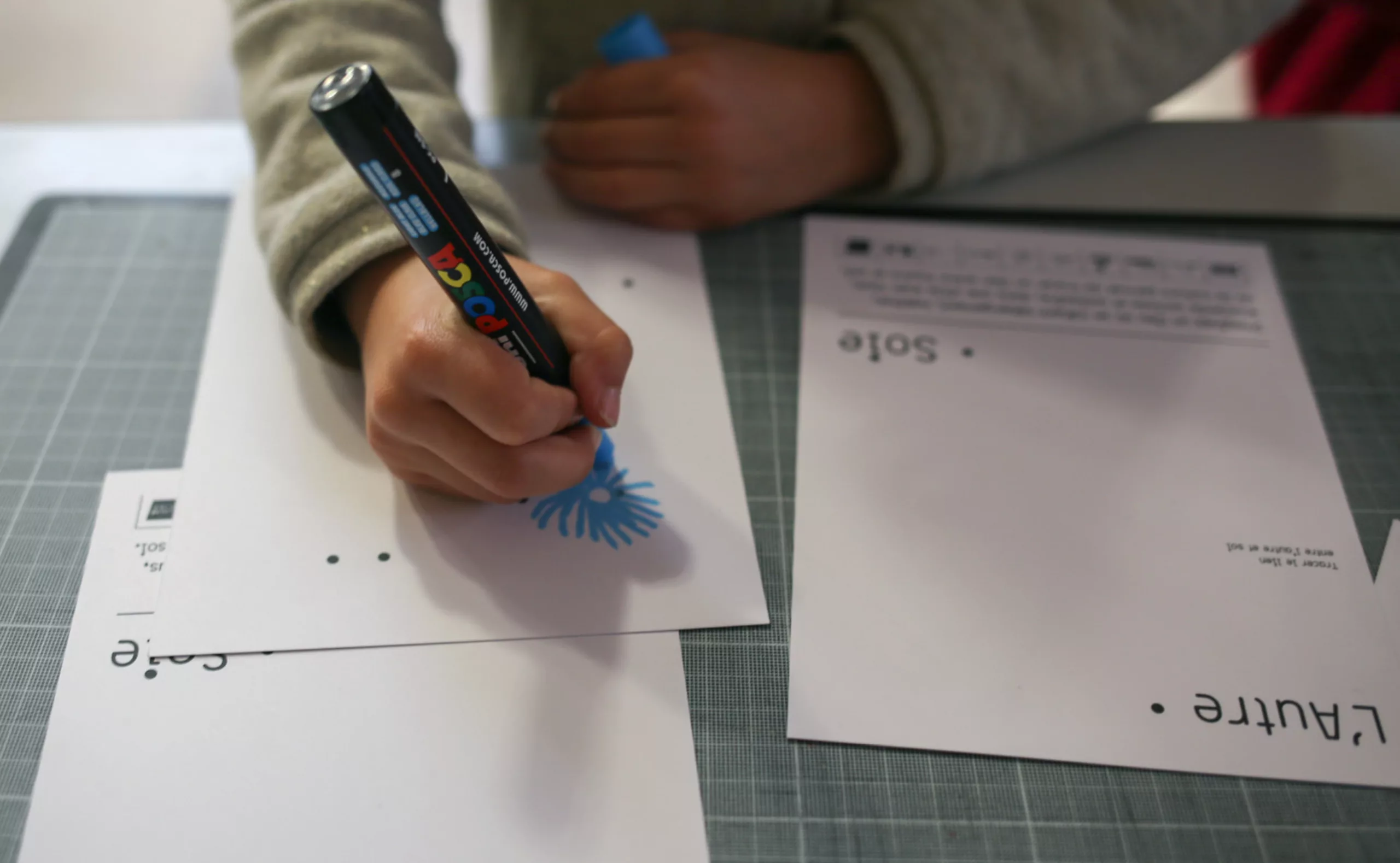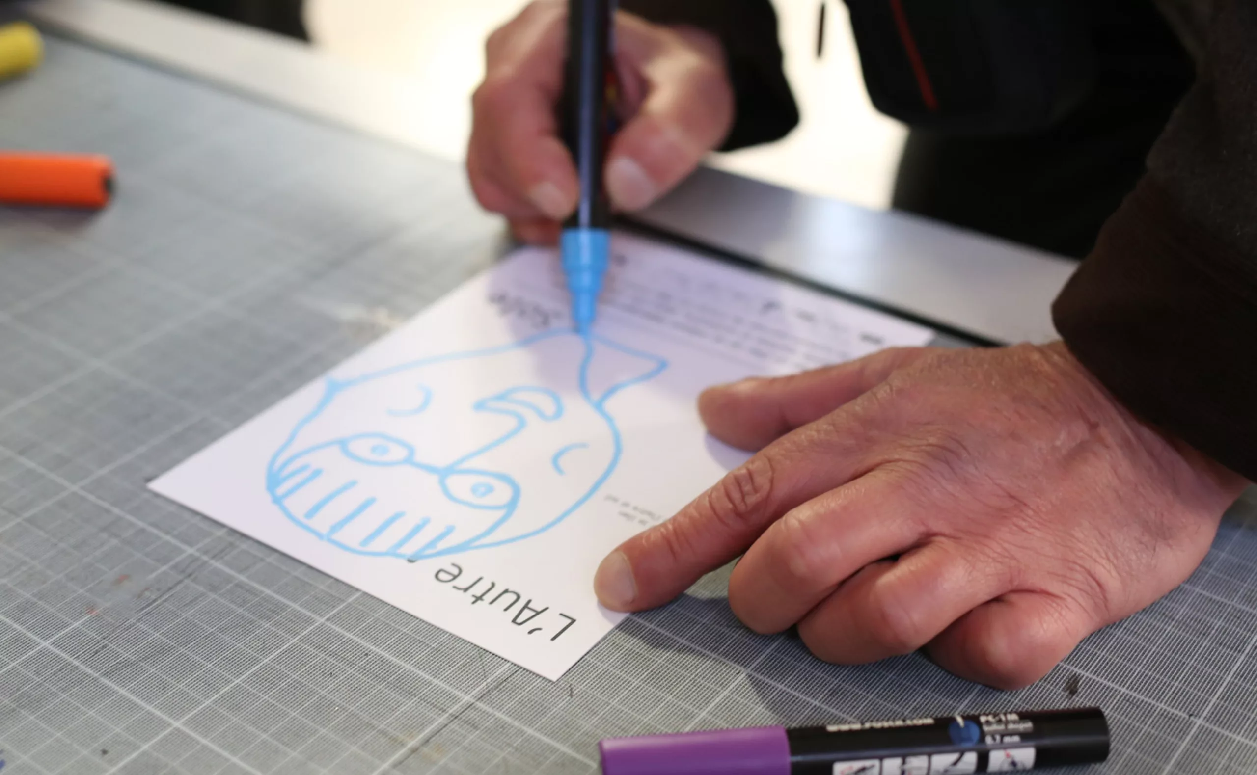 En effet, le bâtiment accueillait 150 migrants issus principalement de la jungle de Calais. Après quelques échanges, et malgré la barrière de la langue, nous leur avons demandé d’écrire «L’autre Soie» dans leur langue natale. Déjà que le nom “L’autre Soie” n’est pas évident à comprendre en Français, avec sa double lecture, d’un côté la référence au quartier de la Soie qui tire son nom des nombreuses usines textiles, et puis de l’autre cette notion d’altérité “l’autre et soi”… alors, ne maitrisant ni l’Afghan, ni le Syrien, nous voilà partis dans des tentatives d’explications gestuelles.