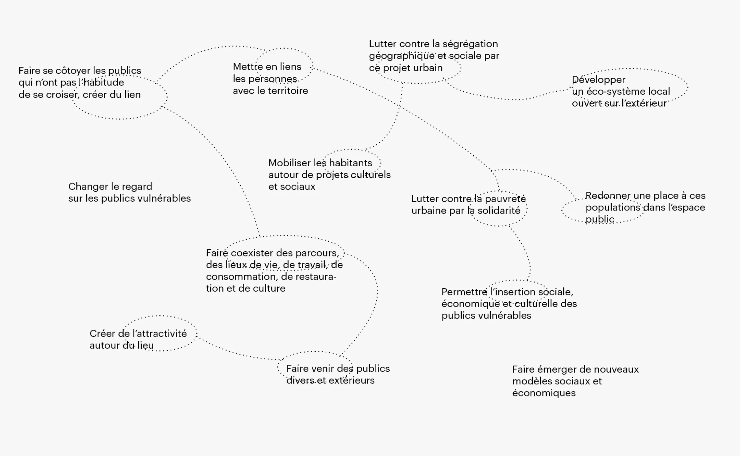 Au départ, il y a cette intuition que la ville est un lieu d’interactions denses et intenses où il faut remettre l’humain au cœur du projet urbain. Il faut donc repenser les usages de la ville, sur l’imagination d’actions nouvelles centrées sur l’habiter et le faire-ensemble. Pour une ville ouverte à tous.