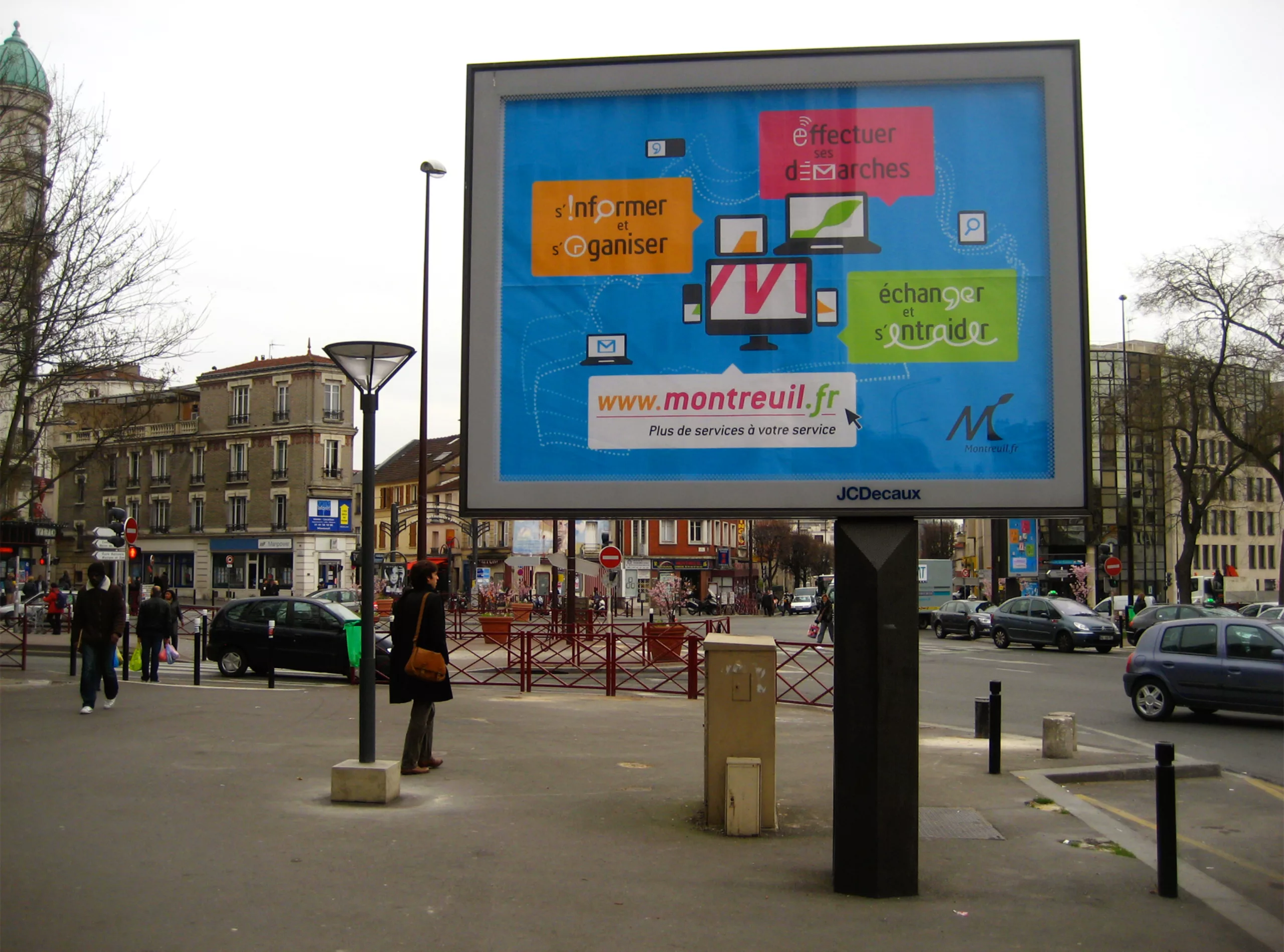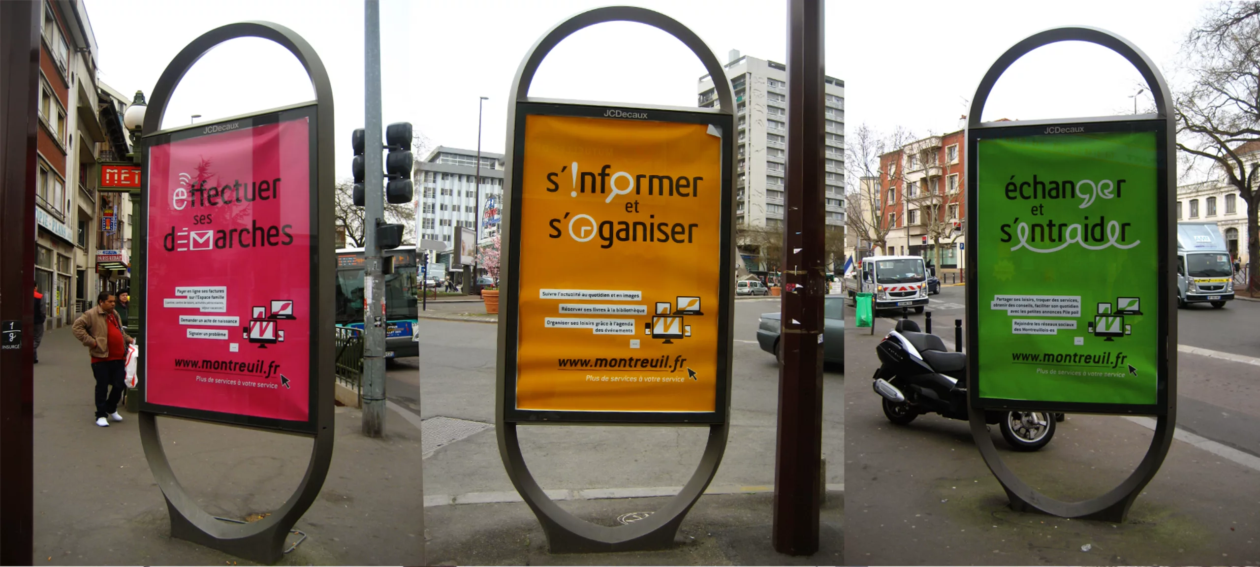 Voici la campagne d’affichage que nous venons tout juste de réaliser pour promouvoir le site de la ville de Montreuil. La campagne s’articule sur trois affiches 40 x 60 et une affiche senior qui synthétise les trois accroches : “effectuer ses démarches”, “s’informer et s’organiser” et “échanger et s’entraider”. Le parti pris graphique est minimaliste puisque chaque visuel est réalisé à partir d’astuces typographiques contenues dans les mots des accroches. Les lettres se transforment en pictogrammes, se ligaturent… ce qui permet de renforcer le sens et la promesse du message.