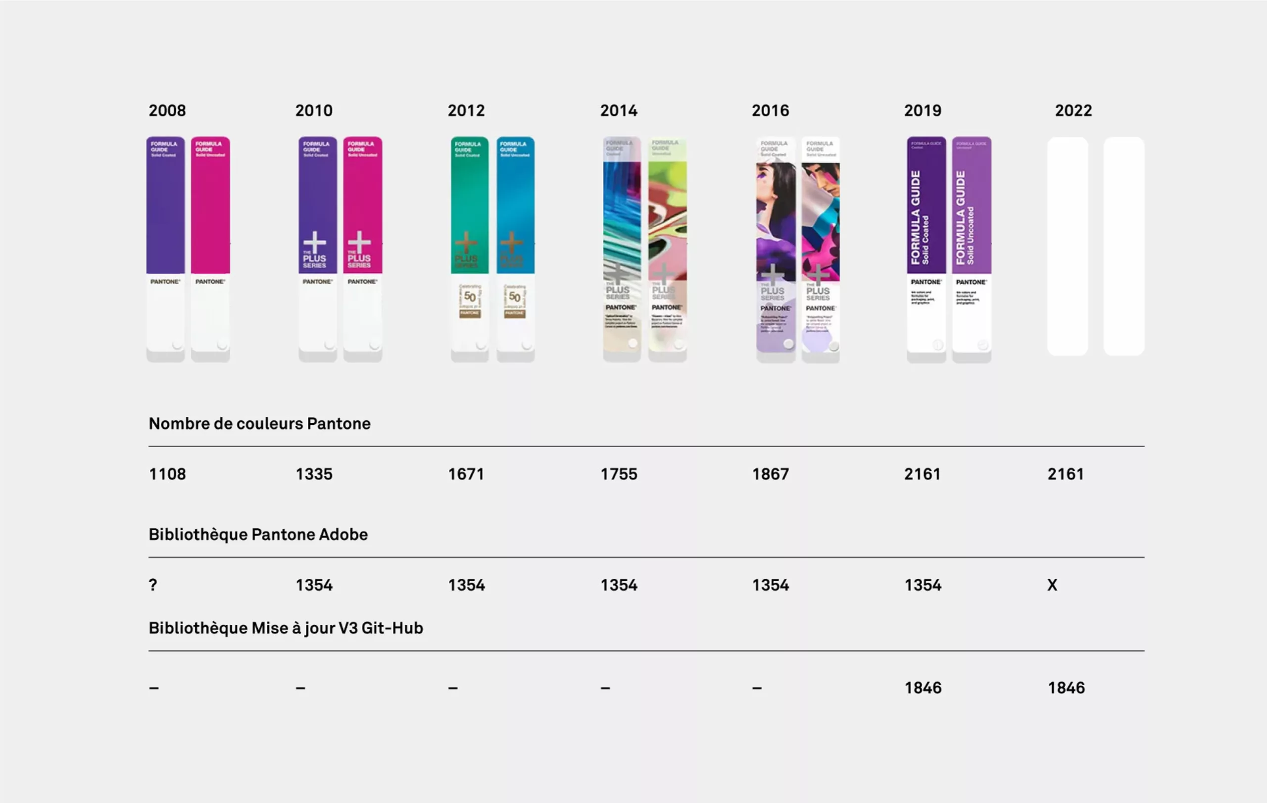 D’ailleurs, les références pantone disponibles dans la bibliothèque de nuance d’Adobe datent d’une dizaine d’années. Elles n’ont jamais été mise à jour, sont incomplètes. Il manque des centaines de nuances, et leurs conversion en quadrichromie ne sont plus toutes justes. En effet, Pantone à pu revoir ses calibrations de couleurs, avec le temps, en fonctions des évolutions techniques et des nouveaux standards colorimétriques.