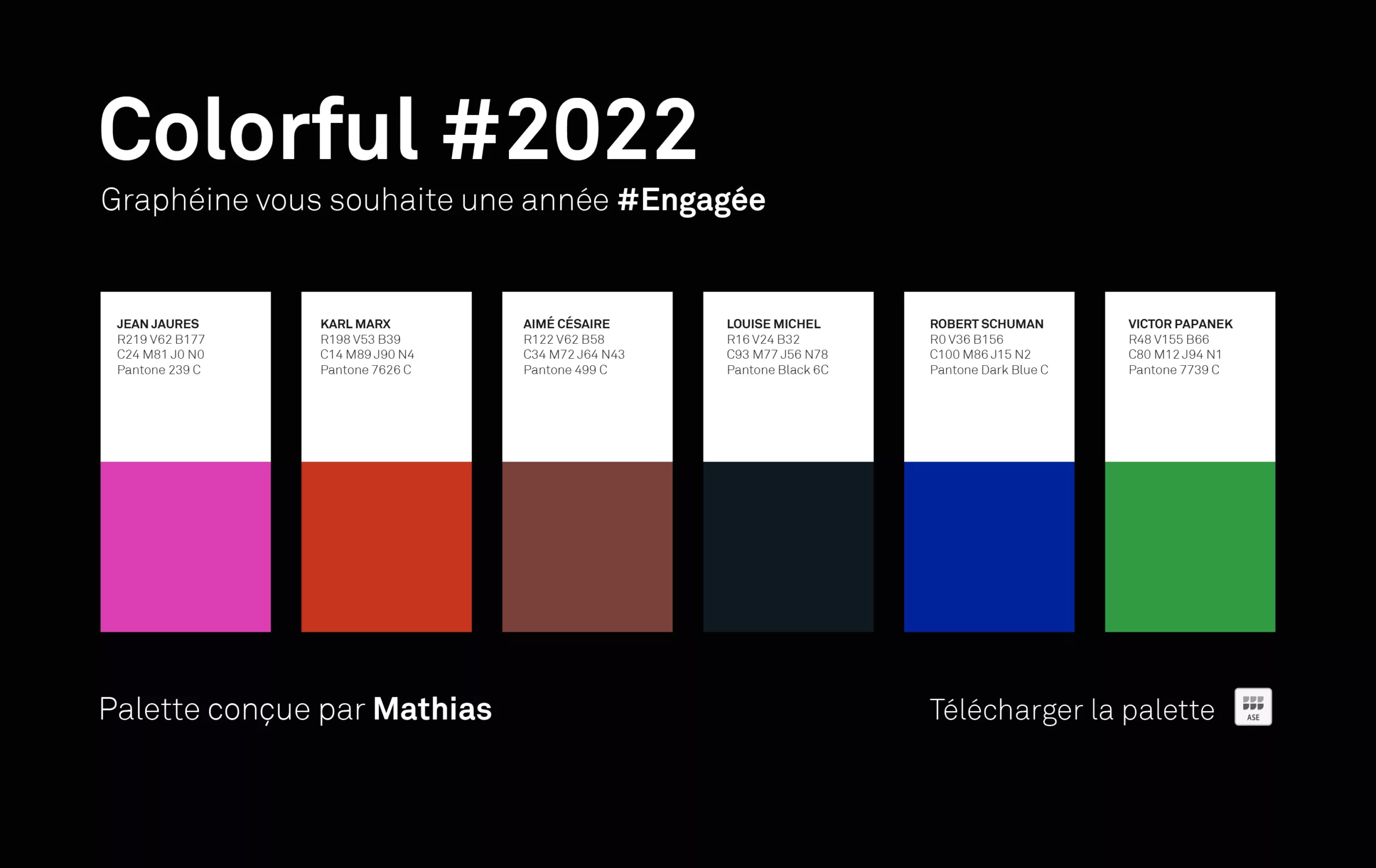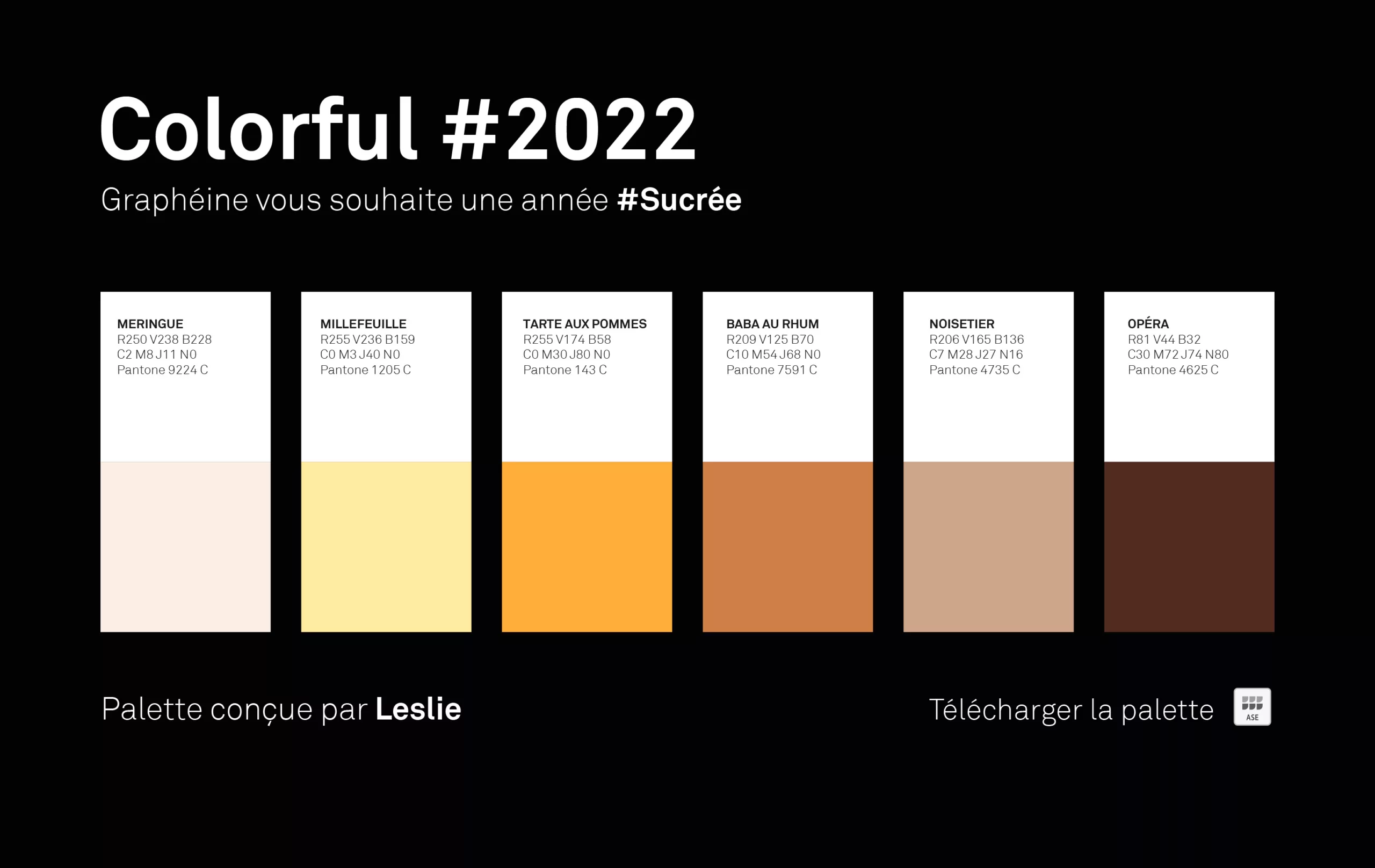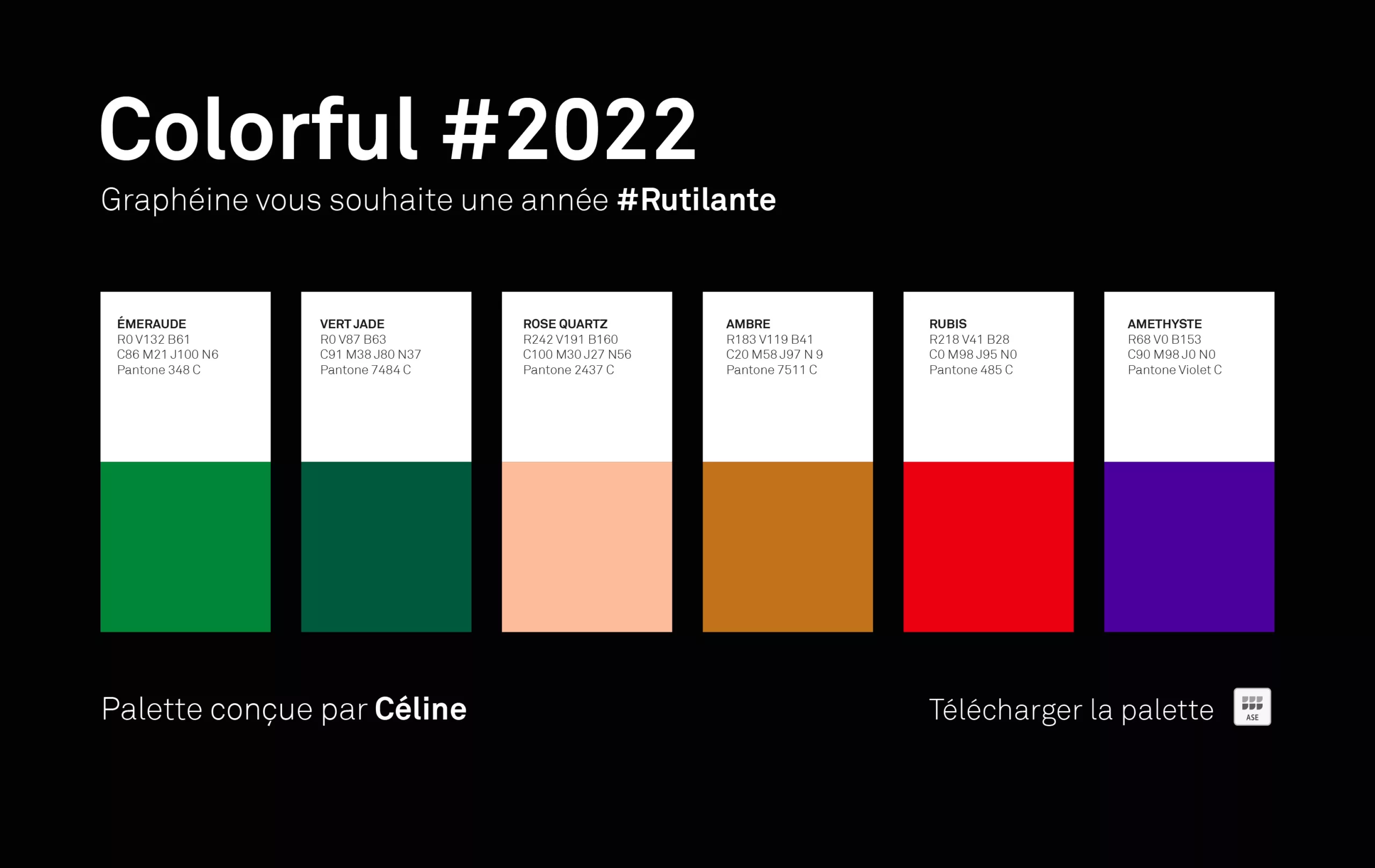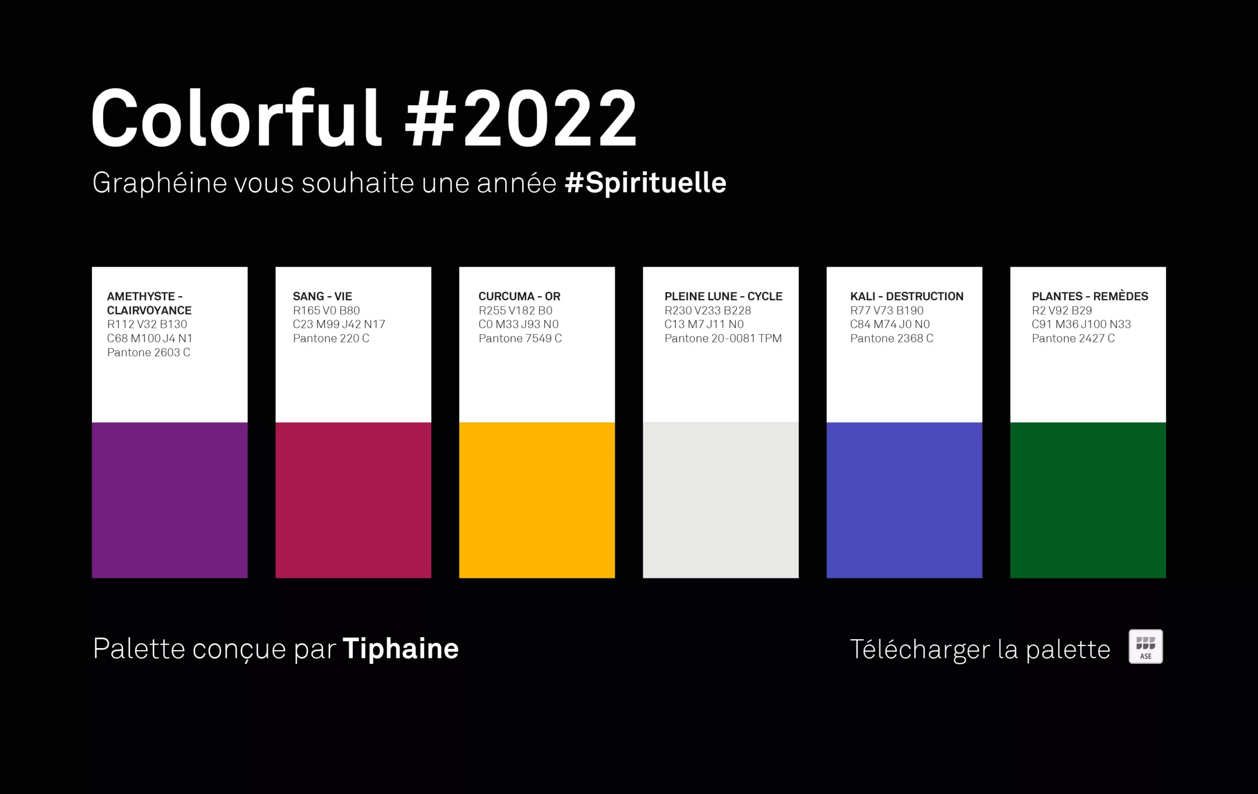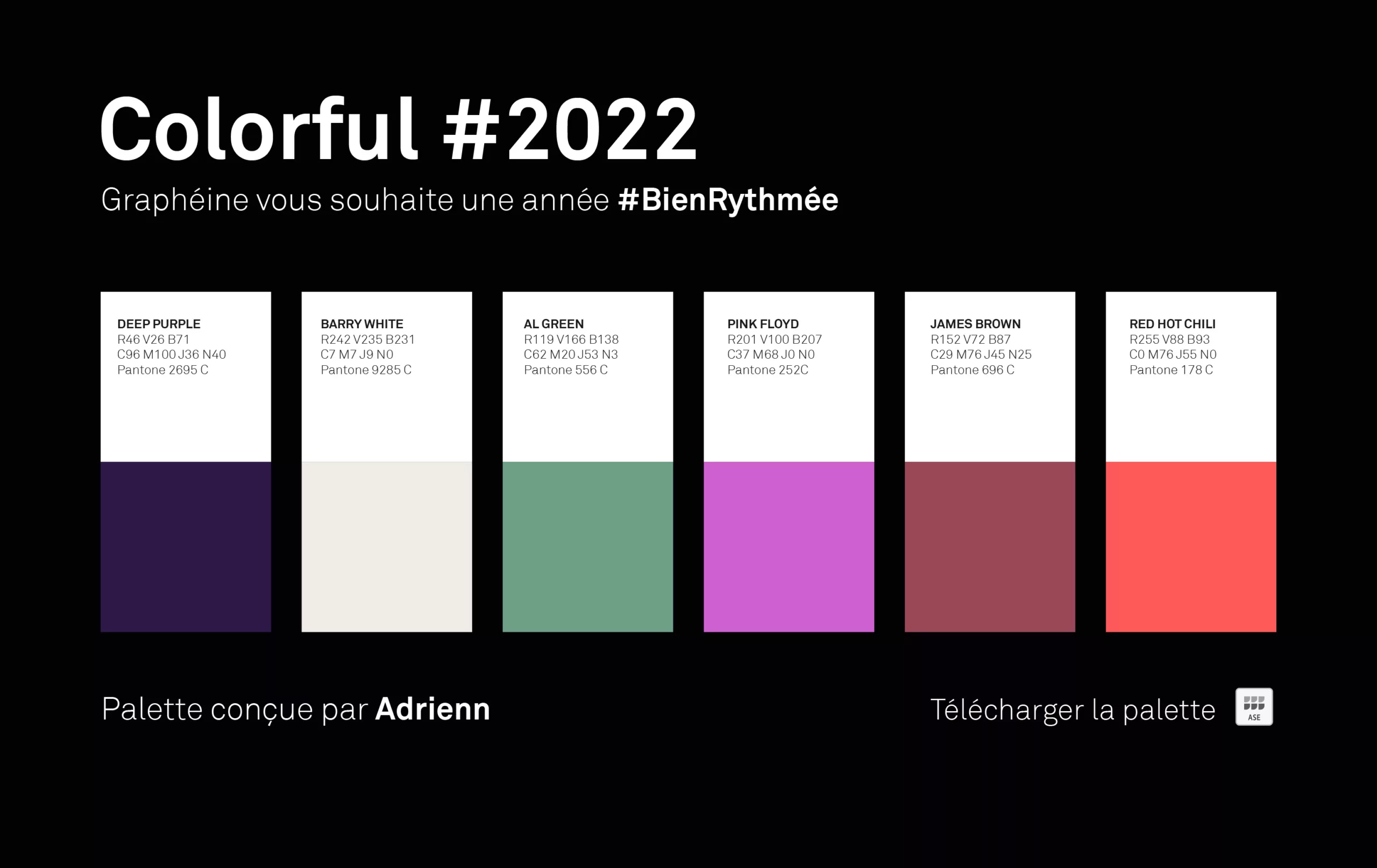 Libre à vous de les rajouter dans votre palette de couleurs Adobe, et de partager vos nuances pour 2022 avec le #Grapheinemetdespalettesdansmavie sur les réseaux.