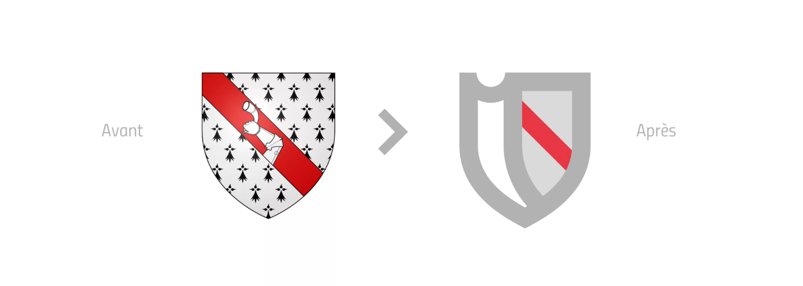 Jusqu’ici, la ville utilisait son blason historique en guise de logo. Outre que cela encrait son image dans le passé, ce blason offrait un contre-sens en arborant le symbole de l’hermine, issu d’un lointain héritage Breton du seigneur local. Le blason historique était ainsi fait “d’hermine à la bande de gueules chargée d’un senestrochère armé d’argent mouvant du bord dextre de la bande, tenant un huchet du même”, dans le jargon précis de l’héraldique !