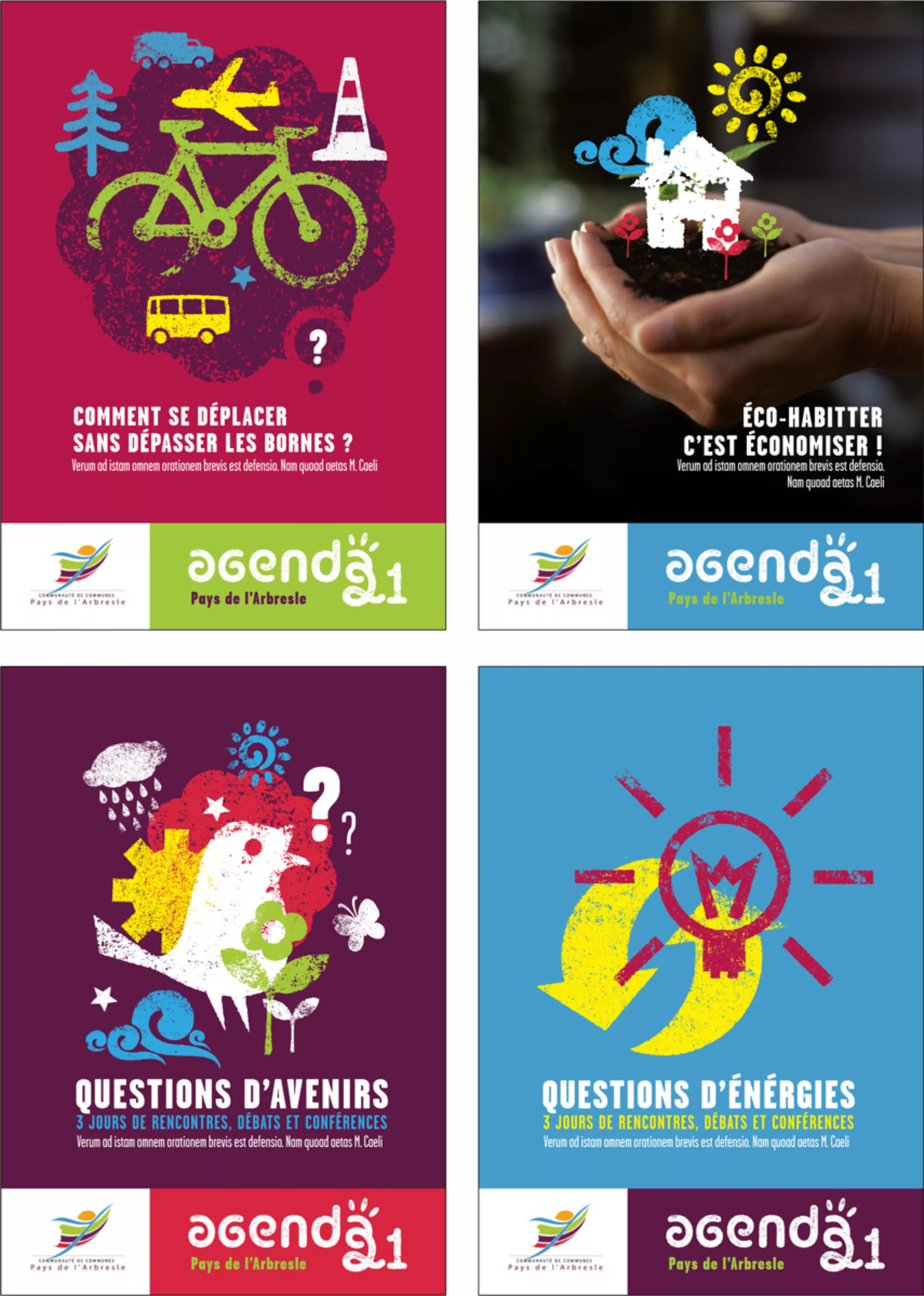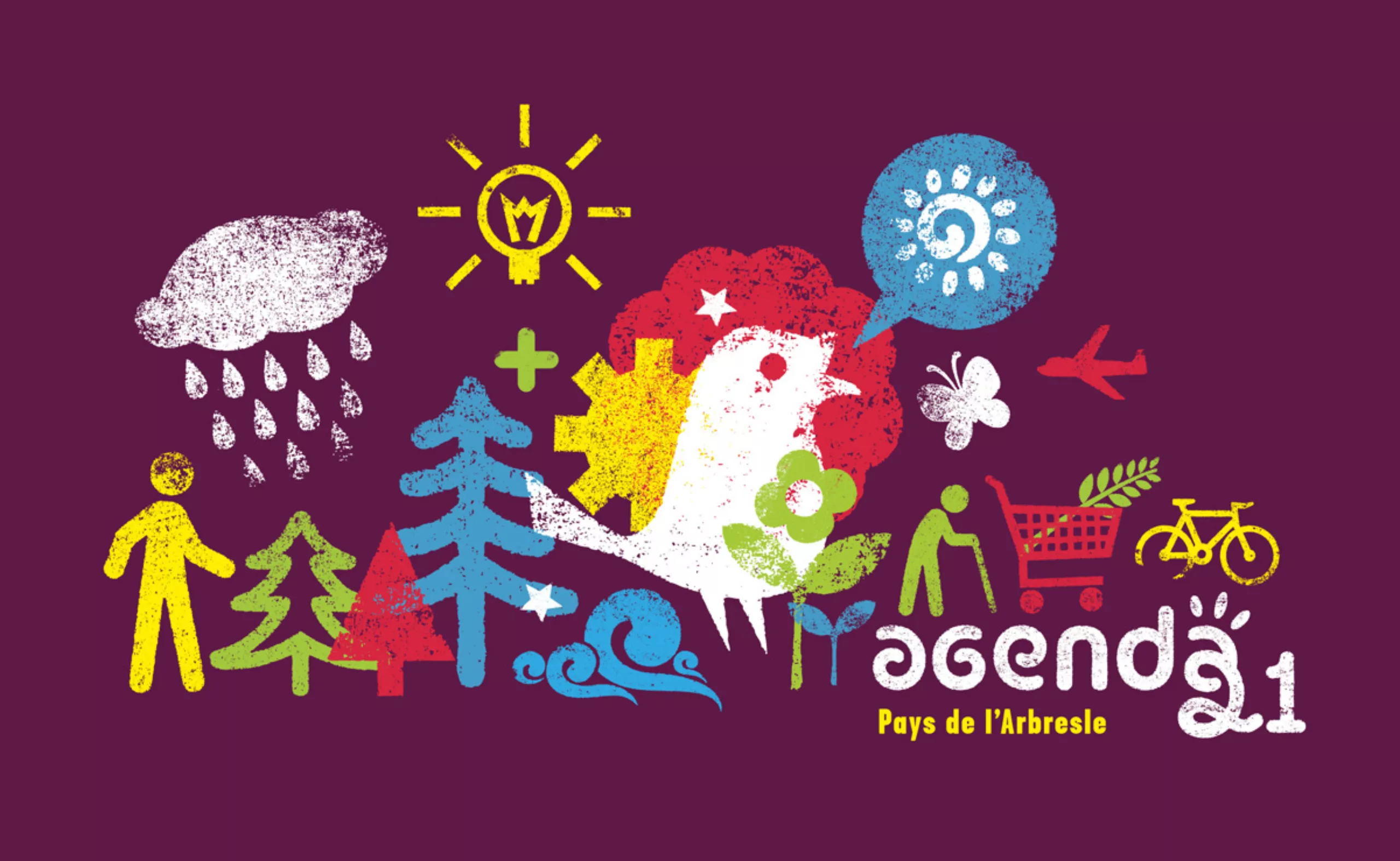 Il s’agissait de créer l’identité visuelle de l’Agenda 21 du Pays de l’Arbresle. L’Agenda 21 est un plan d’action pour le XXIe siècle adopté par les chefs d’État lors du sommet de la Terre, à Rio, en 1992. Son objectif est de mettre en oeuvre progressivement et de manière pérenne le développement durable à l’échelle d’un territoire. Dans notre cas, il est porté par la Communauté de Communes du Pays de l’Arbresle (69) et mené en concertation avec tous ses acteurs : élus, habitants, associations, entreprises…