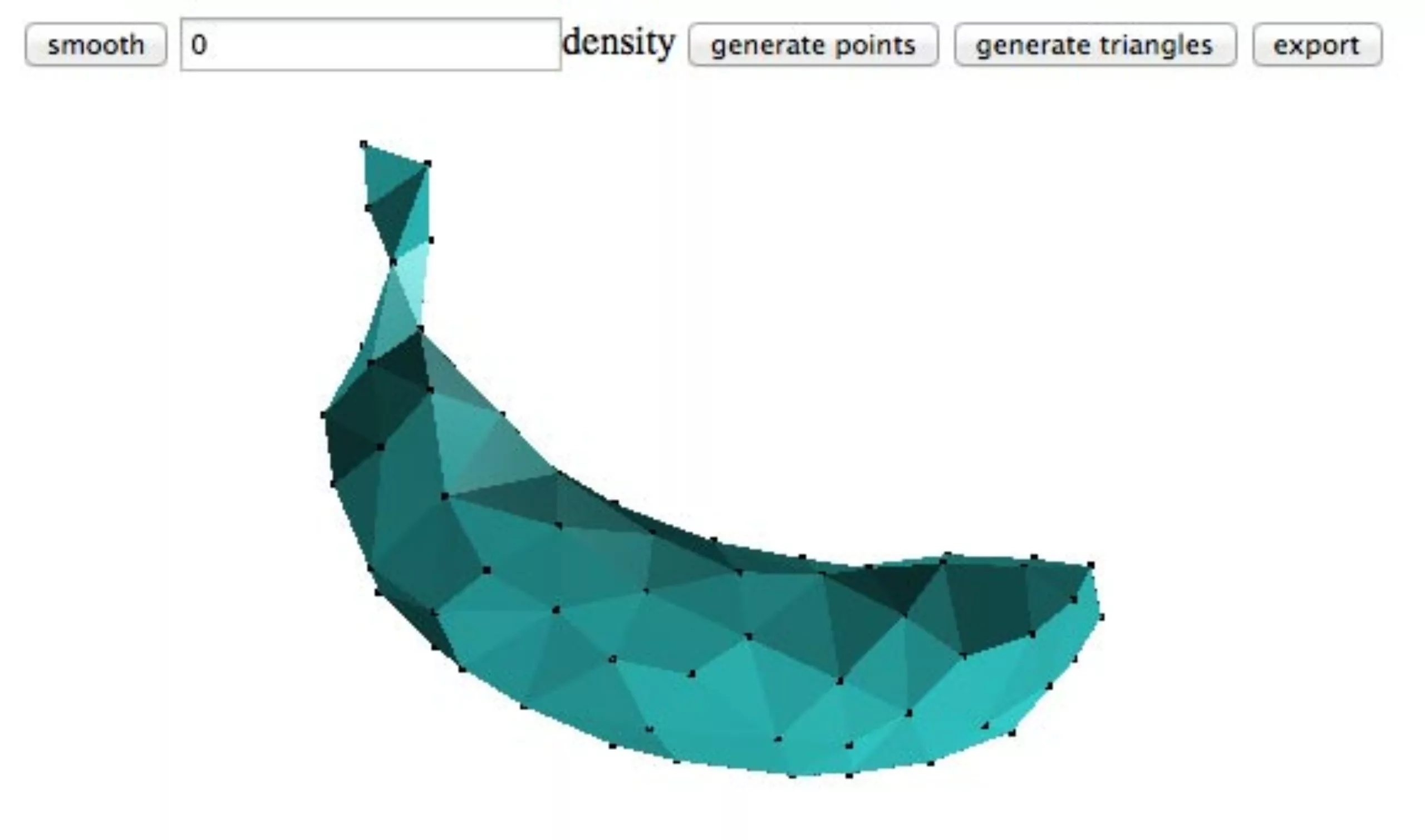 Ensuite on va réduire la résolution du modèle 3D. On va donc utiliser cet outil en ligne : http://n-e-r-v-o-u-s.com/projects/remesh/ ( sous Chrome de préférence, ça bug sous safari… ). En chargeant notre fichier obj, on va donc découvrir notre banane full-res.