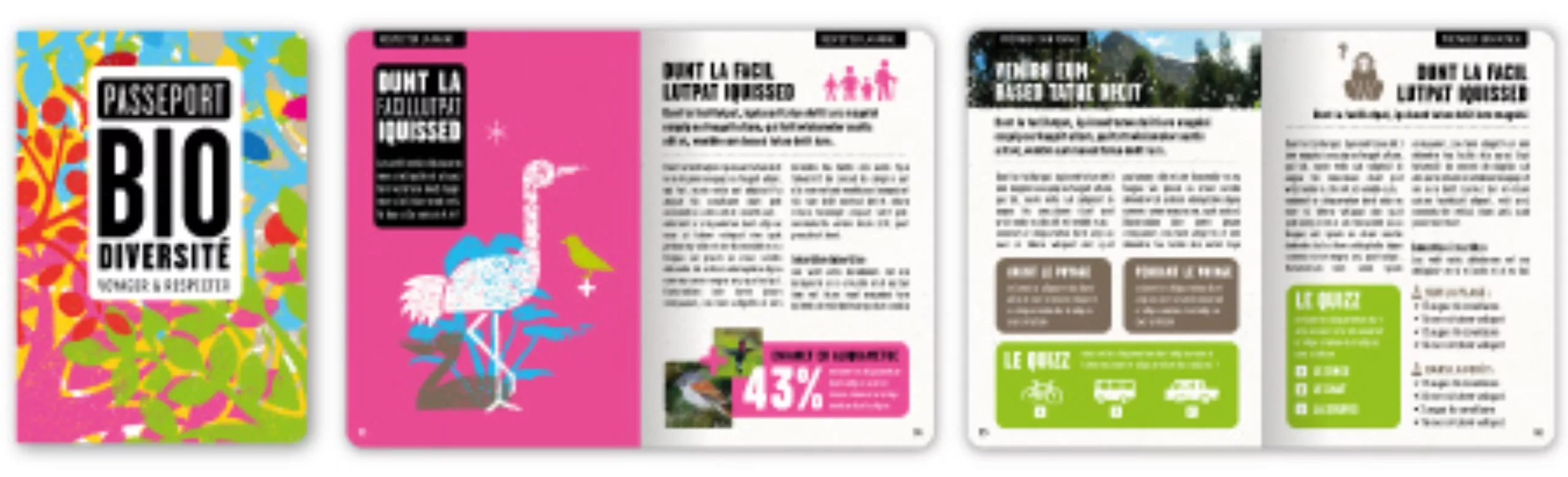 Présenté sous la forme d’un passeport, le design du document se base sur des illustrations, des pictogrammes et des tampons multicolores. L’enchevêtrement des illustrations rappelle la richesse de la biodiversité plus dense qu’en métropole. Lorsque les images se chevauchent, les superpositions créent de nouvelles couleurs évoquant ainsi l’interdépendance et l’harmonie des espèces.