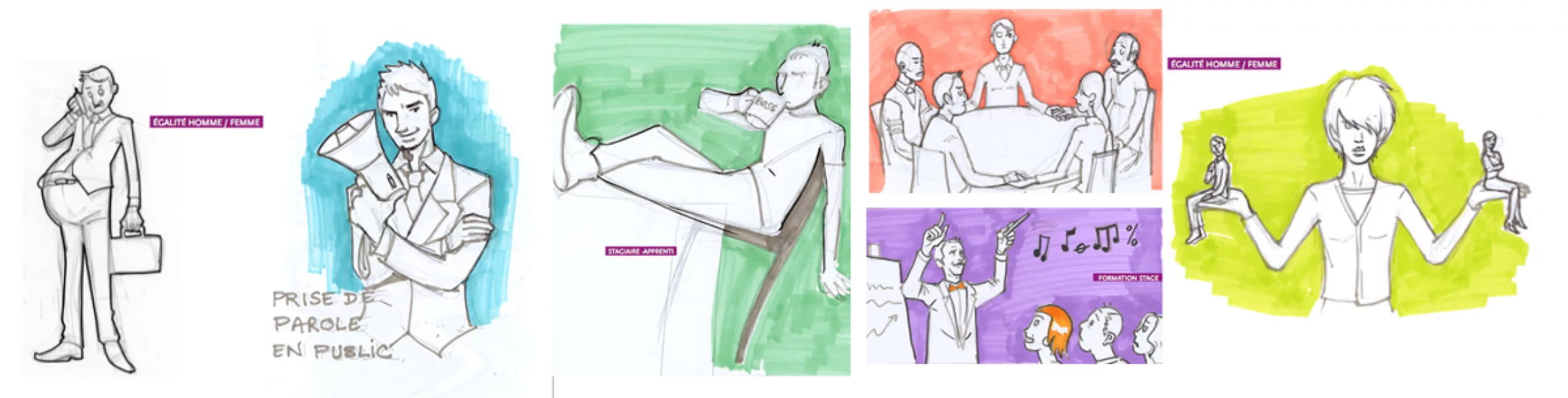 La première partie du travail consiste à répertorier les principaux thèmes à illustrer ( ex:Prise de parole en public, égalité homme femme, gestion de crise…). Afin de simplifier la séance photo, des croquis sont réalisés. Ils nous permettent de dialoguer avec le client autour des concepts, et également de bien préparer en amont la séance photo ( accessoires, stylisme vêtements, …).