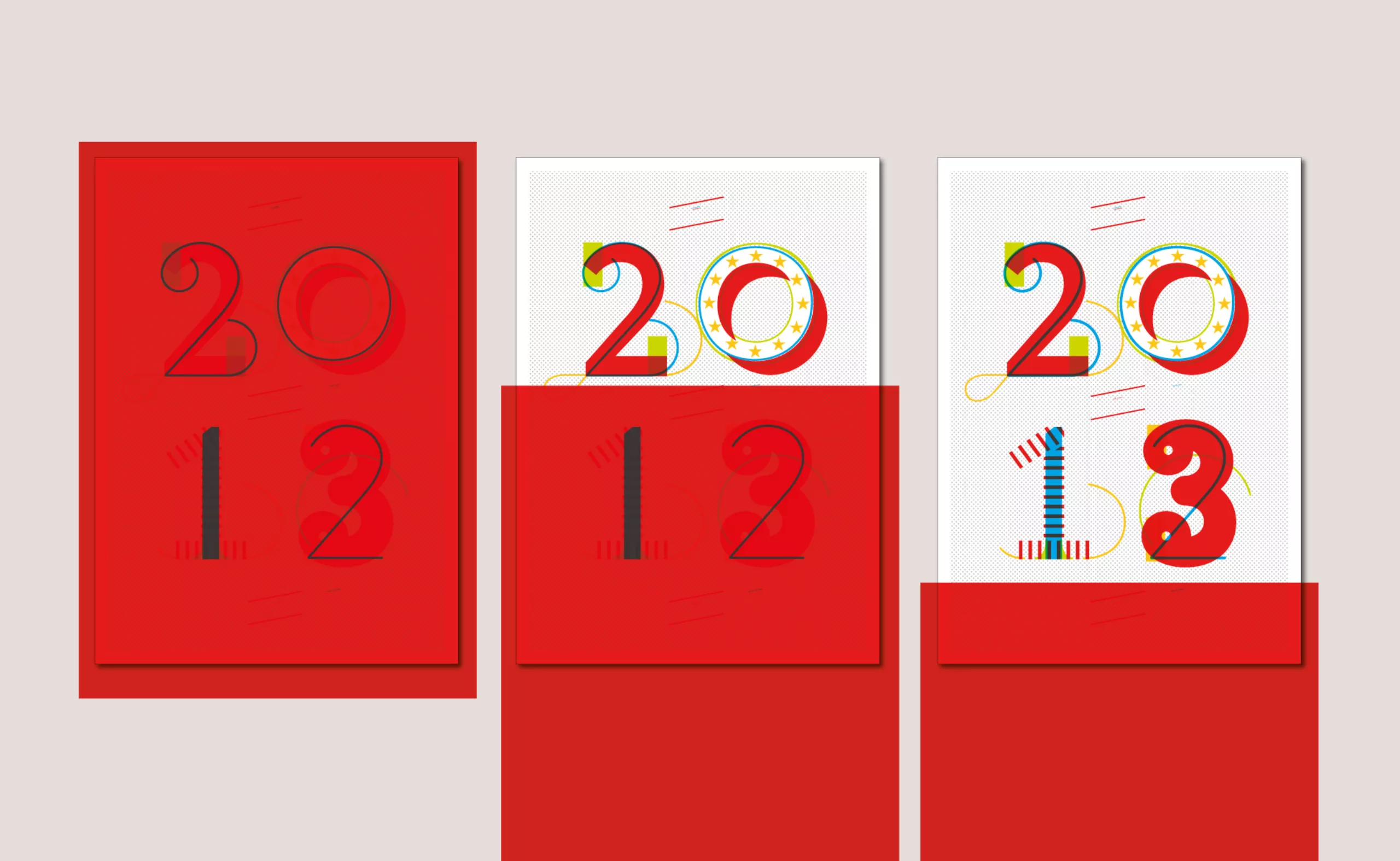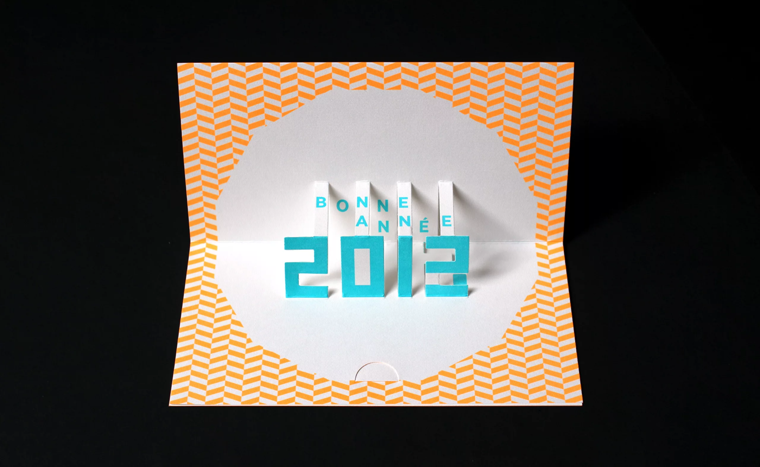 Nous proposions une carte qui laisse apparaître le chiffre 2013 lors de l’ouverture de celle-ci en jouant sur un procédé technique faisant apparaitre ou disparaitre une partie du message… l’enveloppe en calque rouge «masque» l’encre rouge de la carte. Fermé on peut lire 2012, ouvert on lit 2013.