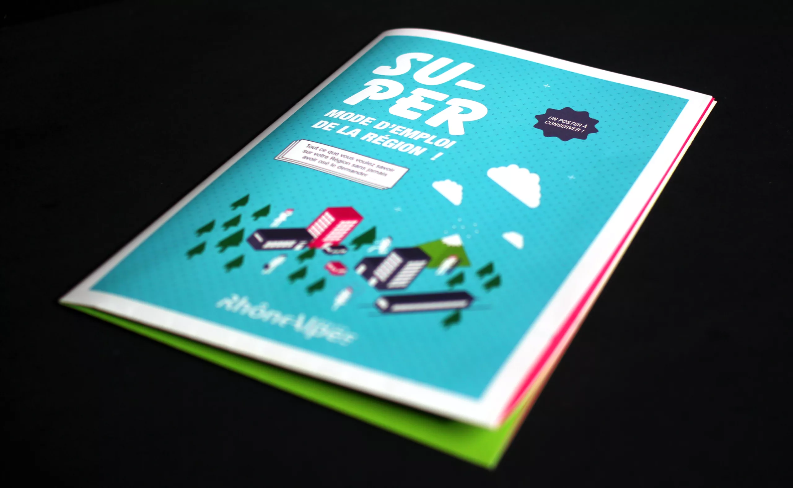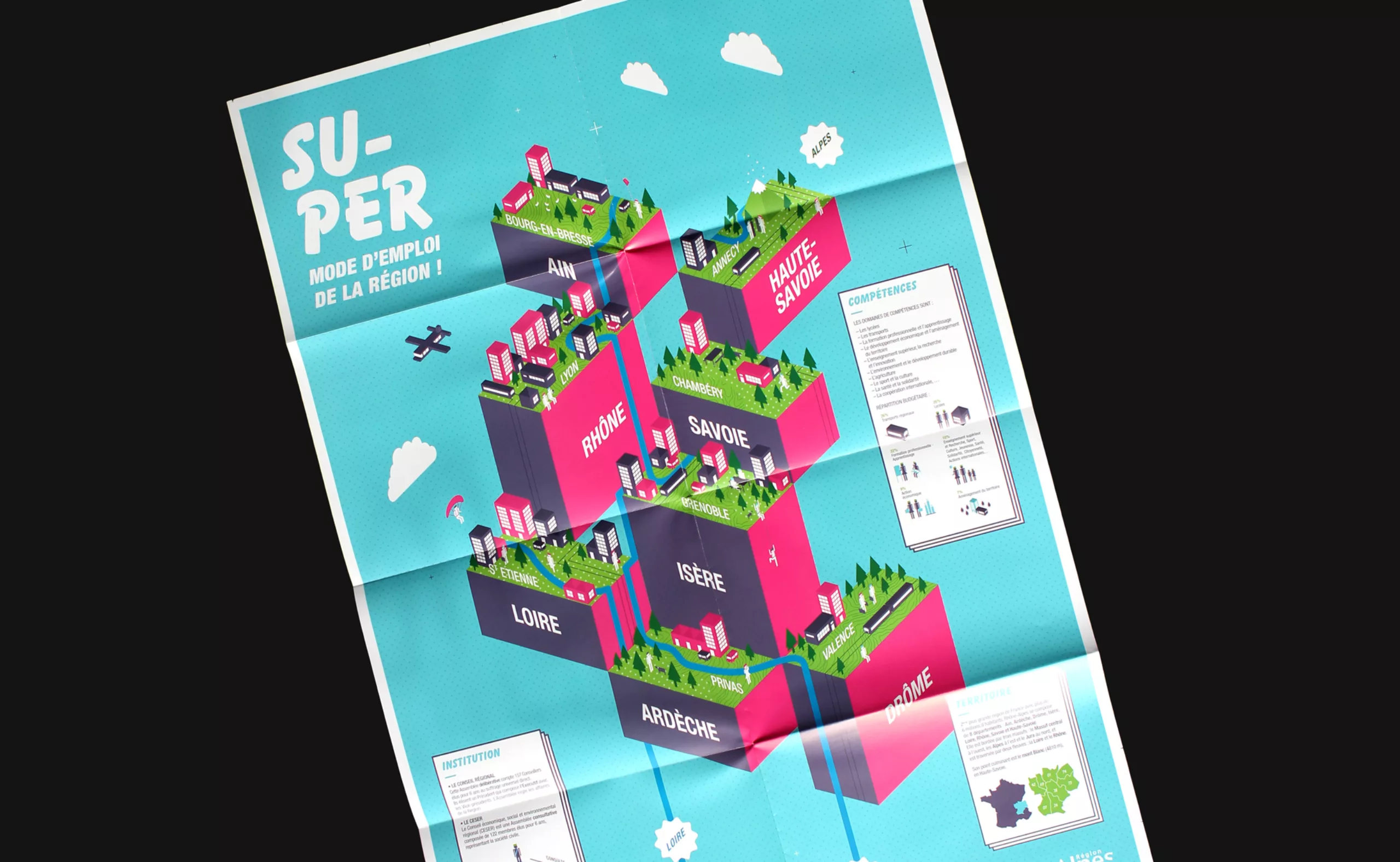 Un dépliant-affiche présentant le fonctionnement de la Région Rhône-Alpes à destination des lycéens.