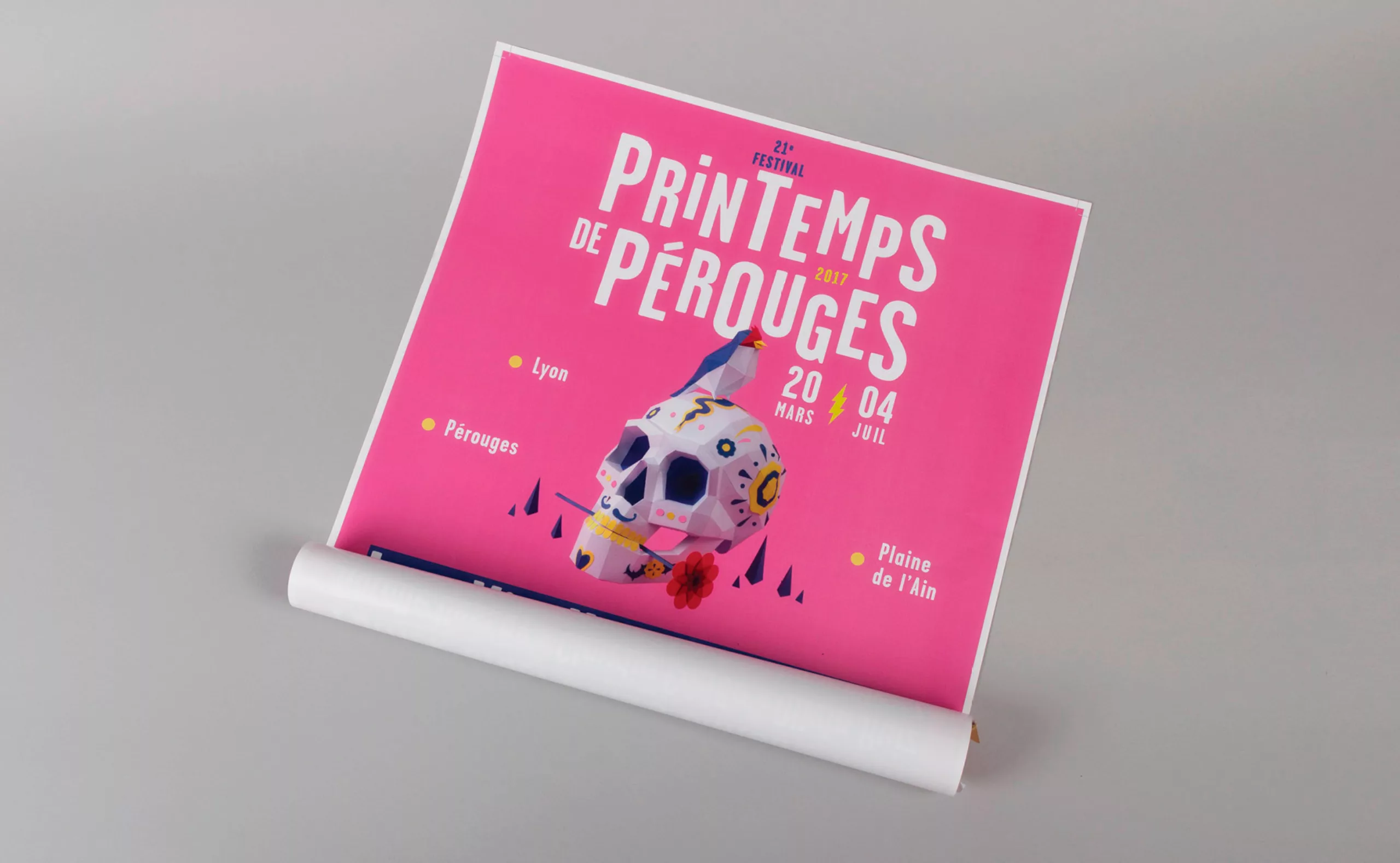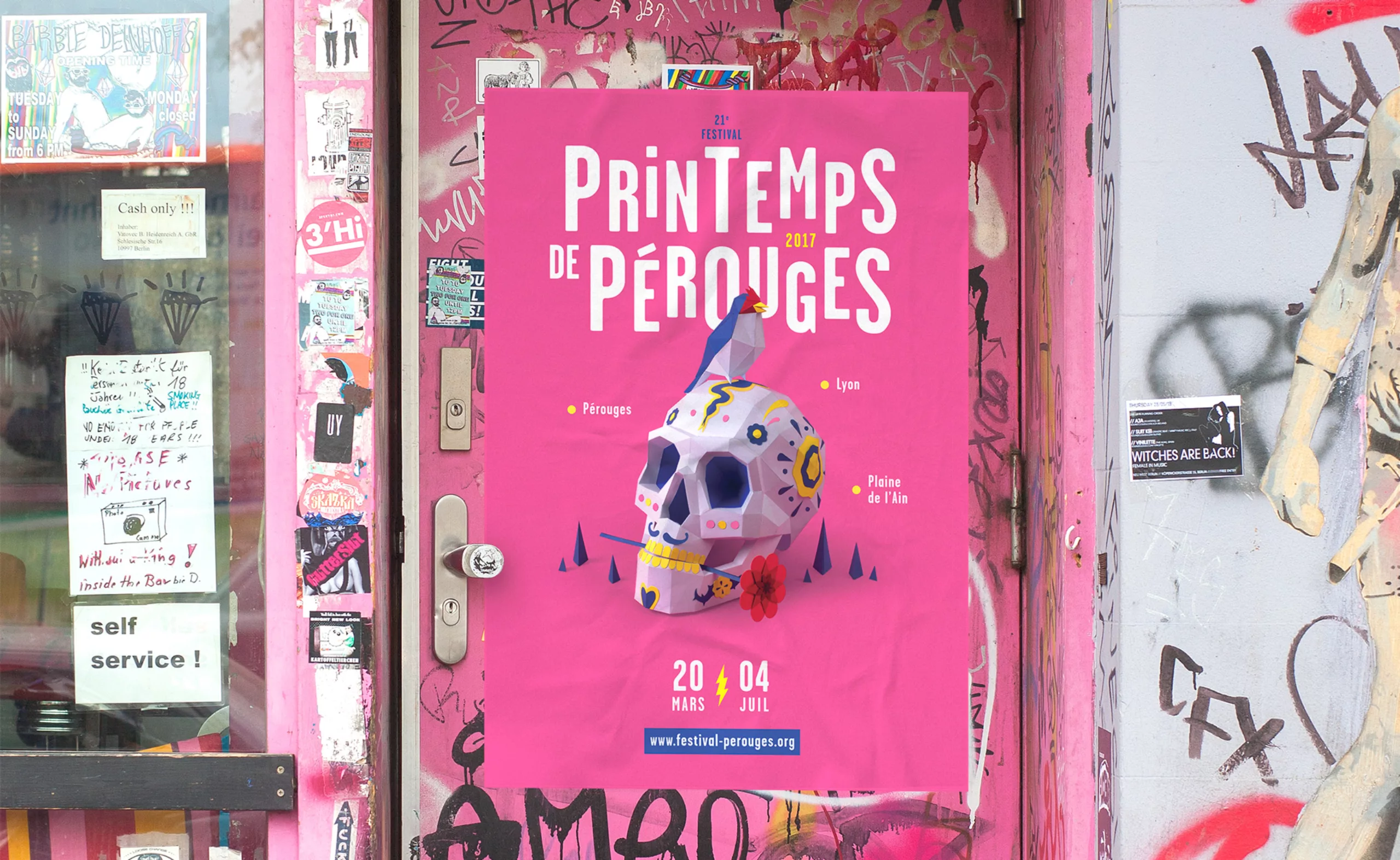 CultureCréation de l’affiche du Festival du Printemps de Pérouges. Déclinaison de l’identité à travers tous les supports, autour d’un crâne mexicain rock’n sweet.