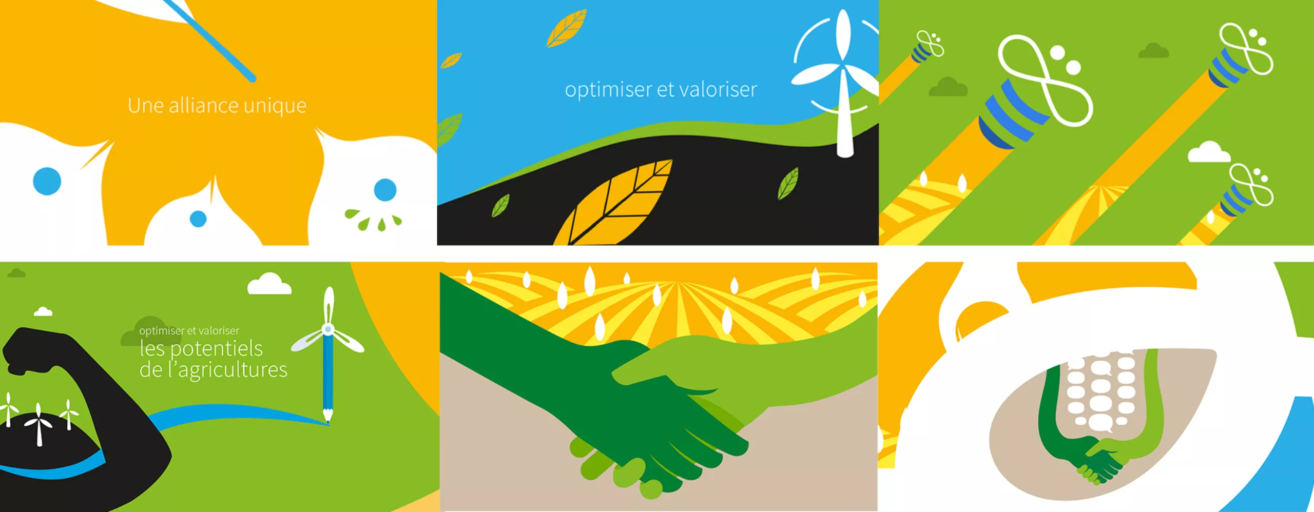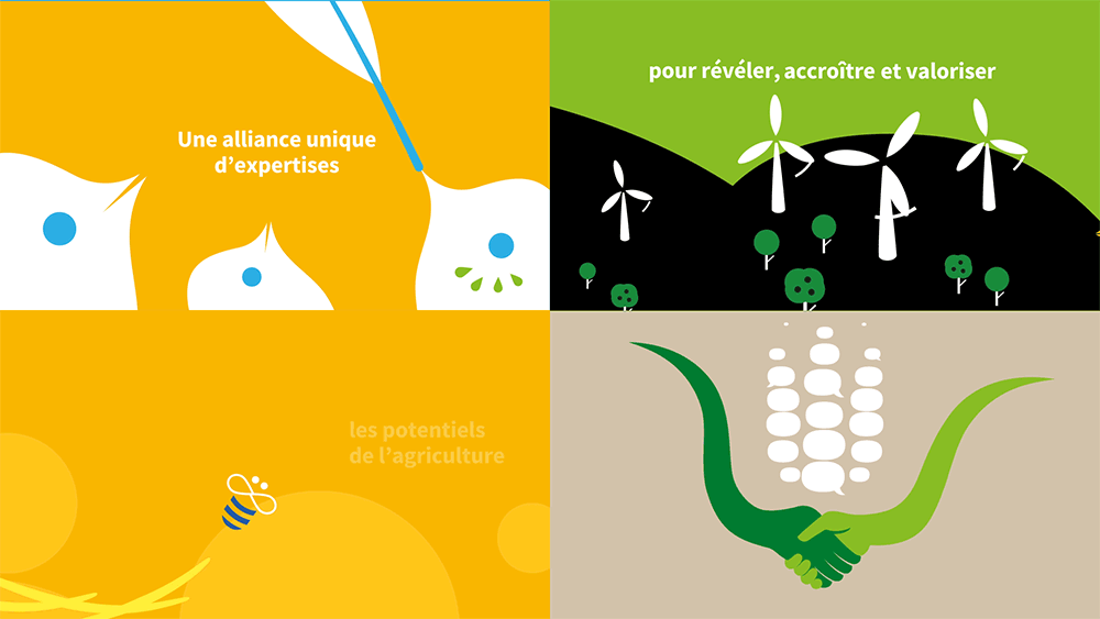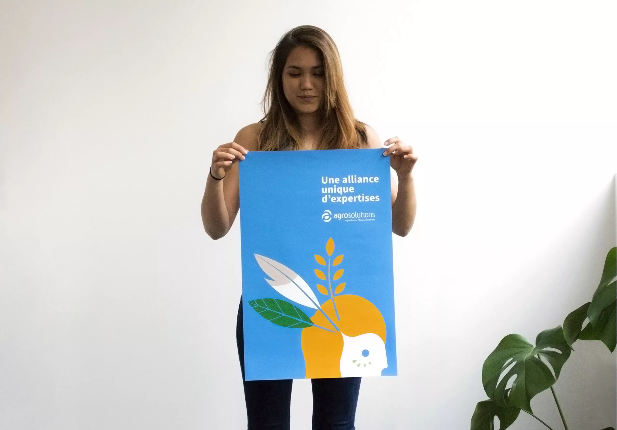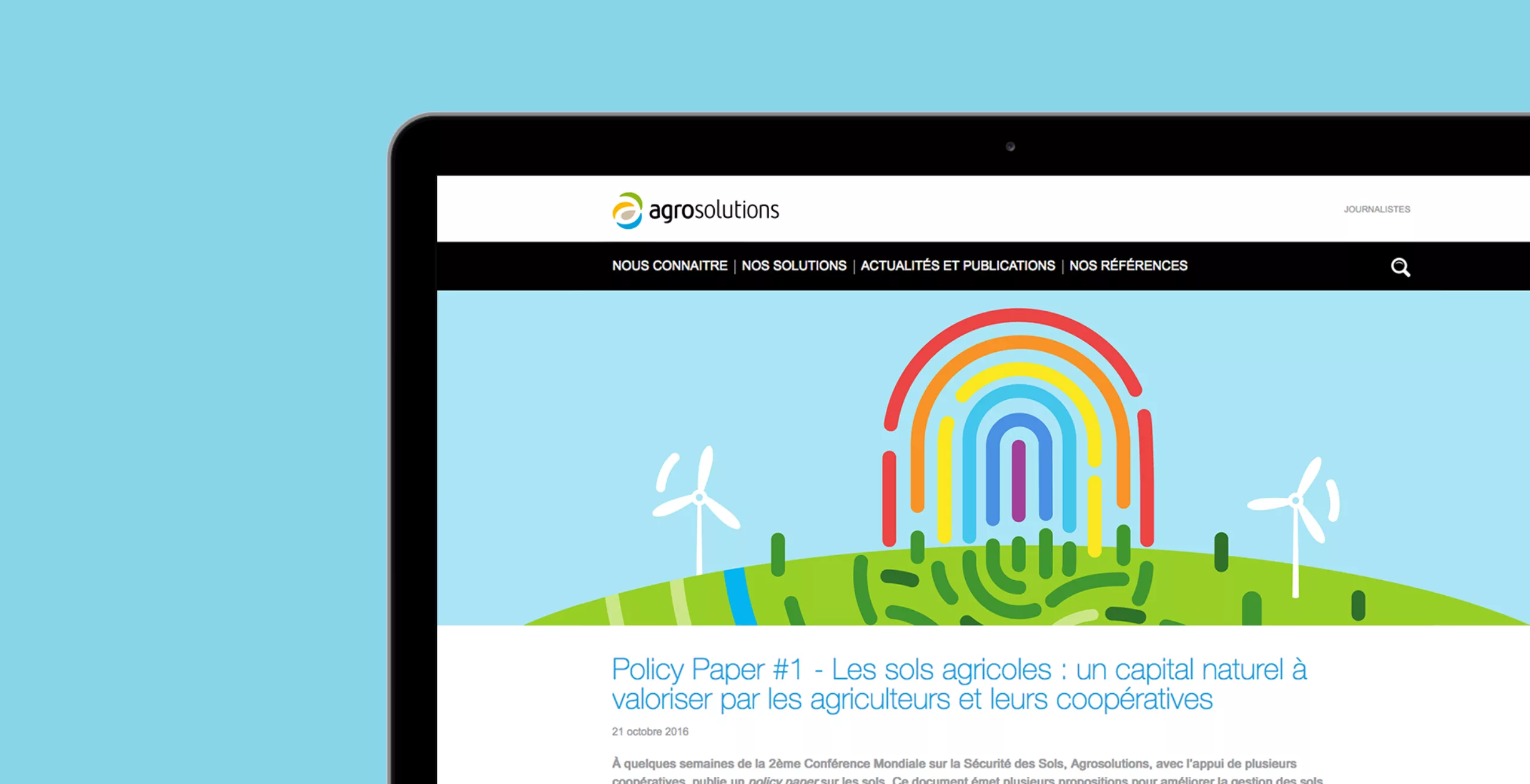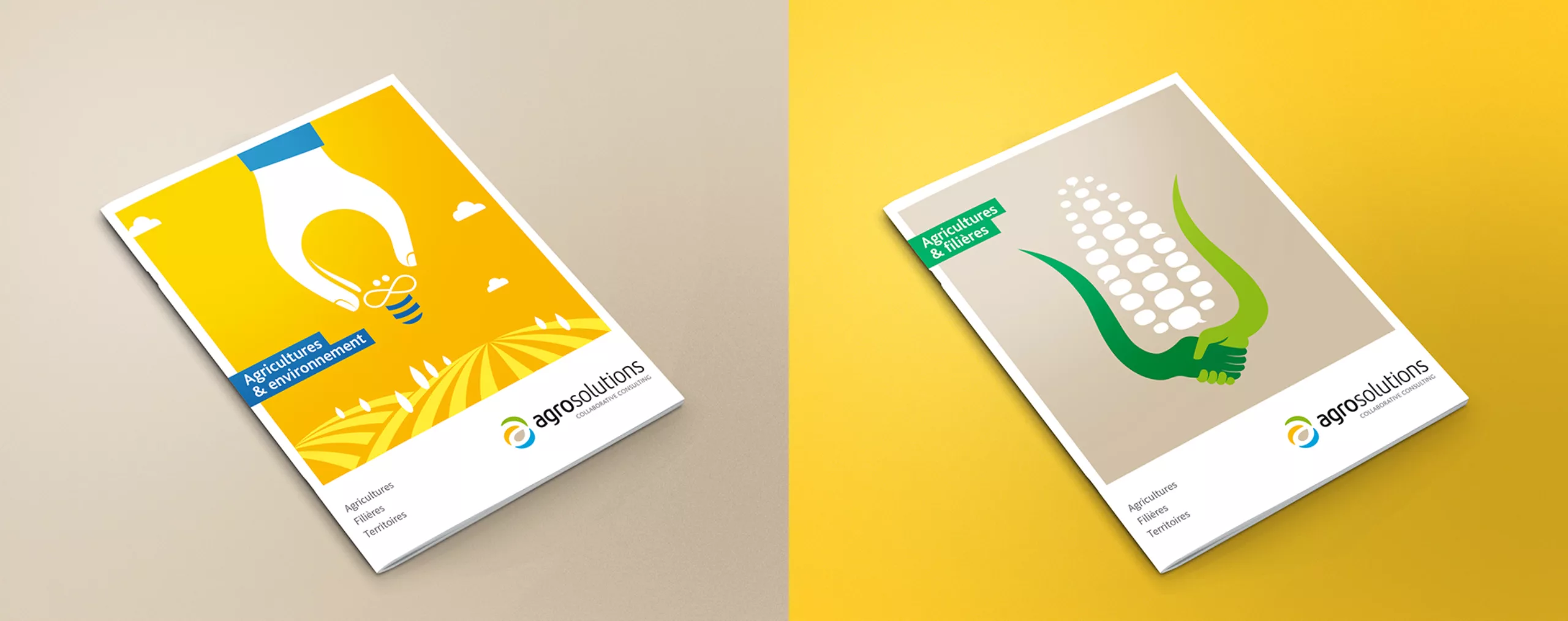 La création du nouveau logotype Agrosolutions permet à la filiale d’affirmer son identité propre ainsi que son positionnement au sein du pôle agriculture du groupe Invivo. Cet emblème symbolise l’articulation de ses 3 domaines d’intervention : Agricultures / Filières / Territoires, réunis autour de son socle de compétences. Prenant la forme de trois segments courbes et arrondies, ils s’organisent dans une composition en spirale, dont le mouvement évoque l’idée de développement et de croissance. La spirale rappelle aussi le dessin de la lettre «a» en miniscule qui est l’initiale du mot «Agrosolutions».