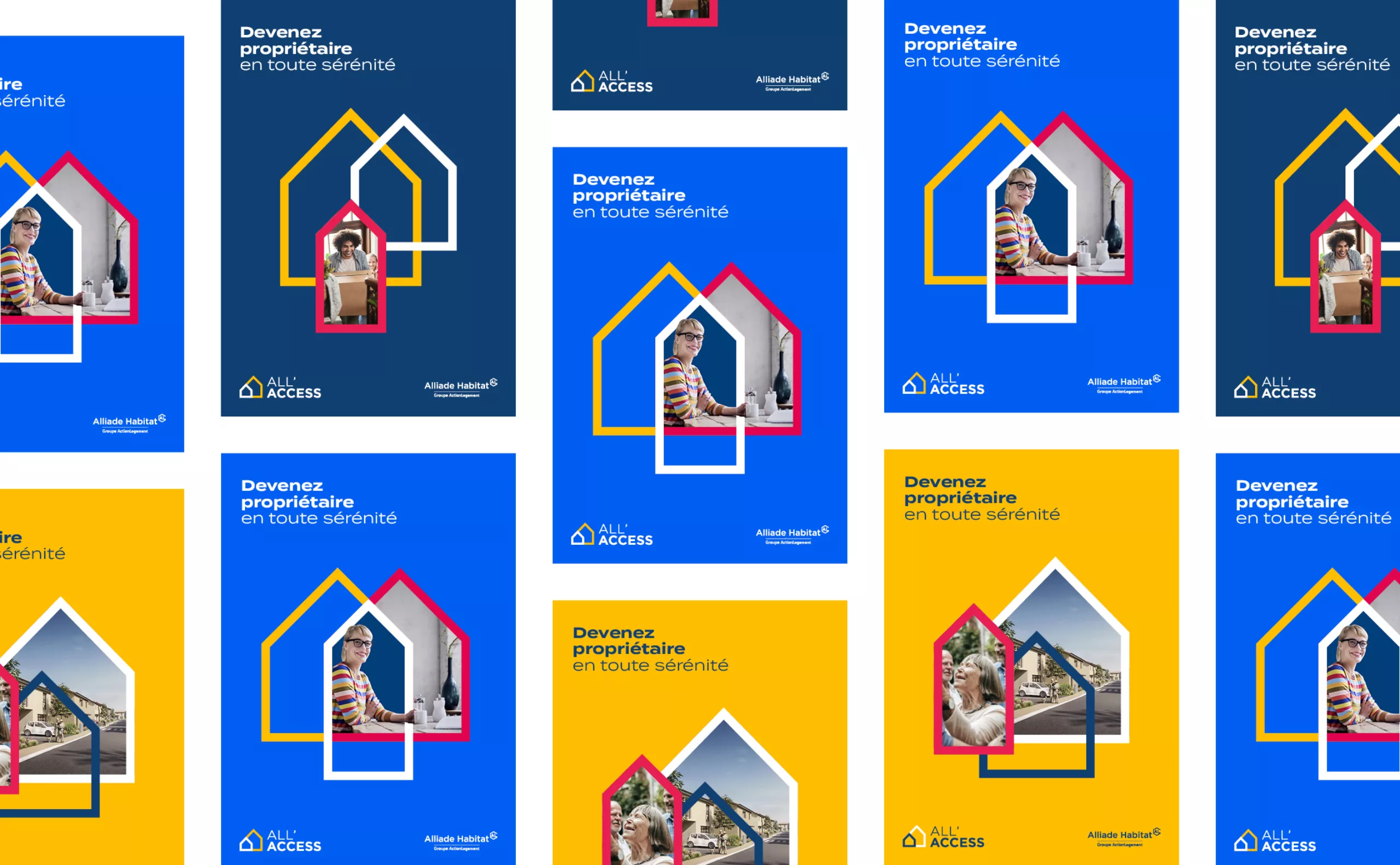 Nous avons été commandités par Alliade Habitat, filiale du groupe Action logement, premier bailleur social de la région Auvergne-Rhône-Alpes, pour accompagner leur marque All’access dans la création de son identité visuelle. All’ Access œuvre pour l’accès à la propriété des salariés et ménages modestes, en proposant à la vente des logements de qualité, à prix inférieurs à ceux du marché dans les zones attractives de la région, avec un accompagnement de proximité pour un projet sécurisé. L’accession sociale s’inscrit donc dans le parcours résidentiel des locataires. Les locataires sont informés avant chaque lancement commercial des futures opérations. La communication est développée à leur intention. Afin d’assurer le développement de la marque et lui insuffler une force nouvelle, nous avons défini en étroite collaboration avec les équipes un territoire de marque frais et dynamique. Le souhait étant de pallier à un manque de notoriété et d’outiller les équipes en outils de communication performants. L’ensemble devait s’inscrire en cohérence avec l’identité graphique de la marque mère d’Alliade Habitat.