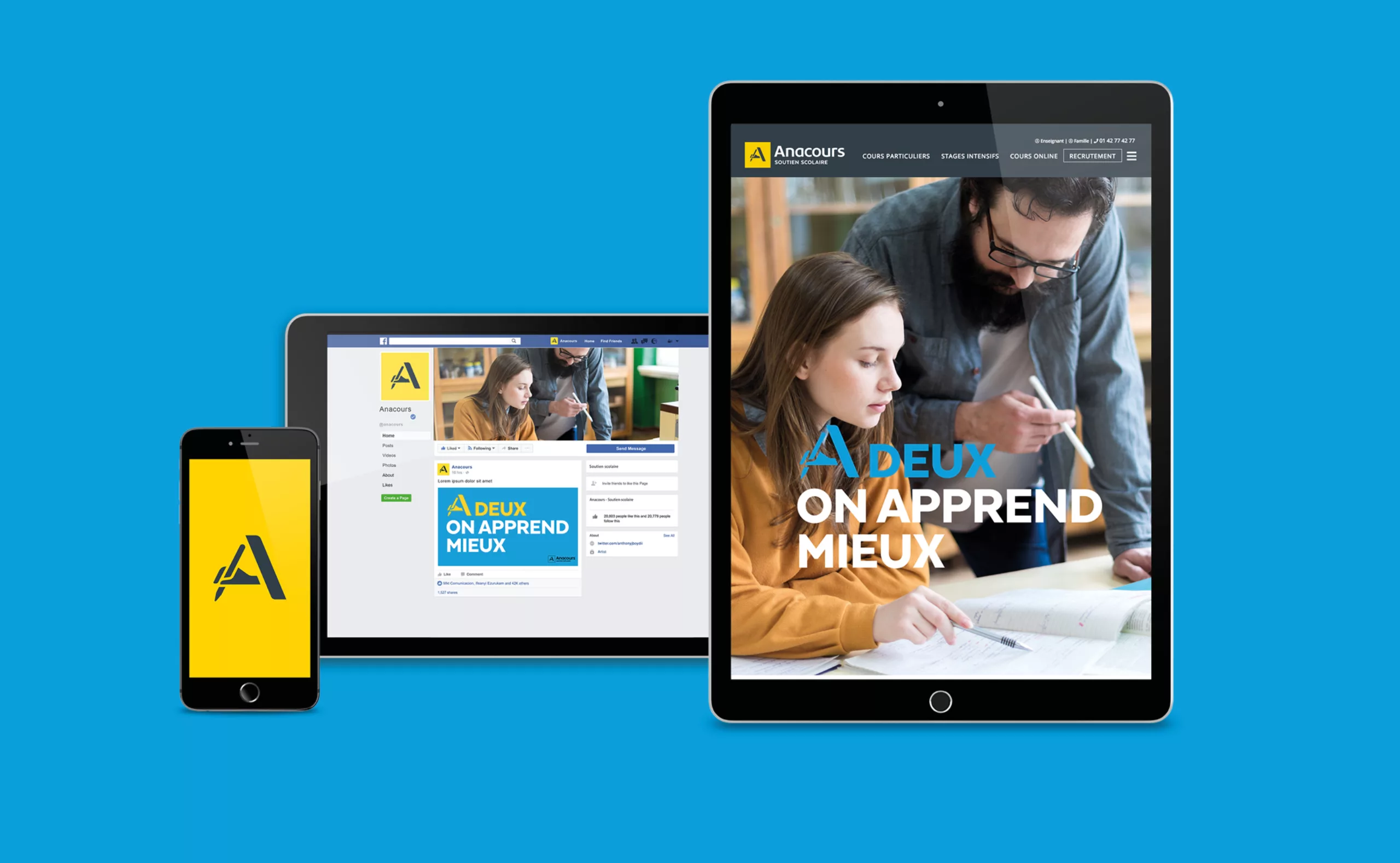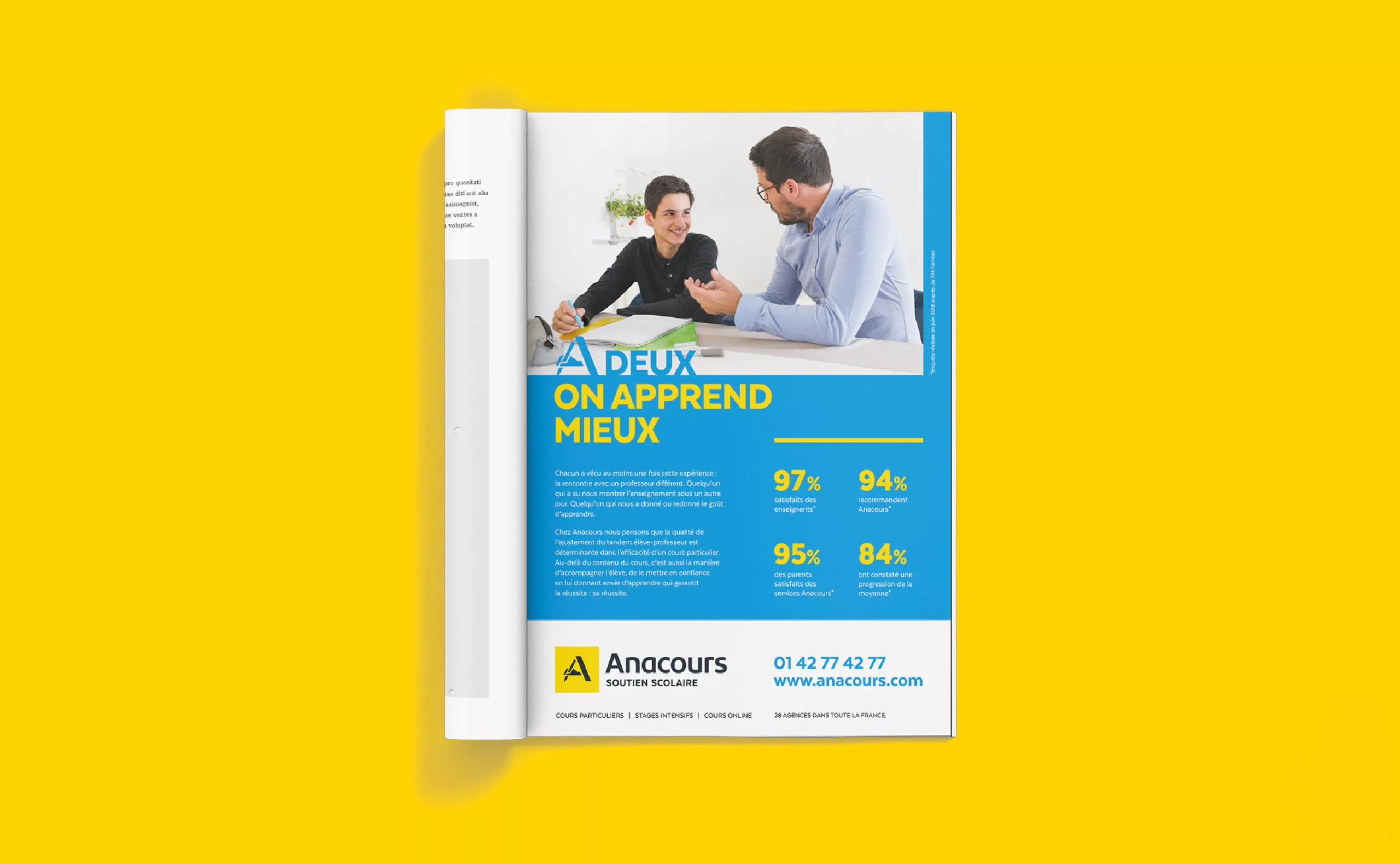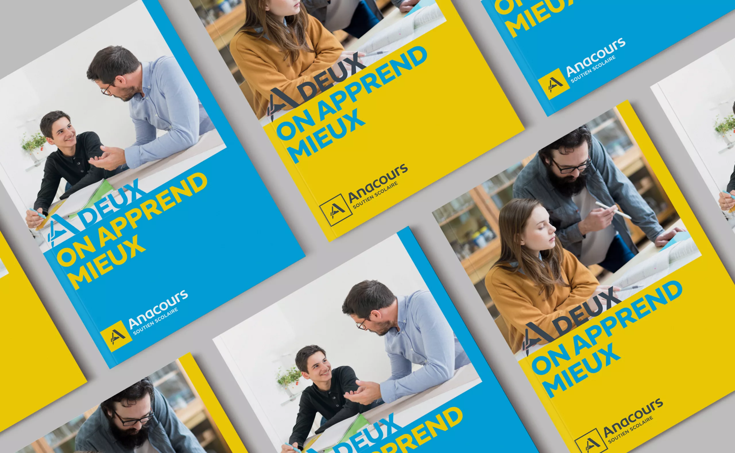 Pour la rentrée 2018, Graphéine a accompagné le groupe Anacours, spécialiste du soutien scolaire depuis 1999, dans la refonte de son identité de marque. Cette évolution renforce la visibilité et la lisibilité de la franchise Anacours pour lui permettre de se singulariser dans l’univers très concurrentiel du soutien scolaire.