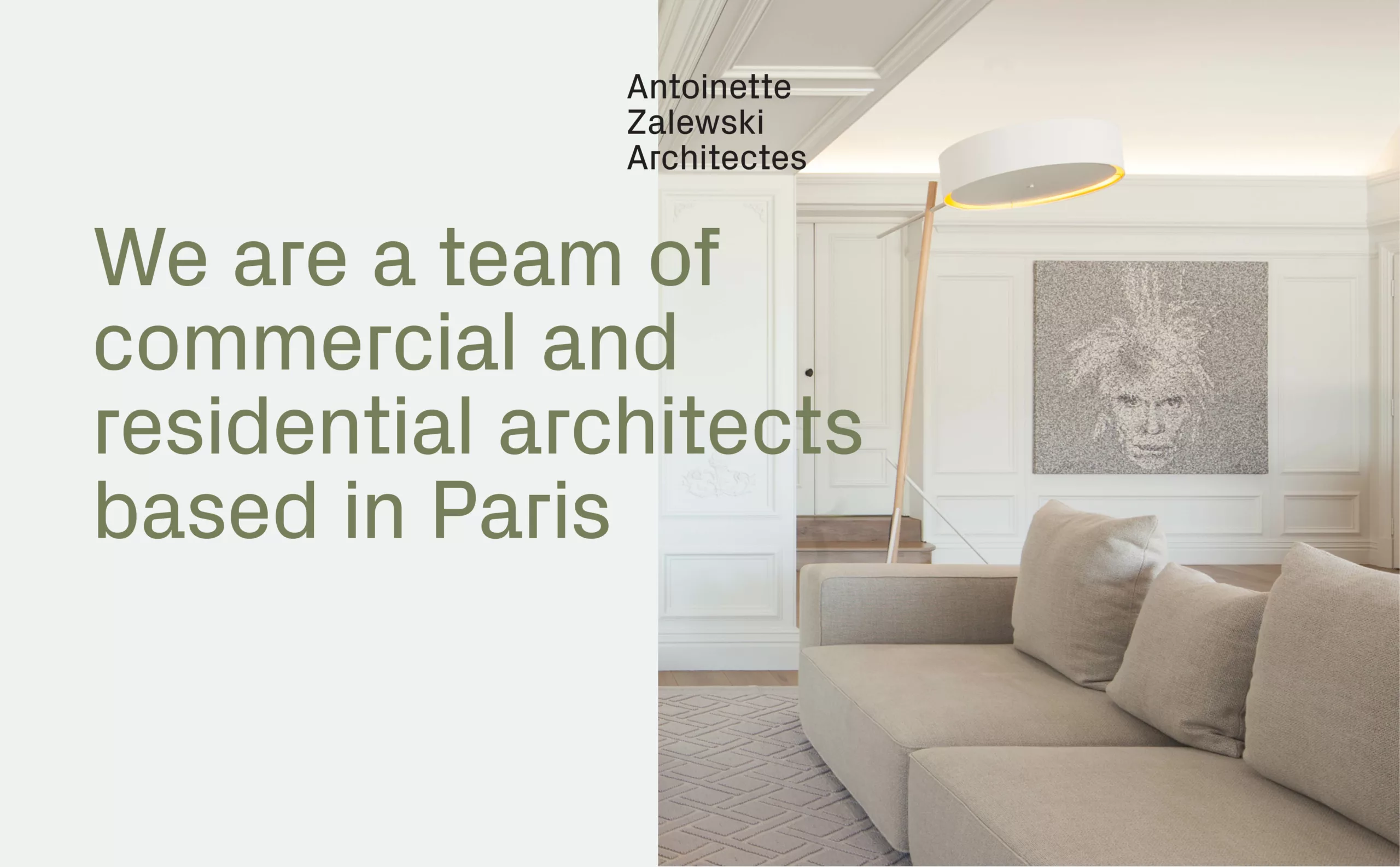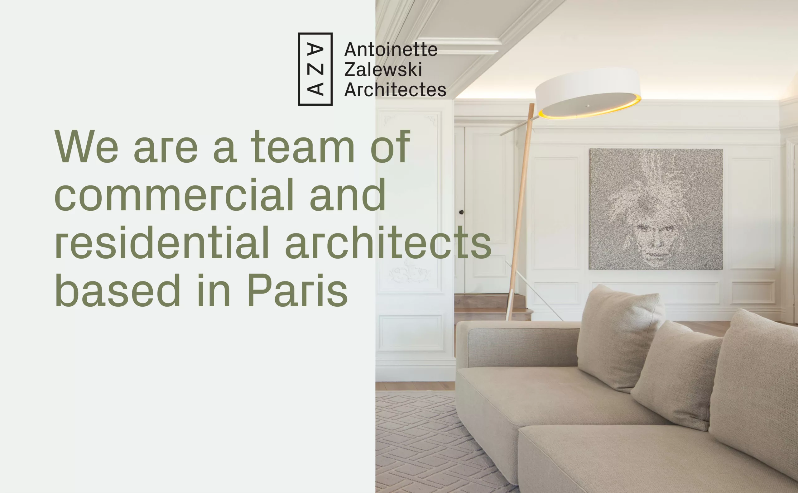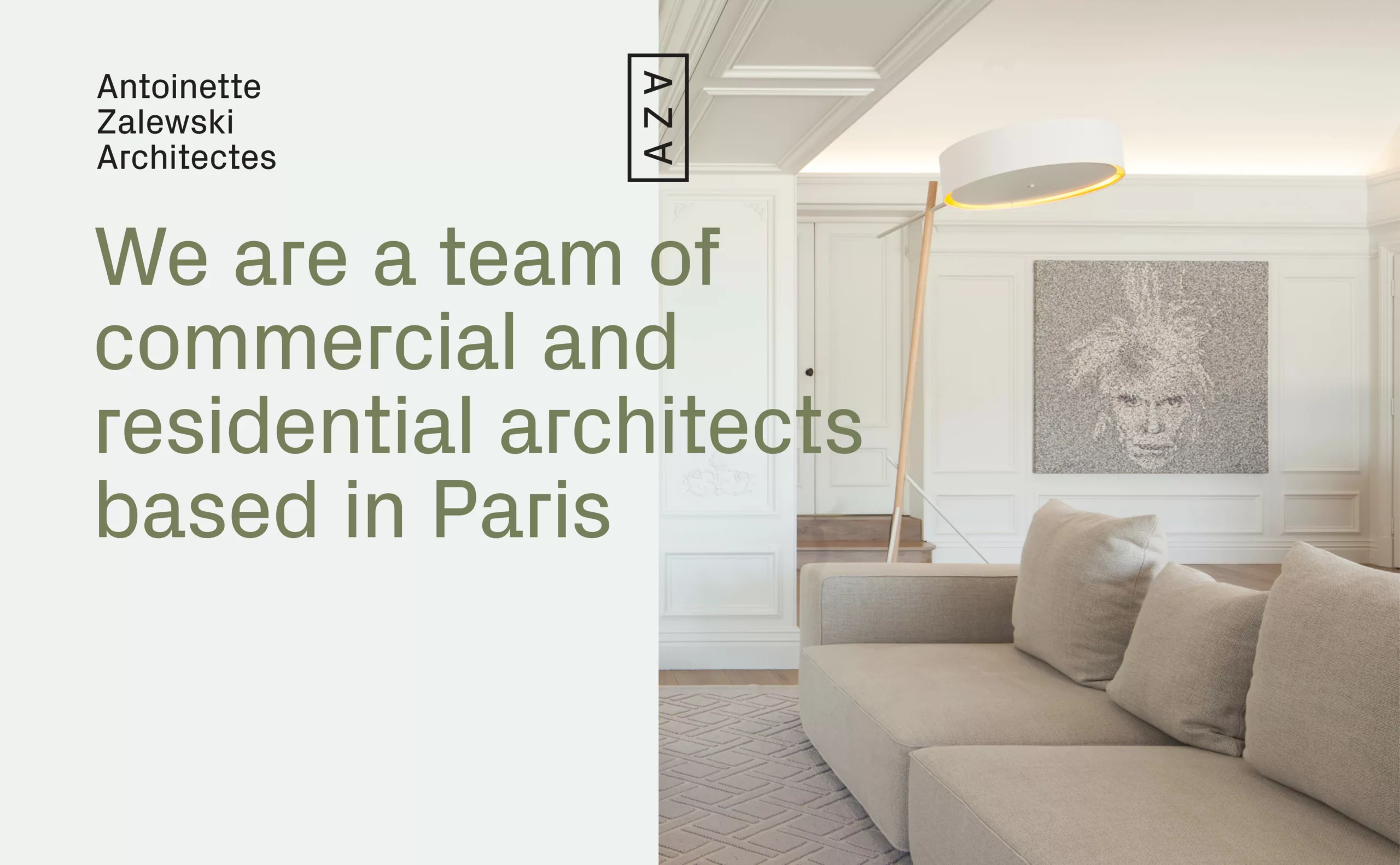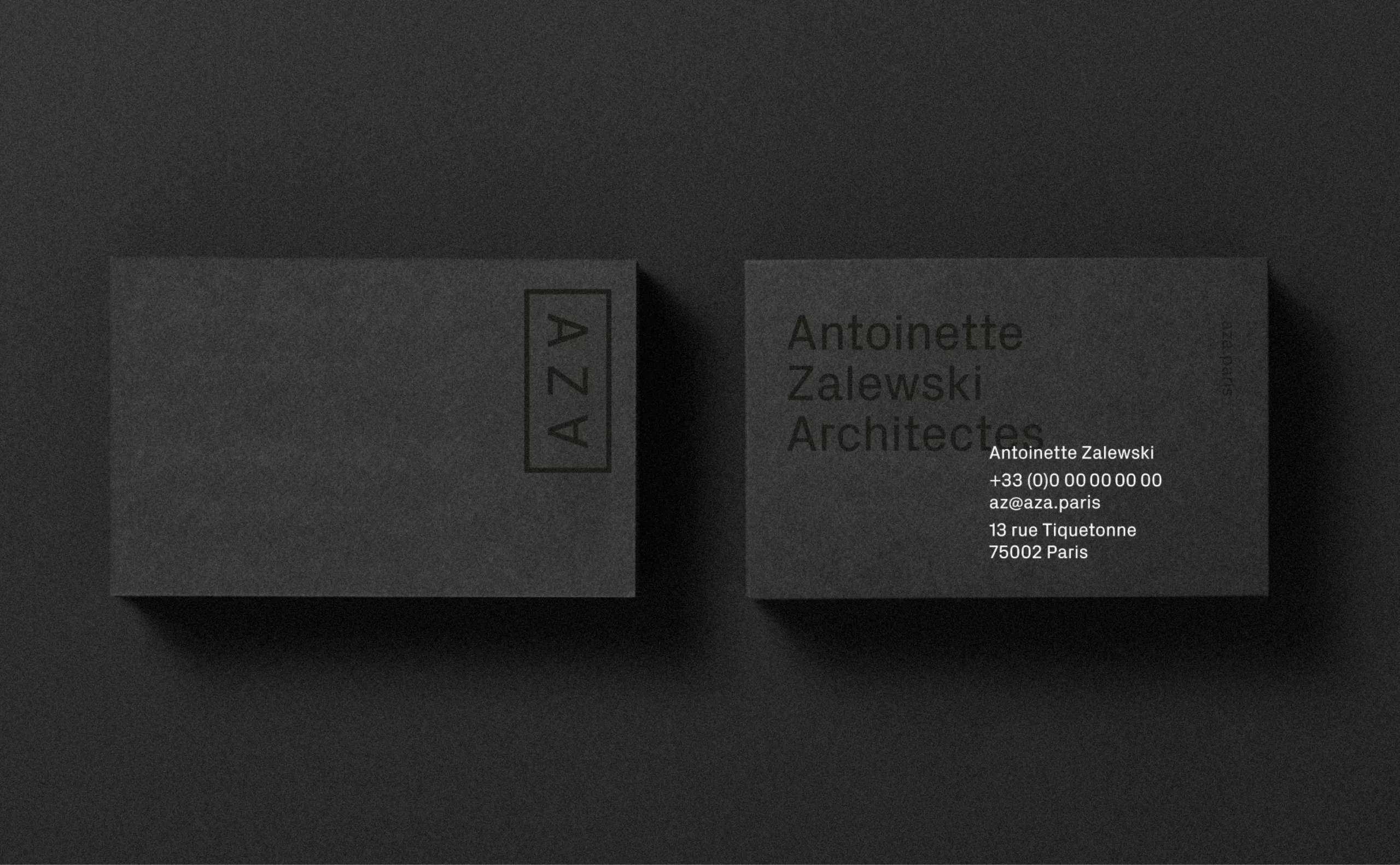 Lorsque nous sommes missionnés, l’agence porte l’acronyme AZ en référence à sa fondatrice, Antoinette Zalewski. Un premier audit, nous a amené a suggéré une évolution de son nom : AZA pour Antoinette Zalewski Architectes. La mention « Architectes » reflète l’ambition et la croissance de l’agence désormais portée par une dizaine de collaborateurs.