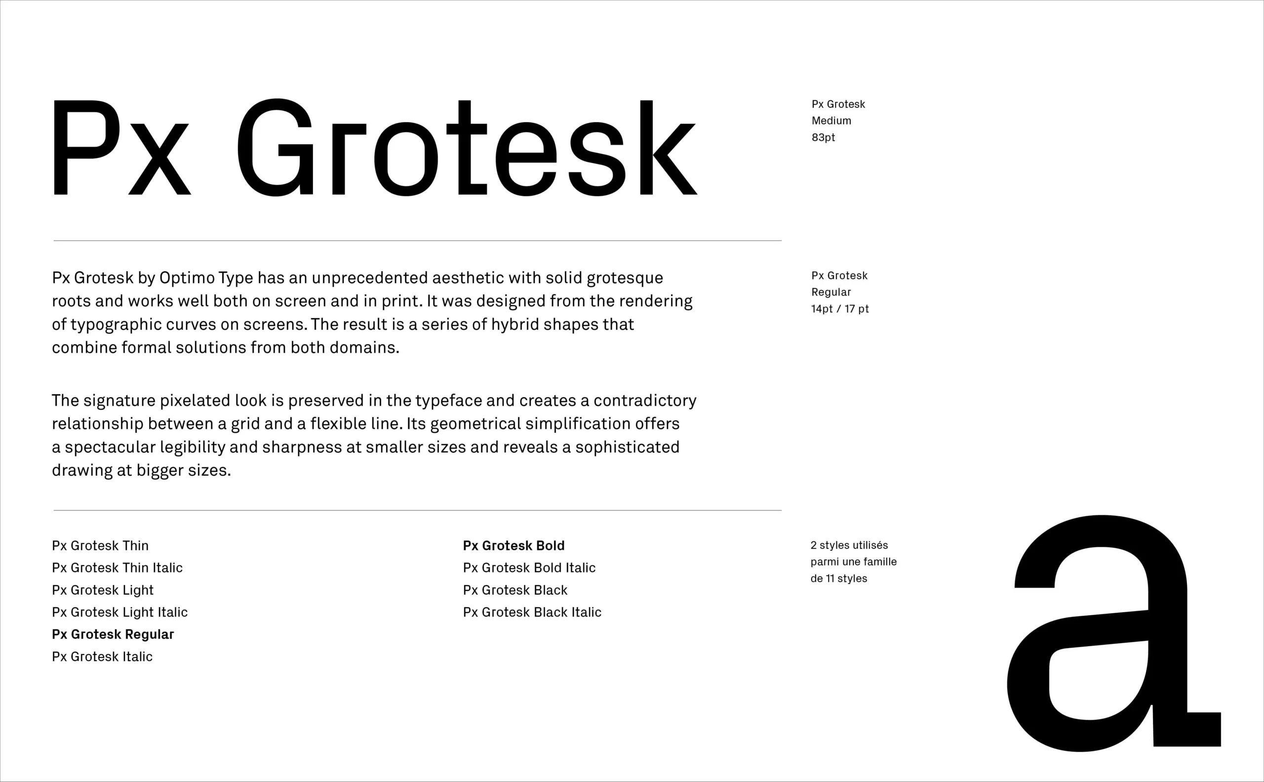 Le choix de la typographie Px Grotesk est, lui aussi, un clin d’oeil au secteur d’activité du cabinet. Le dessin de caractères géométrique et anguleux incarne la technicité du métier d’architecte, et notamment de ses outils : l’équerre, le plan d’architecture… Le tout dans un tracé typographique esthétique et sophistiqué. L’identité visuelle imaginée est caractérisée par sa sobriété et son intemporalité, des détails cohérents avec le positionnement du cabinet AZA.